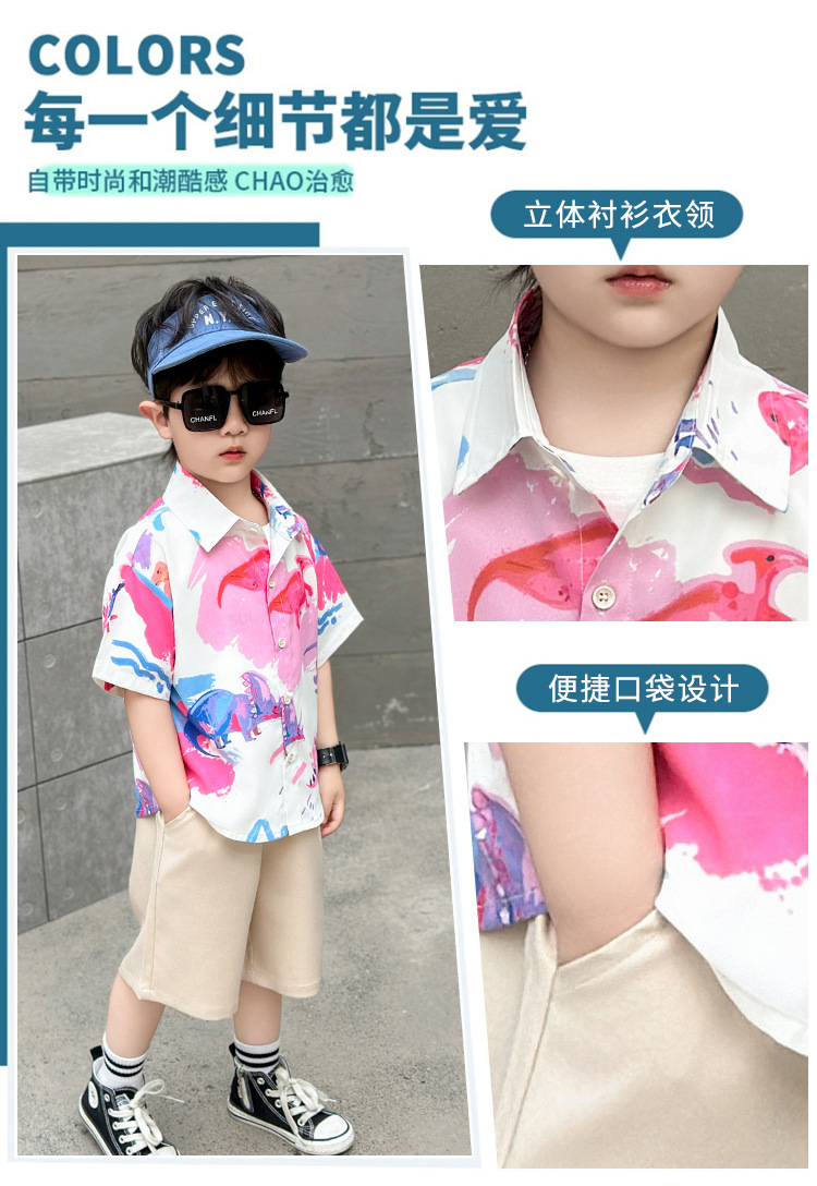 소년의 꽃 셔츠 반팔 세트 2025 년 여름 새로운 어린이 서양식 공룡 옷 아기 잘 생긴 투피스 세트