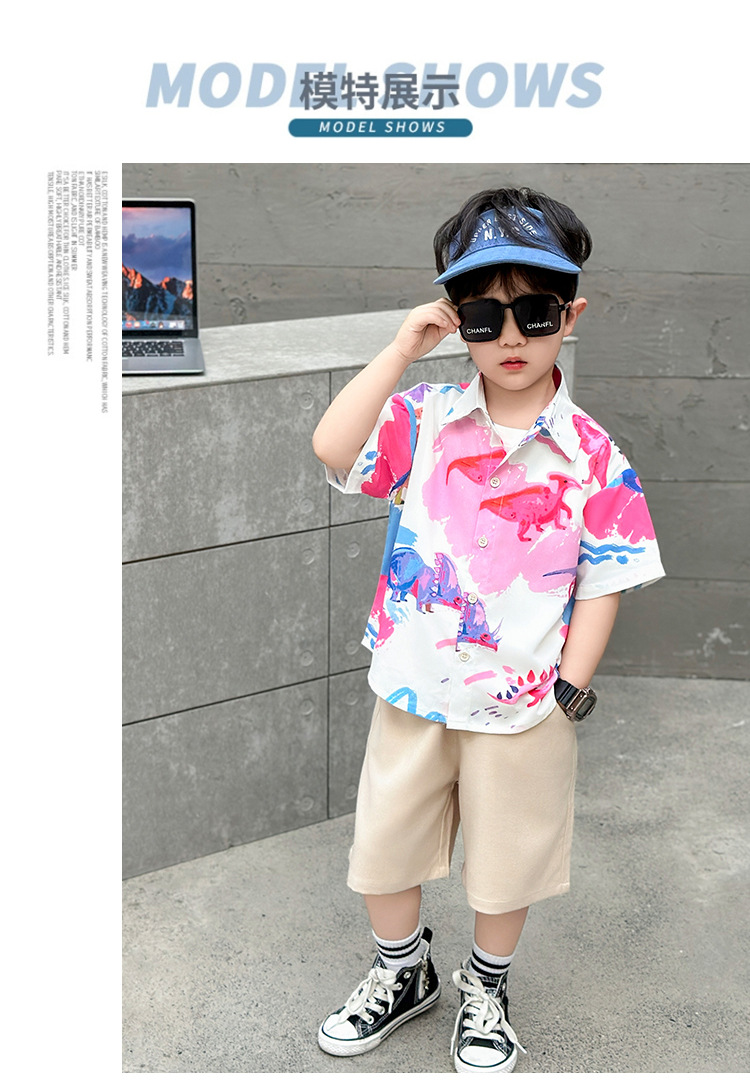 소년의 꽃 셔츠 반팔 세트 2025 년 여름 새로운 어린이 서양식 공룡 옷 아기 잘 생긴 투피스 세트스토어 가기