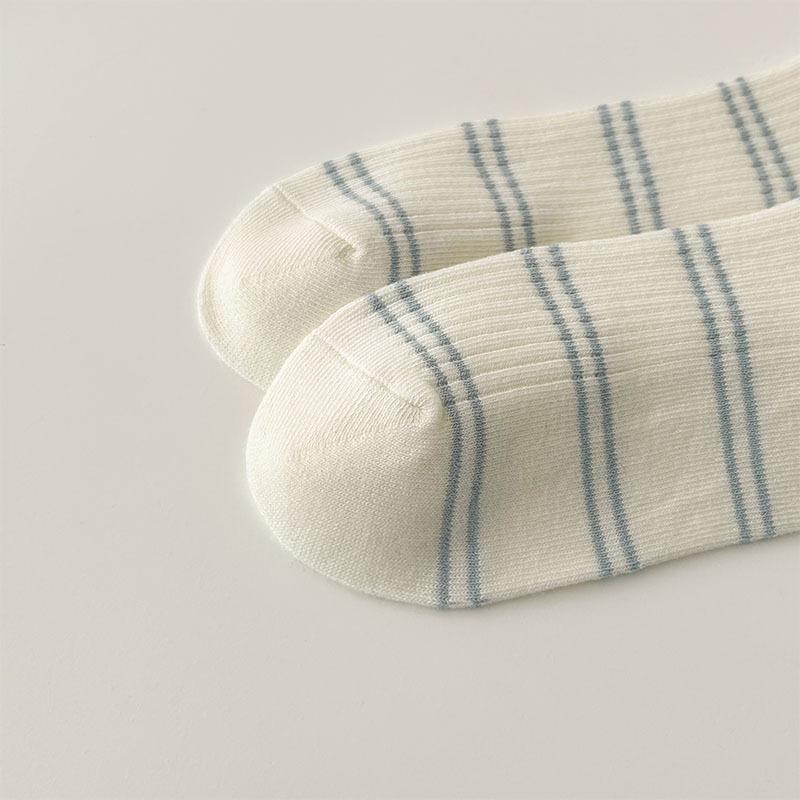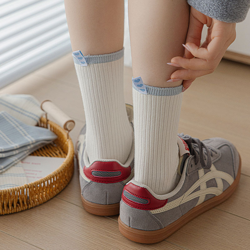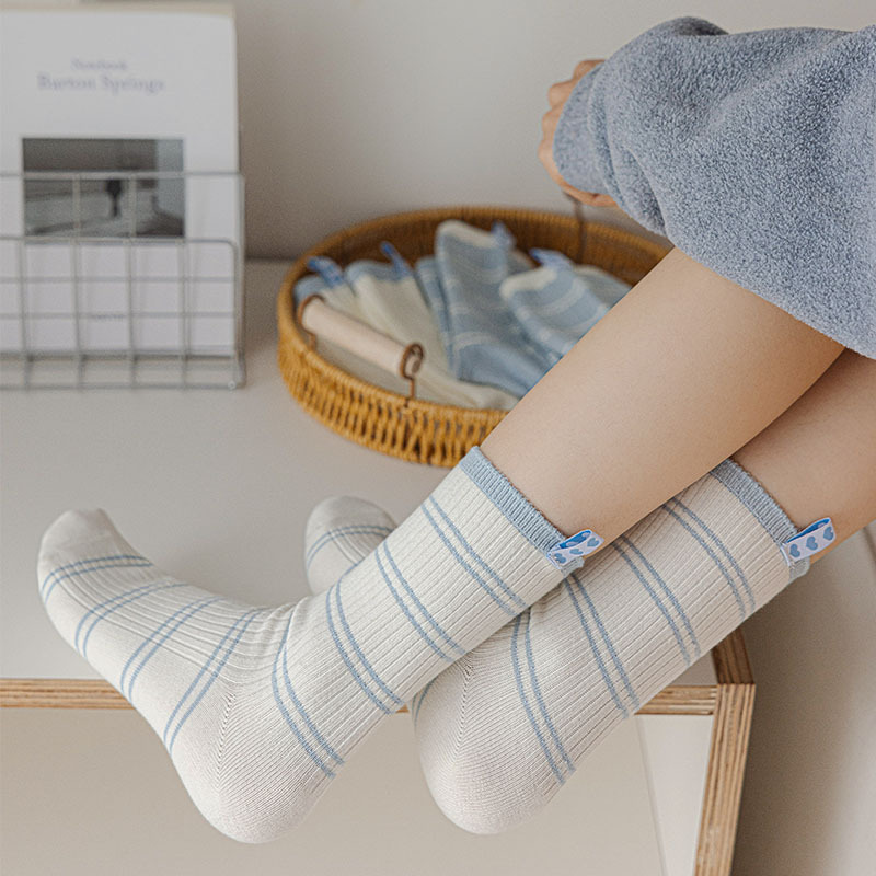작은 신선한 파란색과 흰색 바느질 양말 여성용 Ins 스타일 달콤한 사랑 천 라벨 중간 양말 봄 여름 올 매치 스포츠 스타일스토어 가기