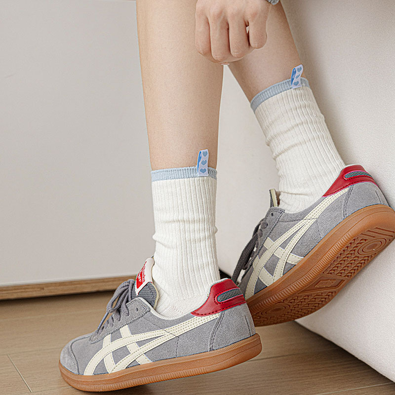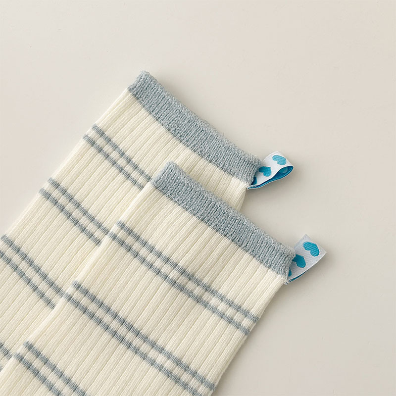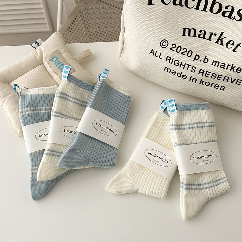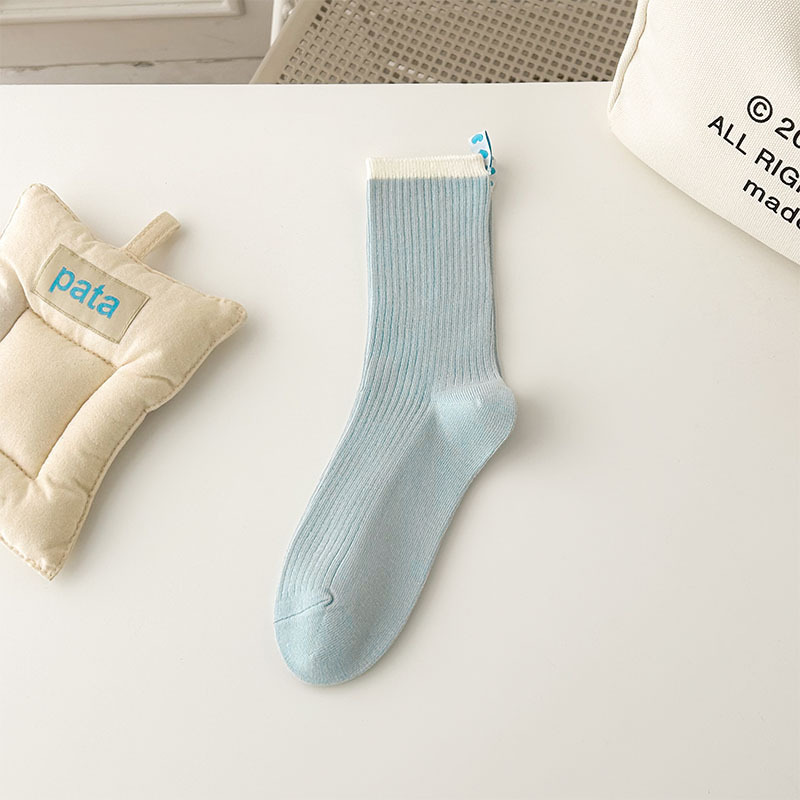작은 신선한 파란색과 흰색 바느질 양말 여성용 Ins 스타일 달콤한 사랑 천 라벨 중간 양말 봄 여름 올 매치 스포츠 스타일