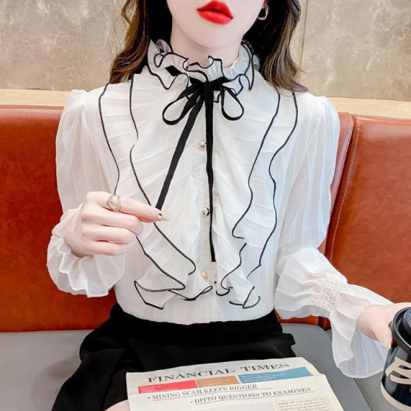 2025 봄과 가을 새로운 귀 화이트 셔츠 디자인 스타일 긴 소매 프랑스 연꽃 잎 셔츠 탑스토어 가기