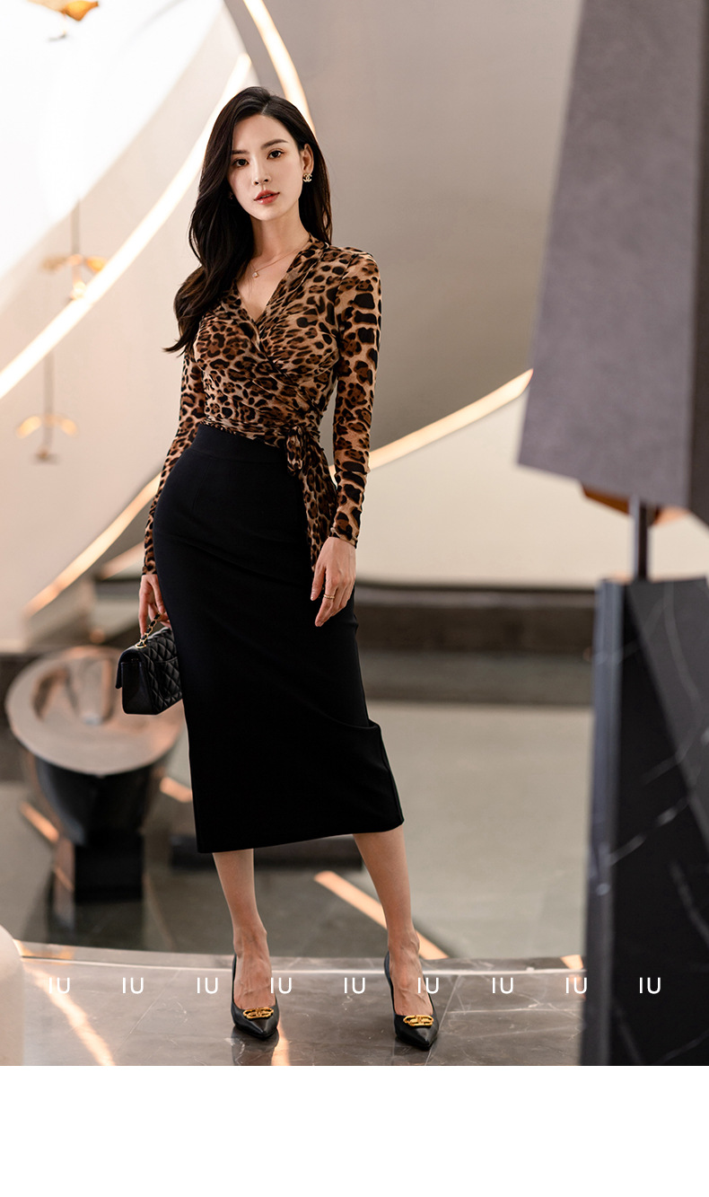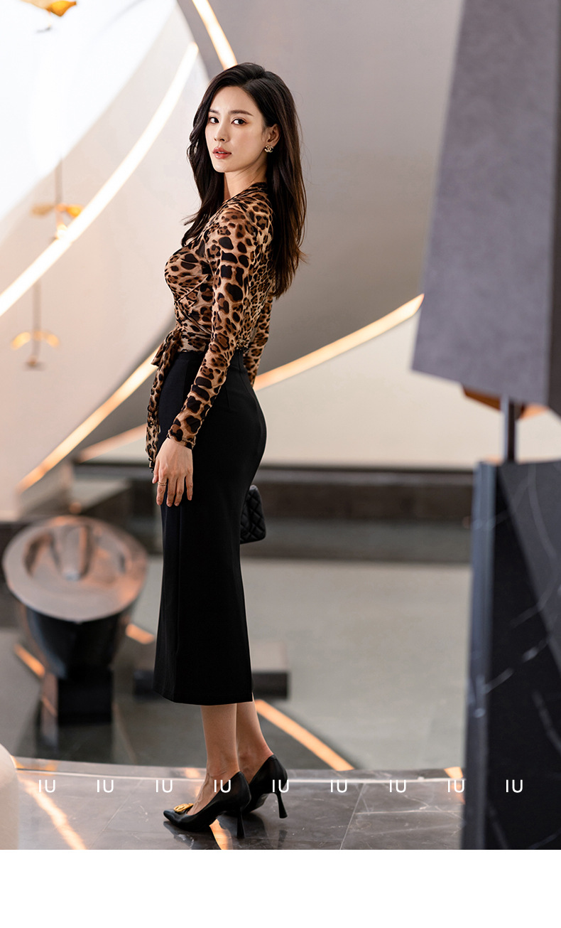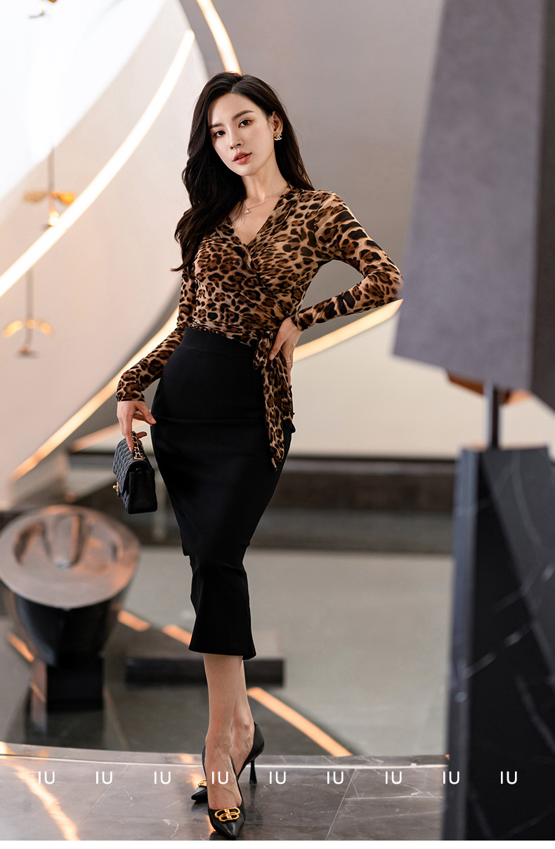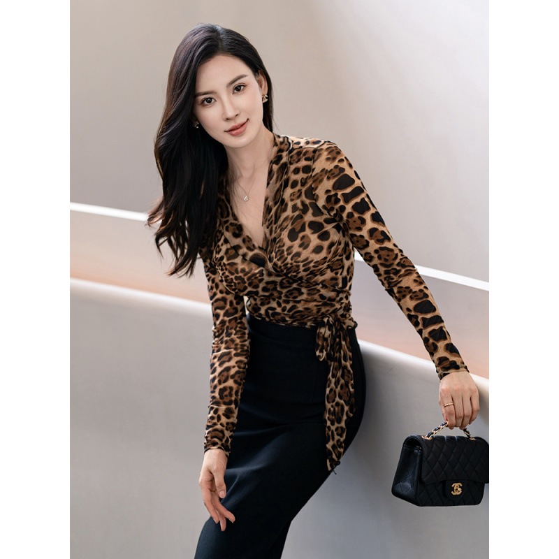 여성을위한 긴 소매 슬림 핏 메쉬 기본 셔츠와 레오파드 무늬 슬림 핏 순수한 욕망 탑스토어 가기