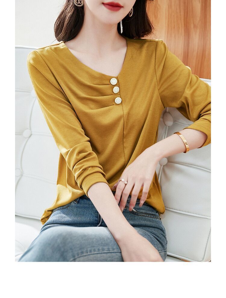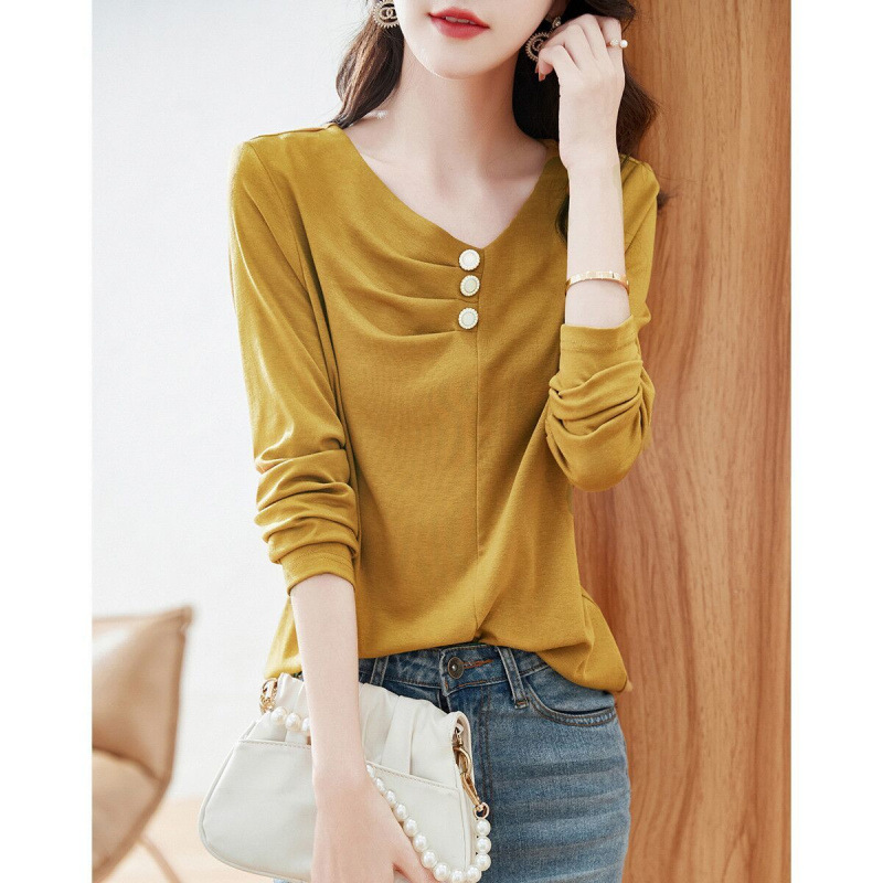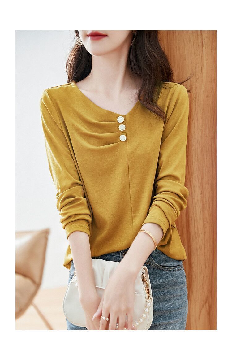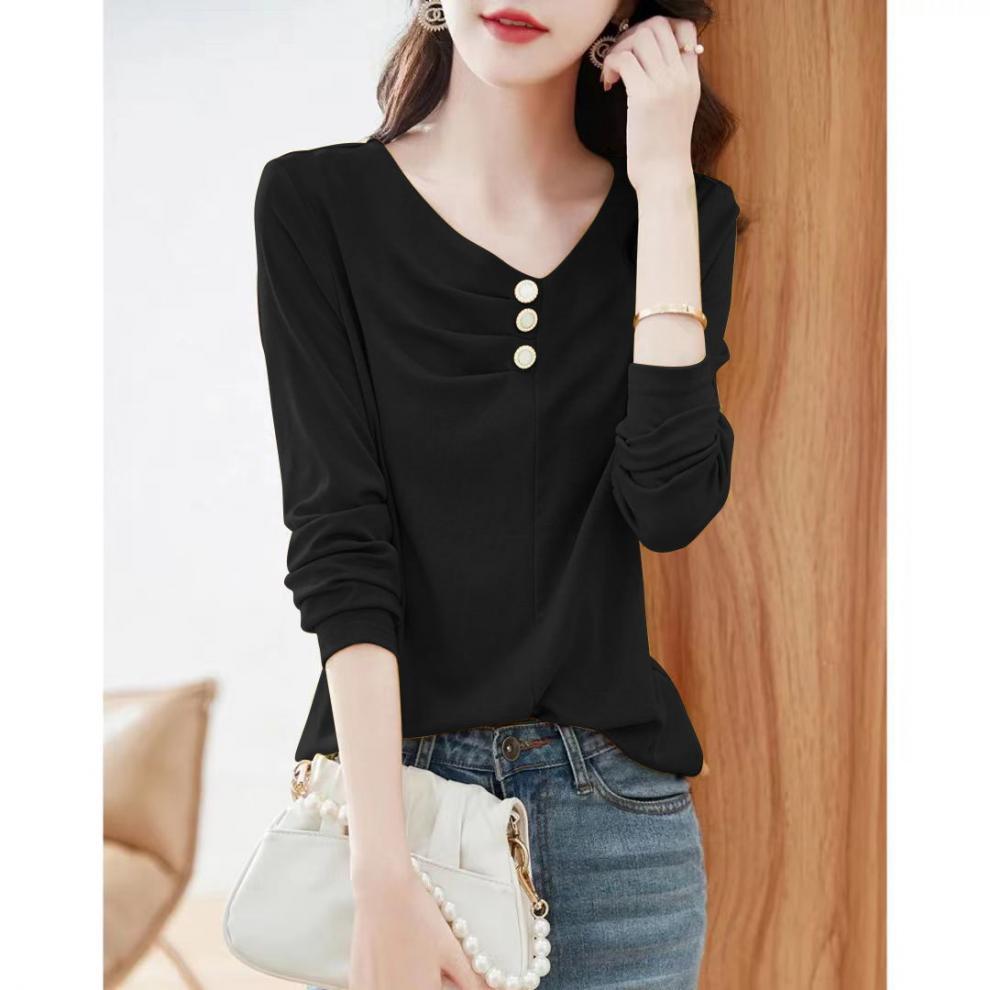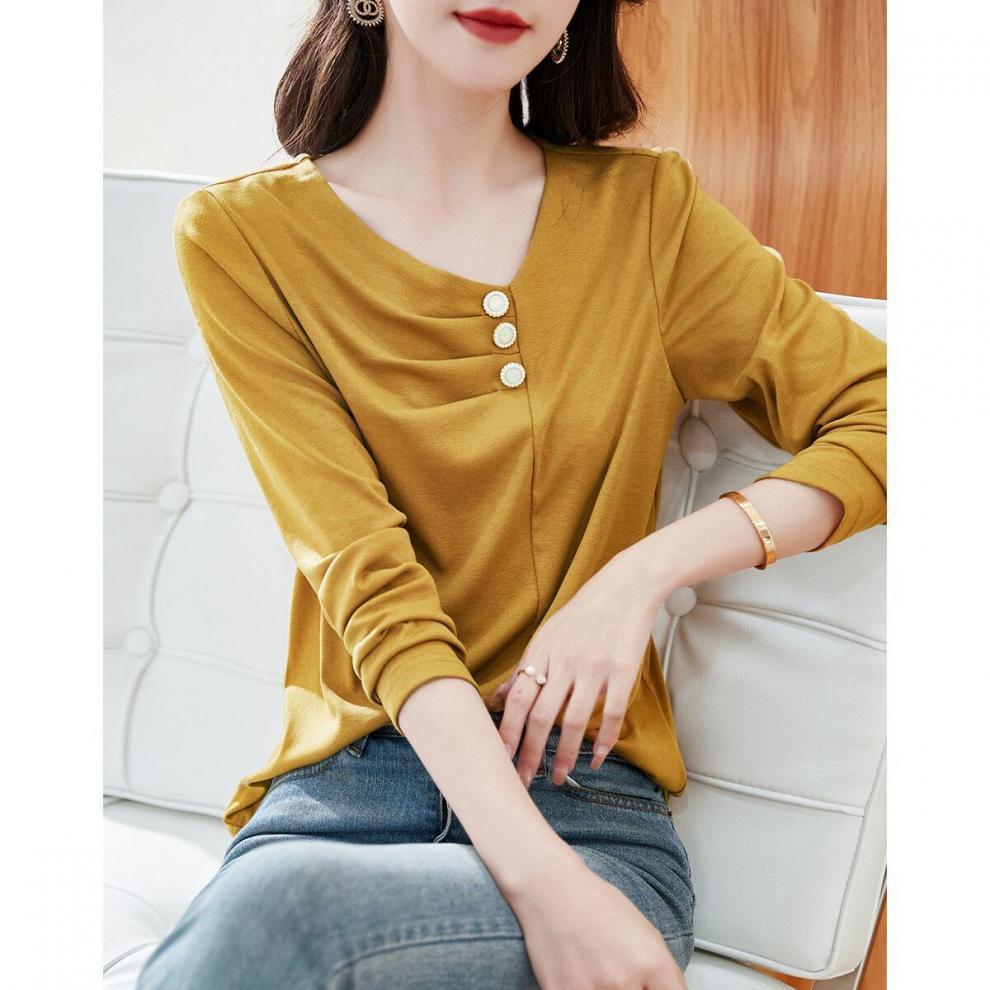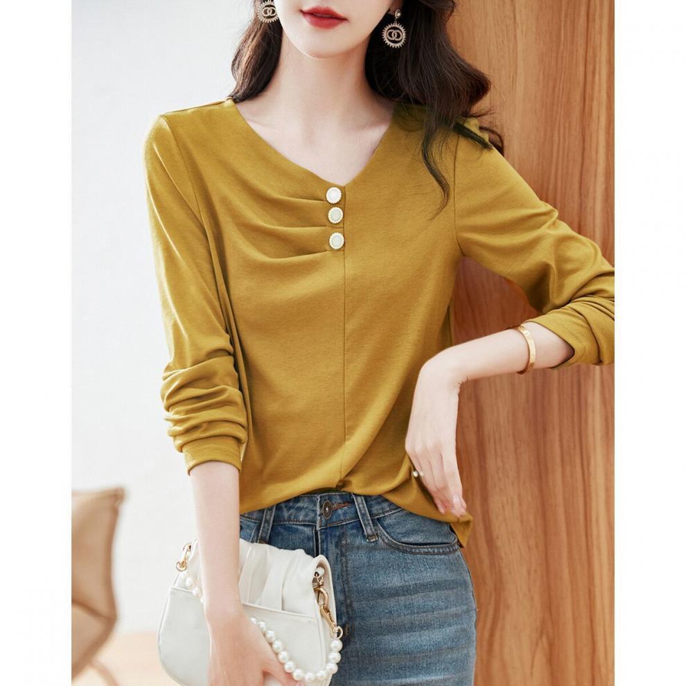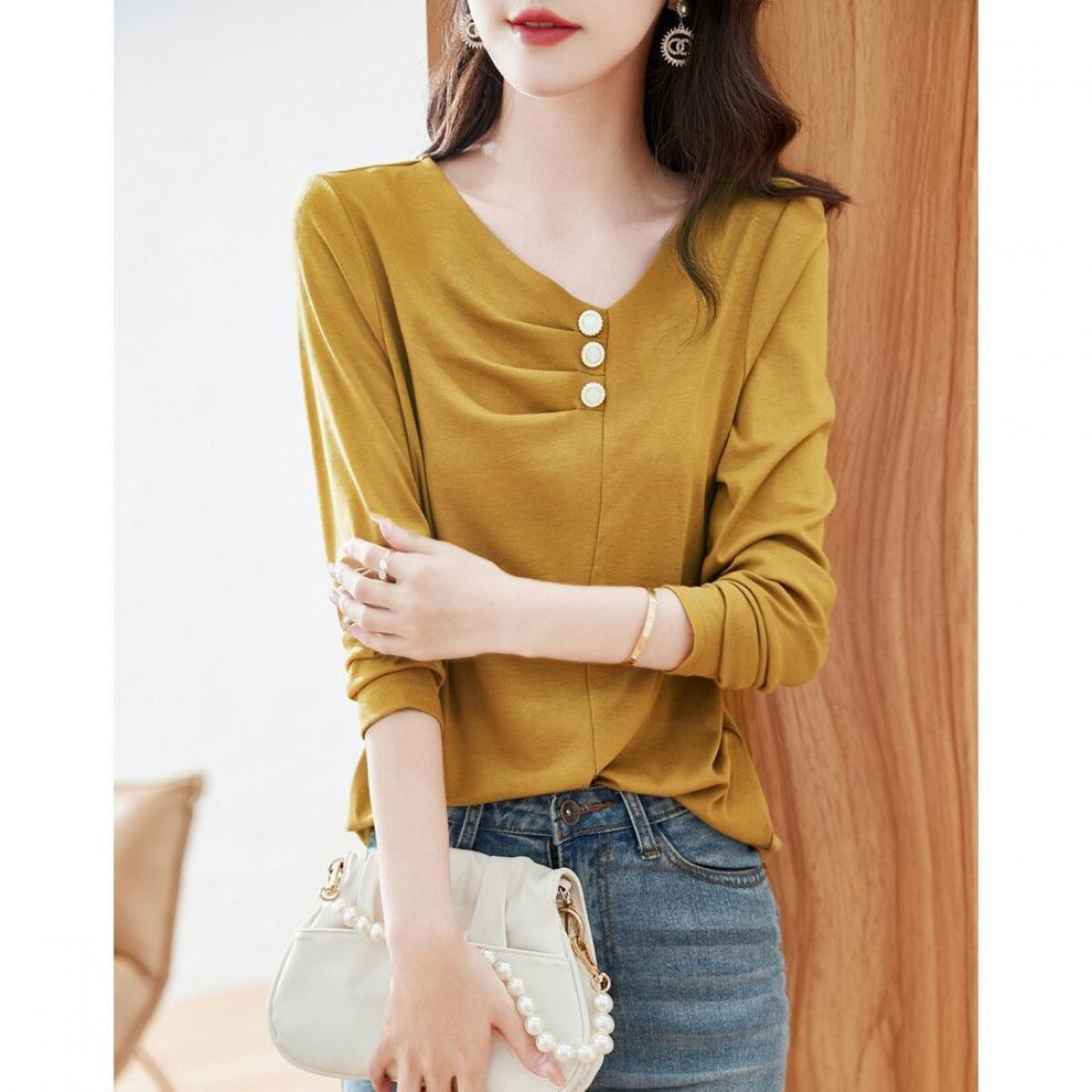 가을 새로운 한국 스타일 유행 간단한 티셔츠 주름 디자인 V-목 긴 소매 짧은 올 매치 슬림베이스 티셔츠스토어 가기