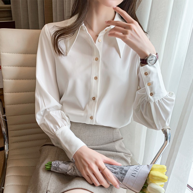 재고 리얼 샷 2025 새틴 화이트 셔츠 디자인 센스 니차 메탈릭 우아한 통근 웨스턴 스타일 쉬폰 셔츠스토어 가기