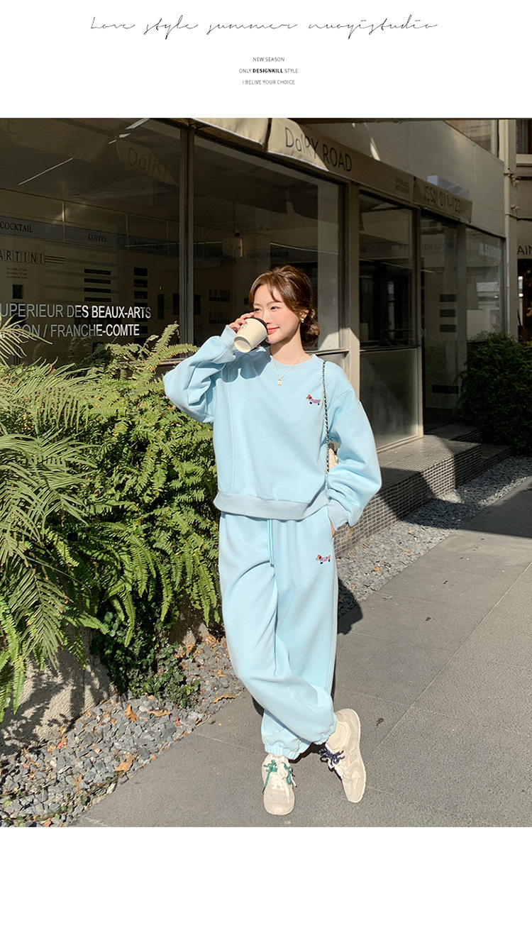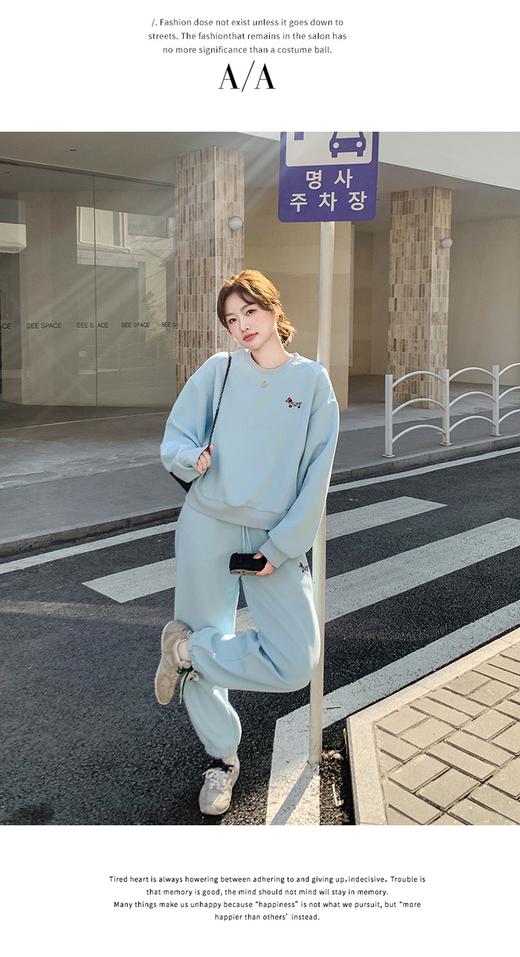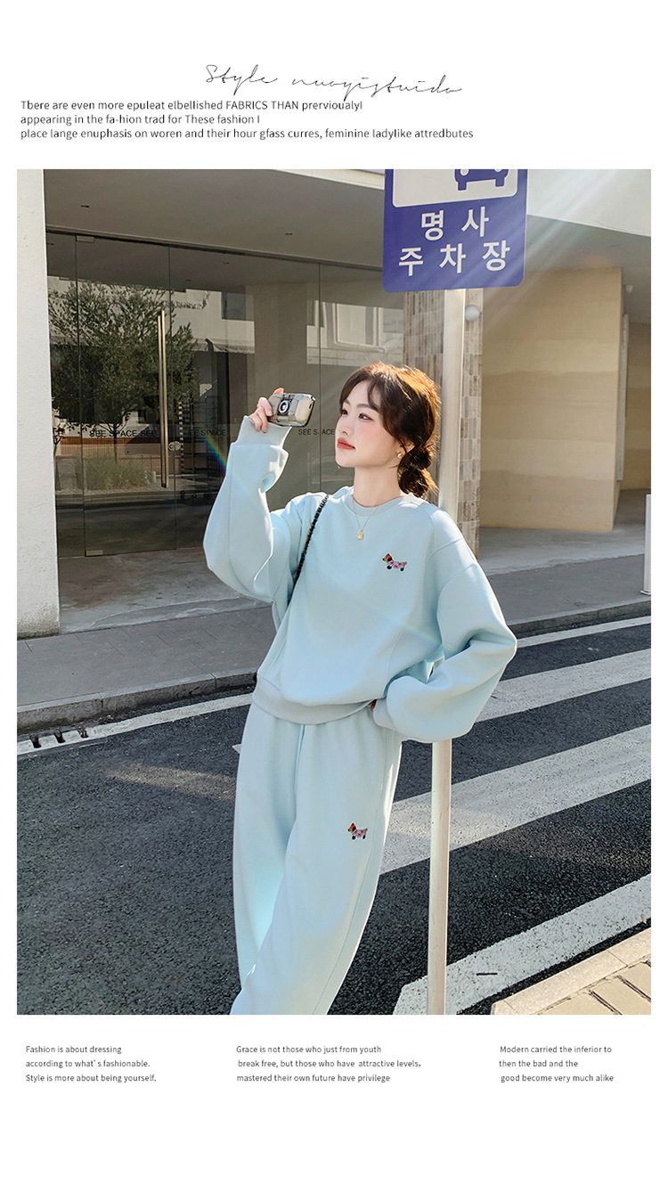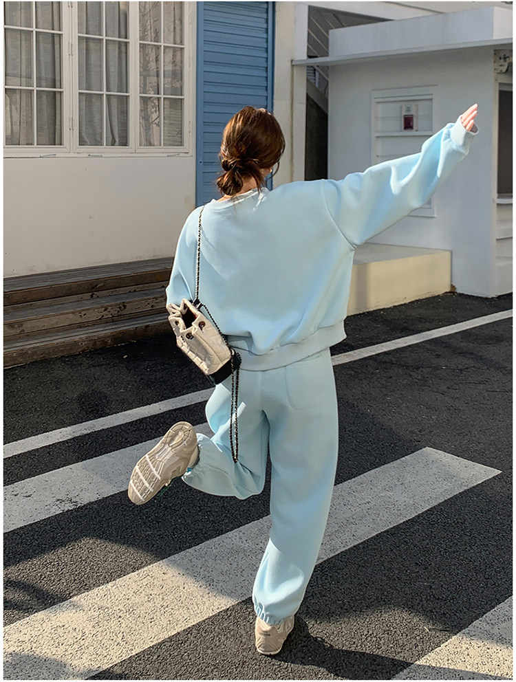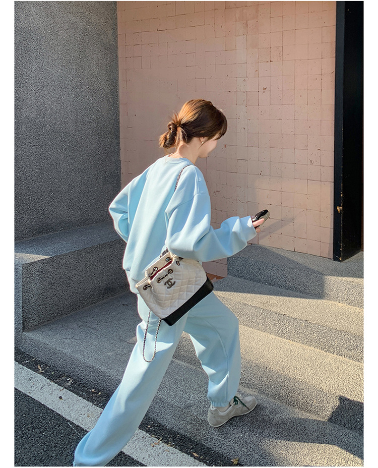 봄은 파란 스웨터 세트를 입고 세트 여성의 느슨한 슬리밍 슈퍼 잘 생긴 스포츠 스타일 발목 바지 투피스 세트스토어 가기