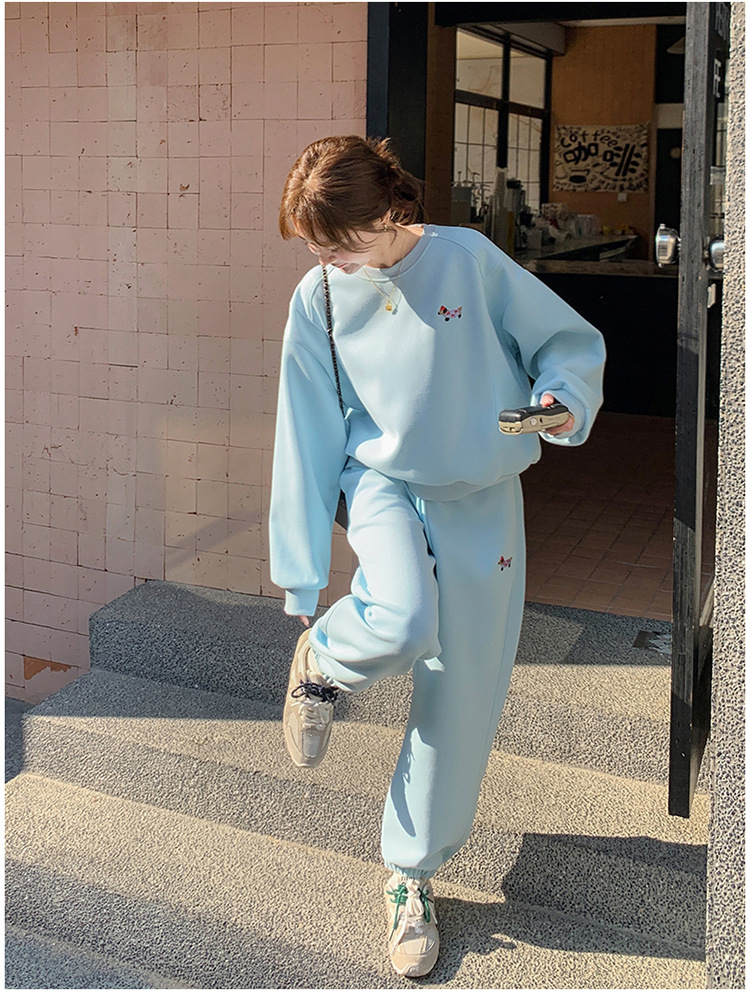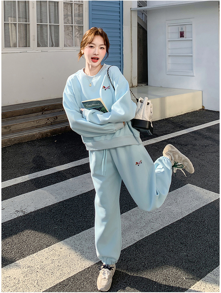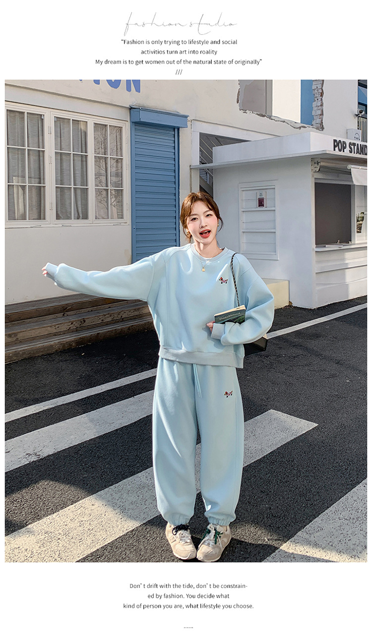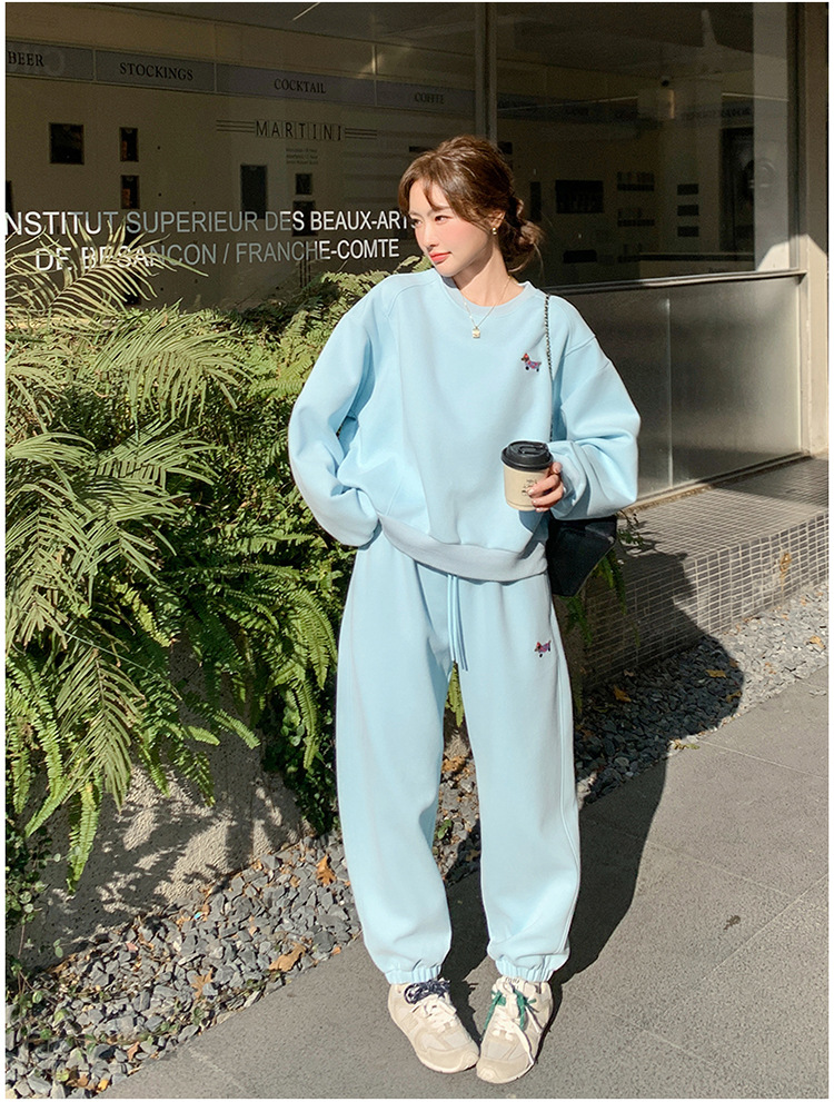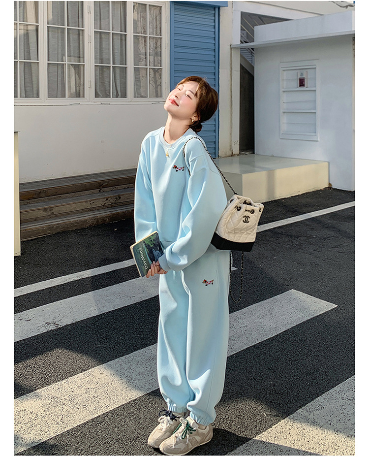 봄은 파란 스웨터 세트를 입고 세트 여성의 느슨한 슬리밍 슈퍼 잘 생긴 스포츠 스타일 발목 바지 투피스 세트스토어 가기