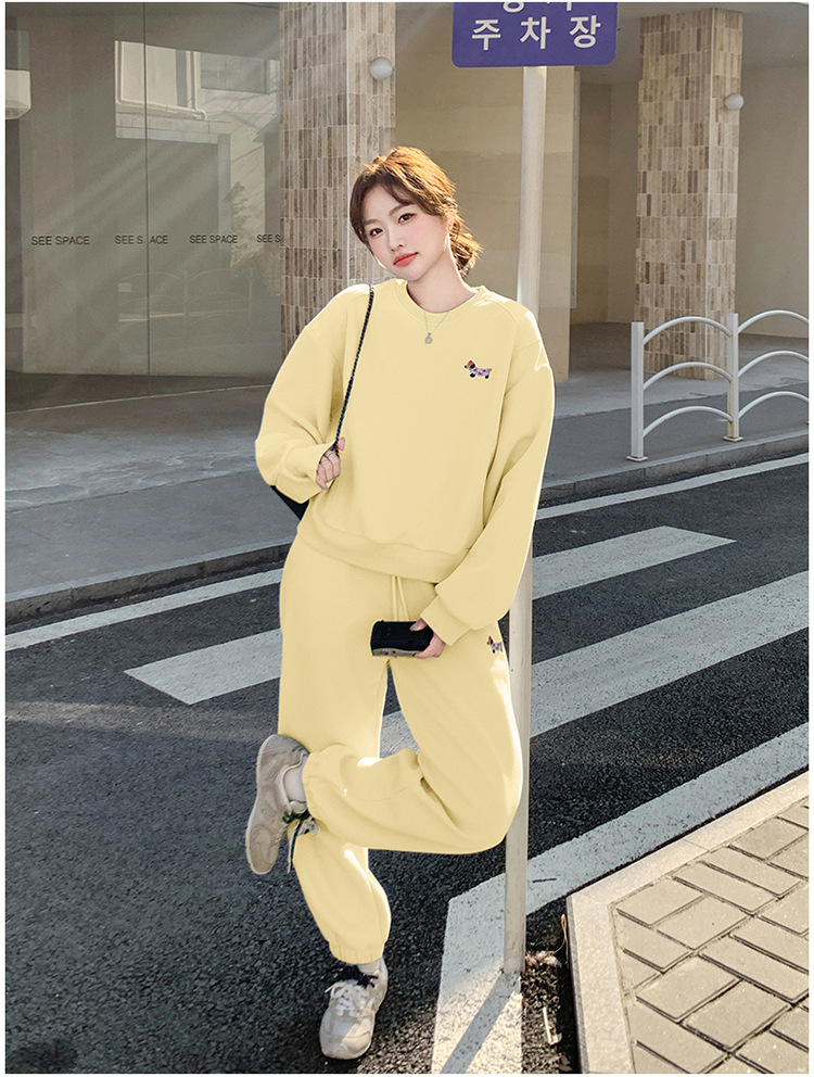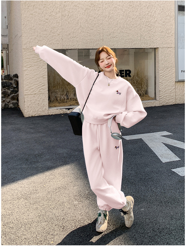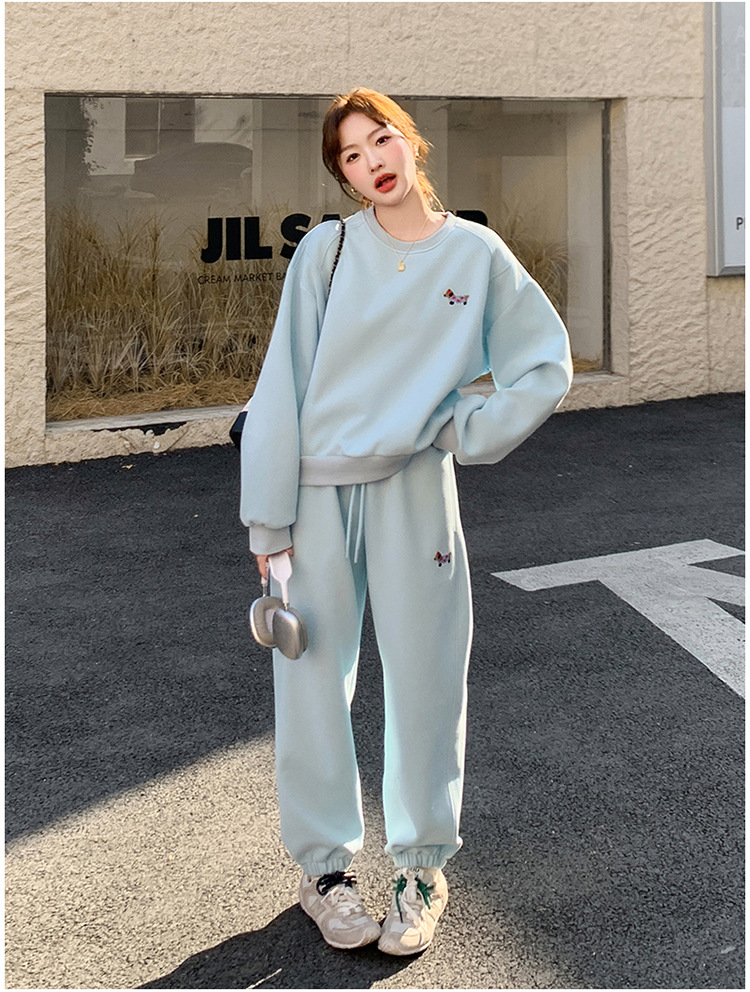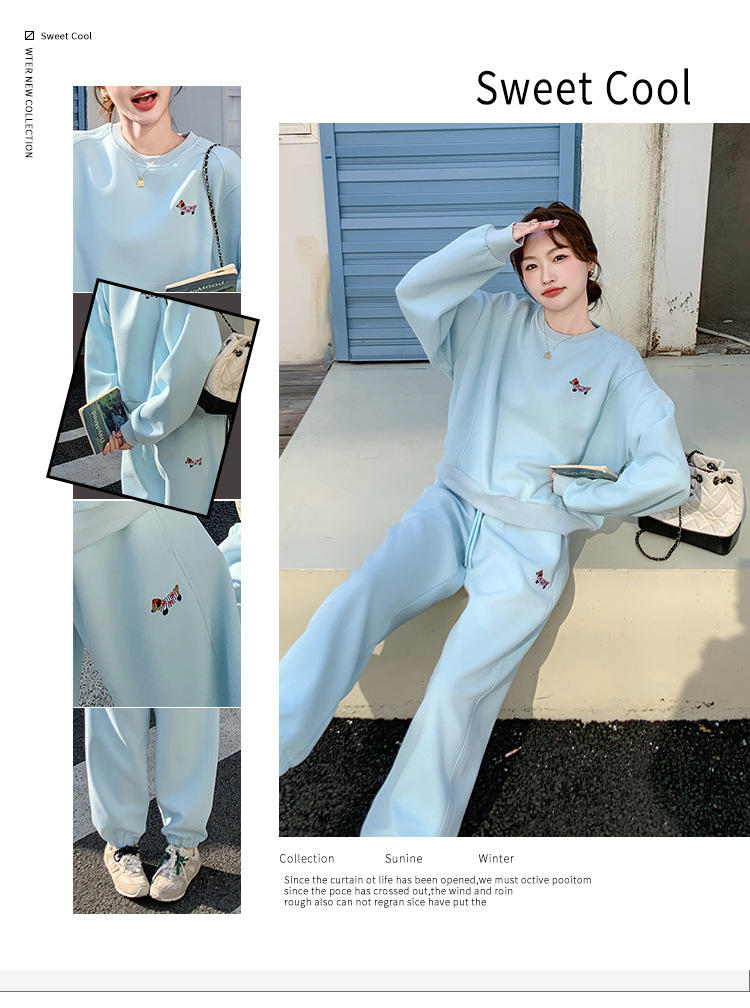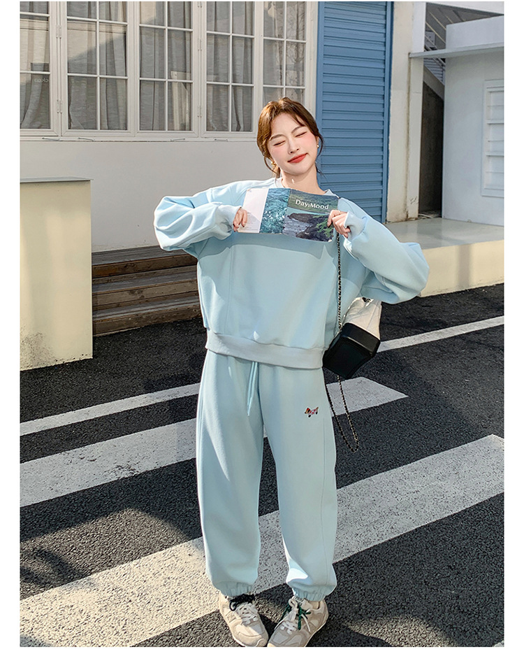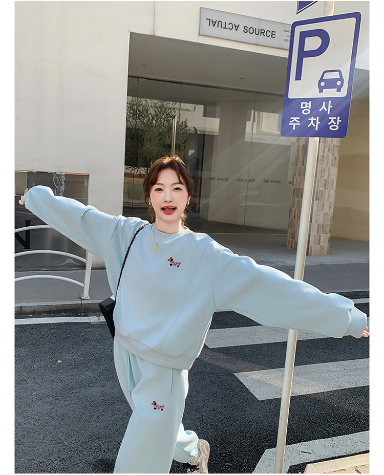 봄은 파란 스웨터 세트를 입고 세트 여성의 느슨한 슬리밍 슈퍼 잘 생긴 스포츠 스타일 발목 바지 투피스 세트스토어 가기