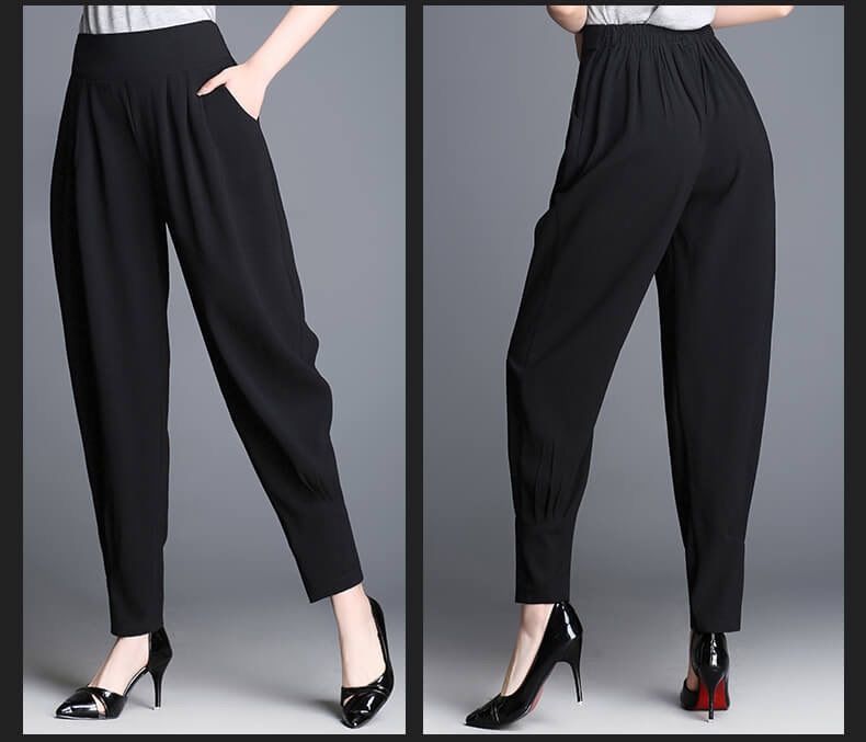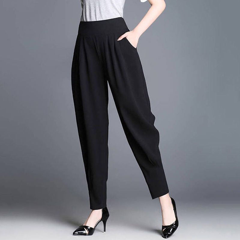 하렘 팬츠 여성용 봄 여름 신상 루즈핏 하이웨이스트 신축성 큰 사이즈 뚱뚱한 여성용 바지 블랙 슬림핏 캐주얼 당근형 아이스 실크