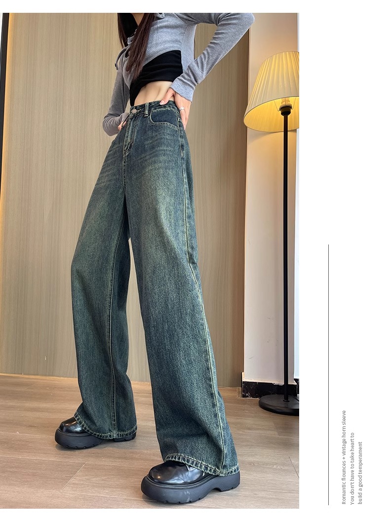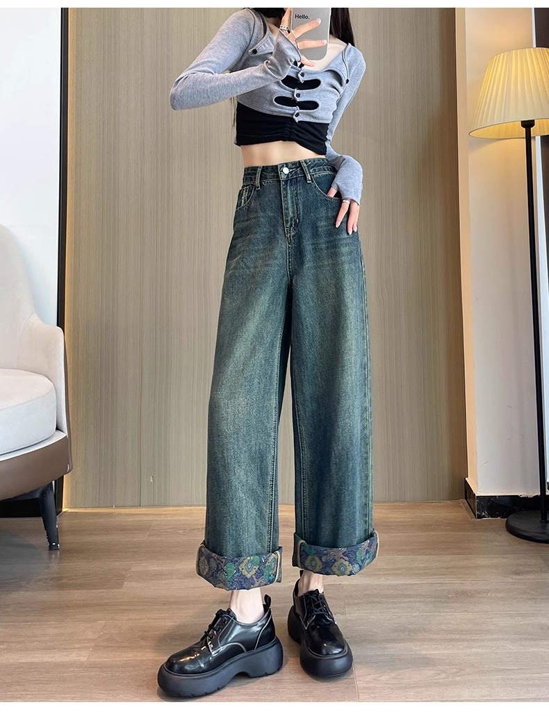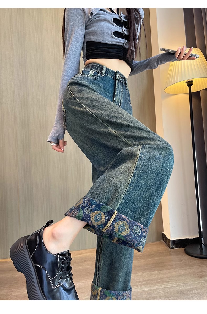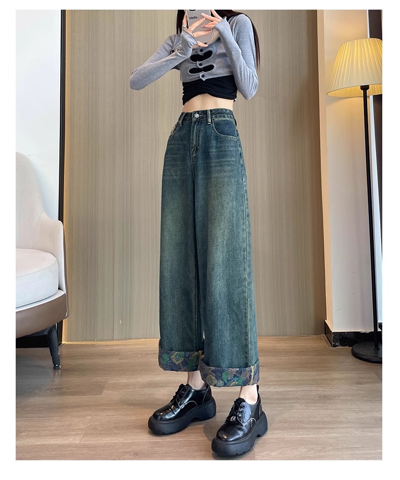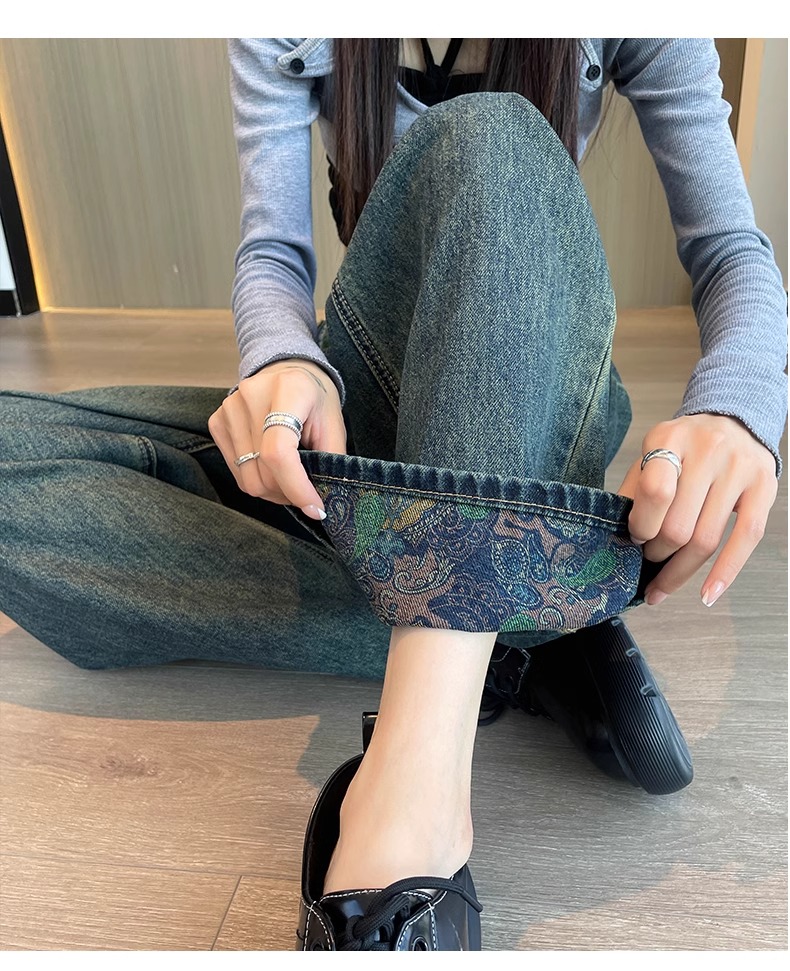 빈티지 와이드 레그 청바지 여성의 2025 새로운 디자인 센스 인쇄 컬링 느슨한 스트레이트 바지 패션 바지스토어 가기