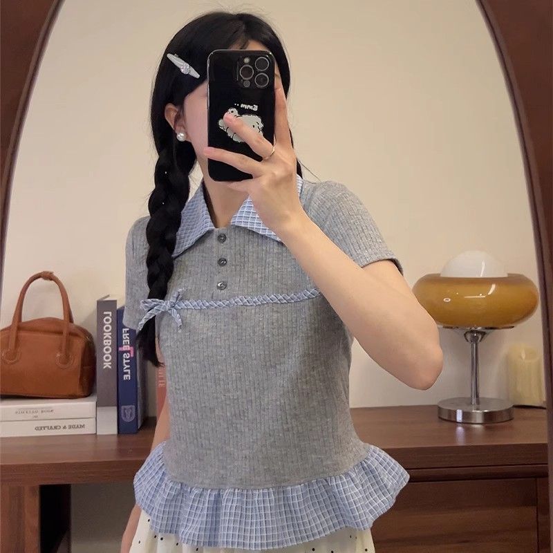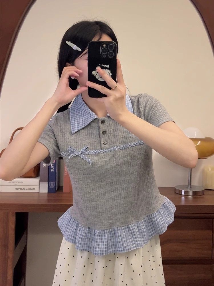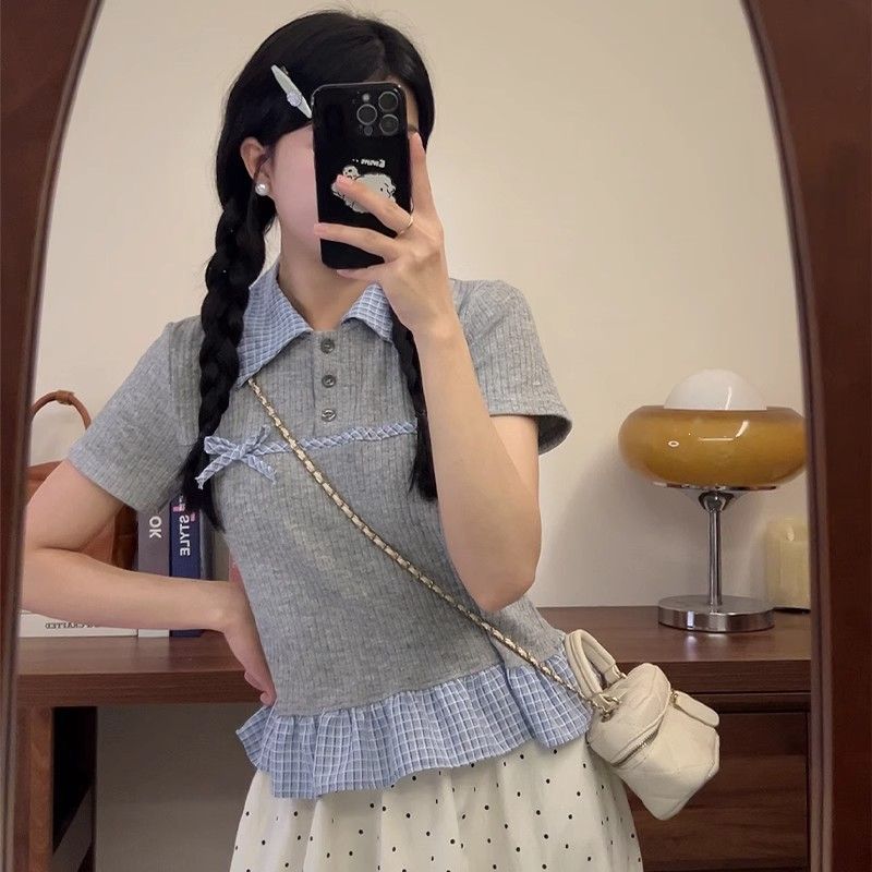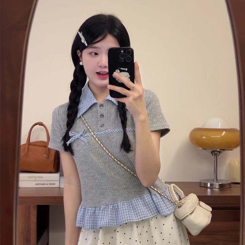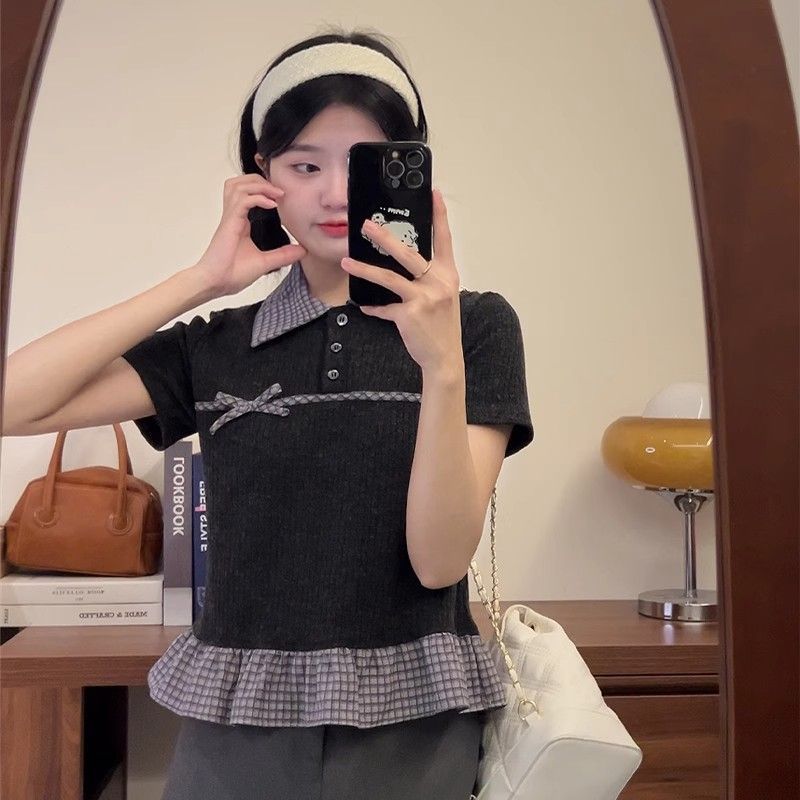 회색 활 가짜 투피스 티셔츠 여성용 여름 슬림 핏 POLO 칼라 반팔 틈새 디자인 센스 체크 무늬 대비 탑스토어 가기