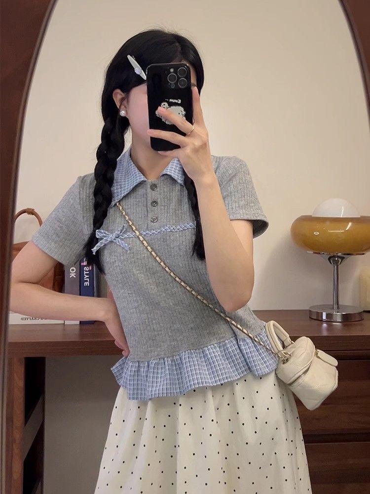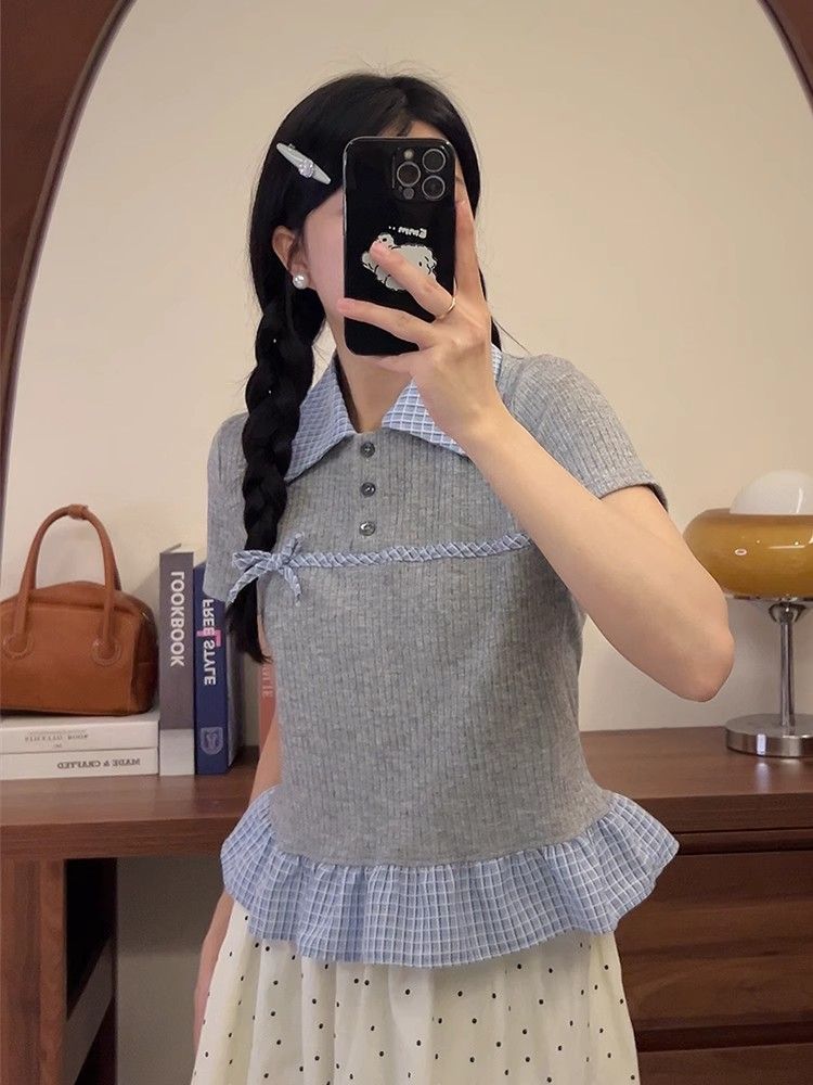 회색 활 가짜 투피스 티셔츠 여성용 여름 슬림 핏 POLO 칼라 반팔 틈새 디자인 센스 체크 무늬 대비 탑