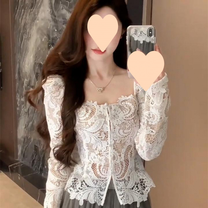 봄 새로운베이스 레이스 셔츠 여성용 퓨어 스타일 스퀘어 칼라 탑 하이 엔드 웨이스트 슬림 핏 슬림 핏 내부 긴 소매스토어 가기