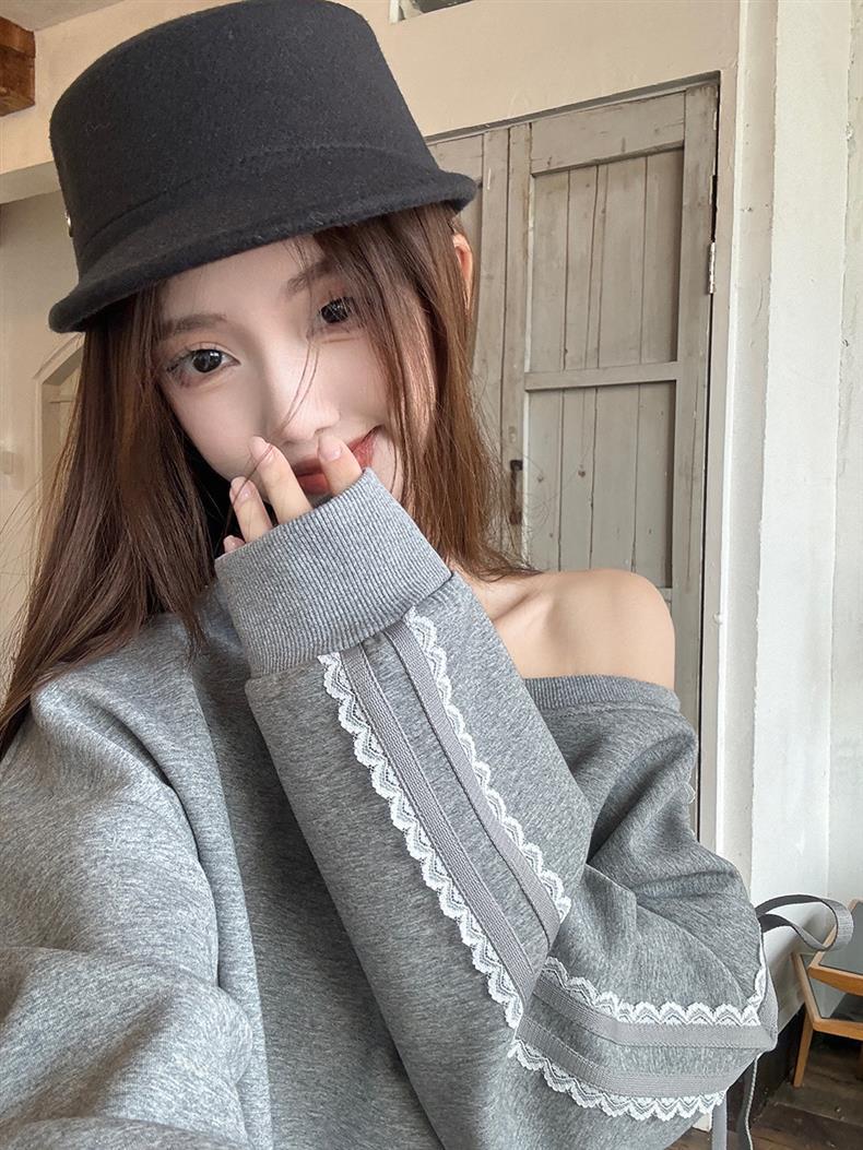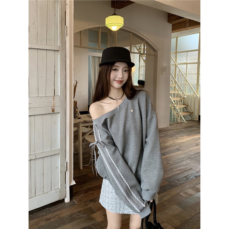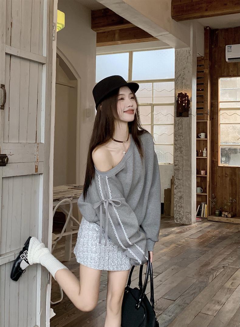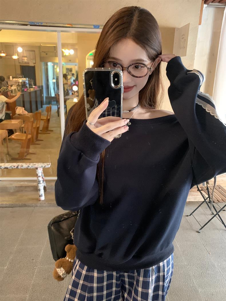 레이스 활 오픈 숄더 긴팔 땀 여자 가을 새 한국 스타일 캐주얼 루즈 탑, 날씬한 어깨스토어 가기