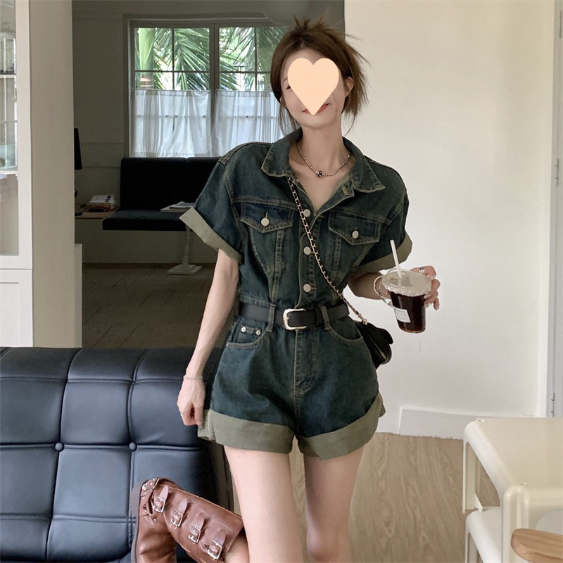 스위트 쿨 데님 점프 수트 홍콩 스타일 컬 반바지 여성 여름 레트로 타이트 허리 슬리밍 와이드 레그 점프 수트 세트스토어 가기