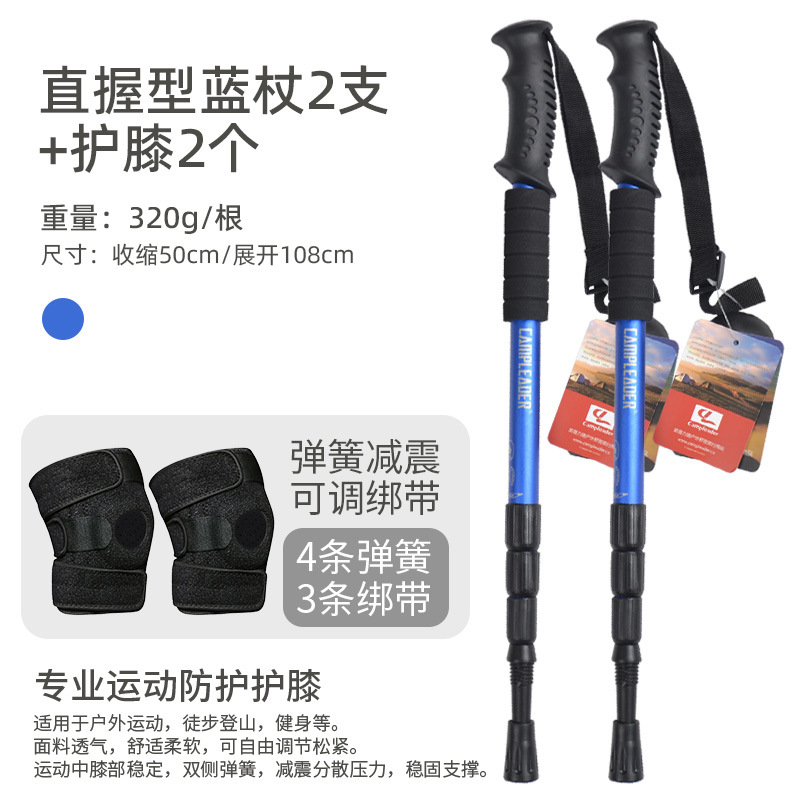 • 직선 핸들 트레킹 폴 2개(색상에 대한 메시지를 남길 수 있음, 기본값은 파란색) + 검정색 무릎 패드 2개