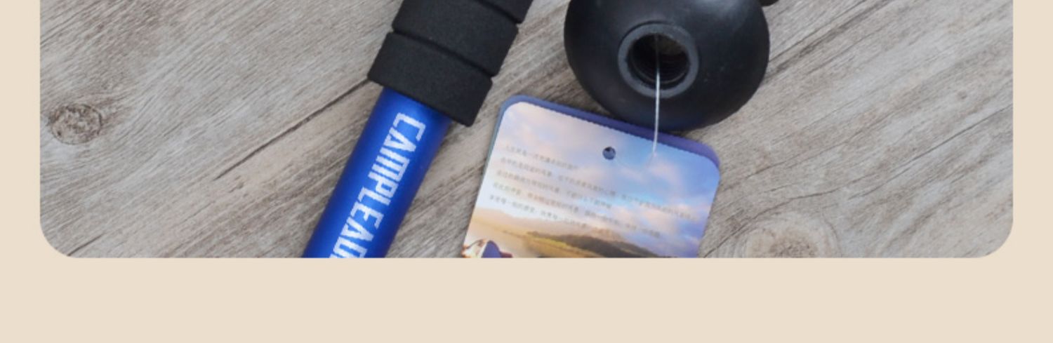 • T자형 트레킹 폴 2개(색상에 대한 메시지를 남길 수 있음, 기본적으로 파란색) + 검정색 무릎 패드 2개