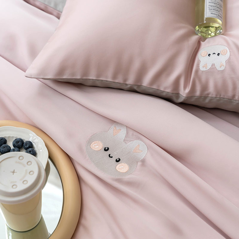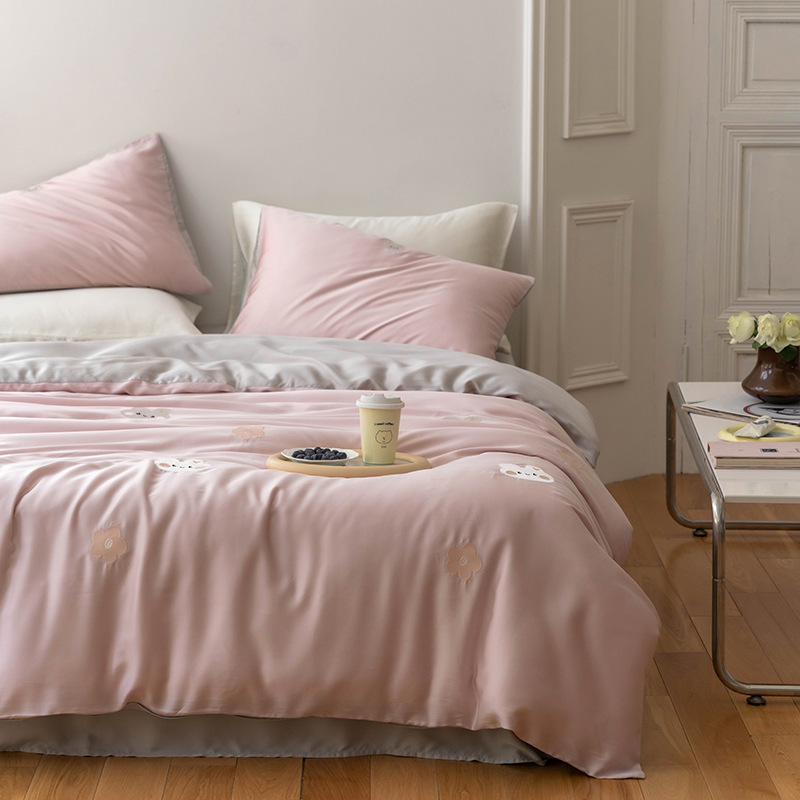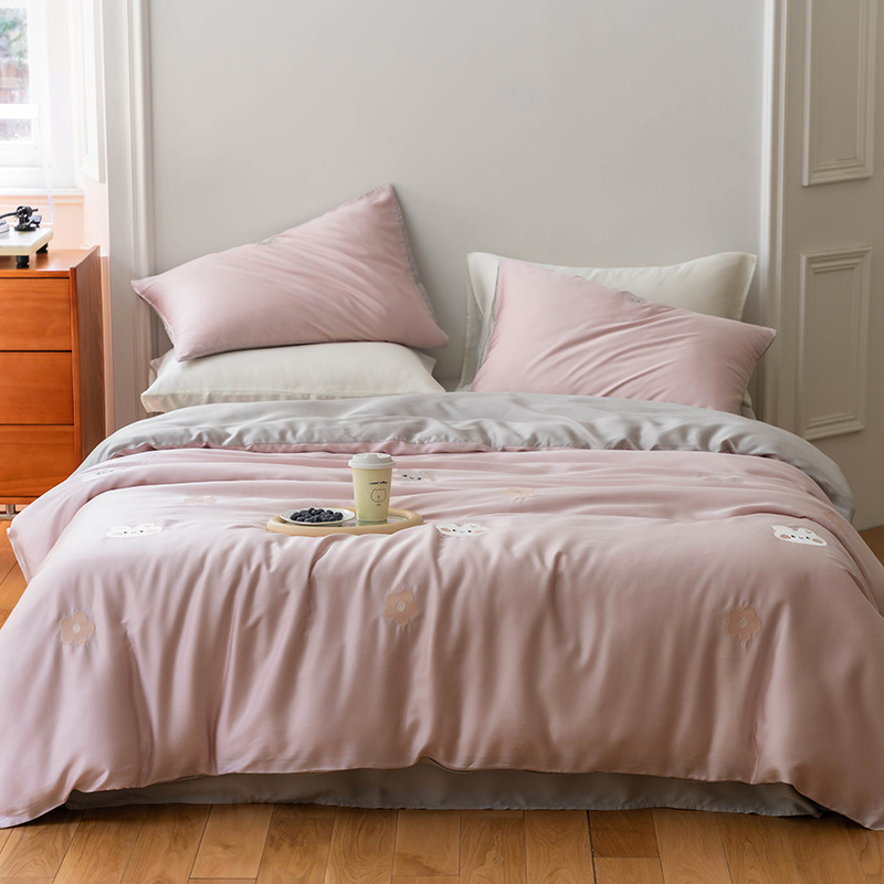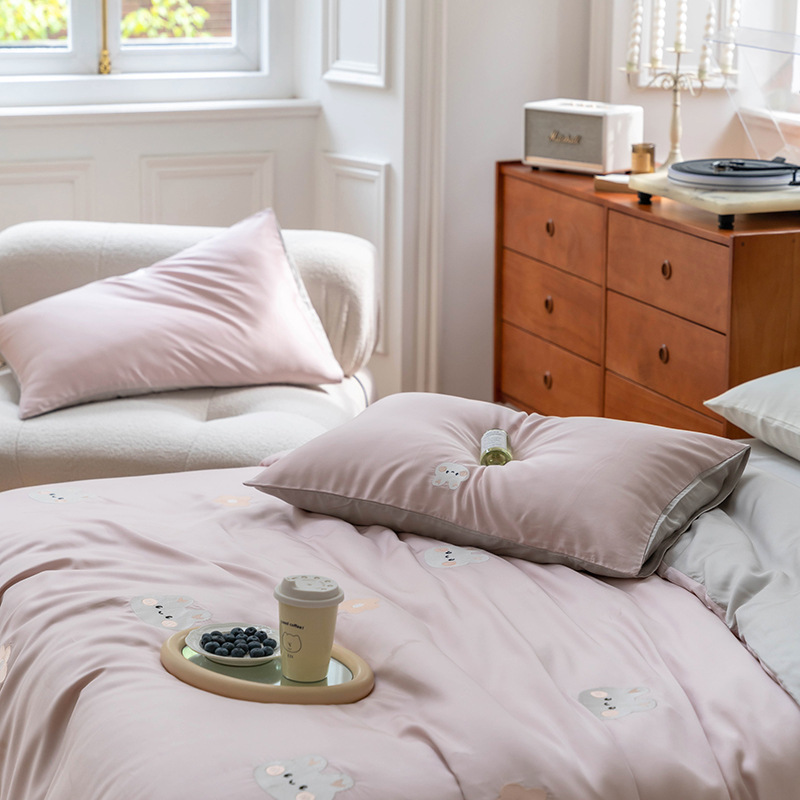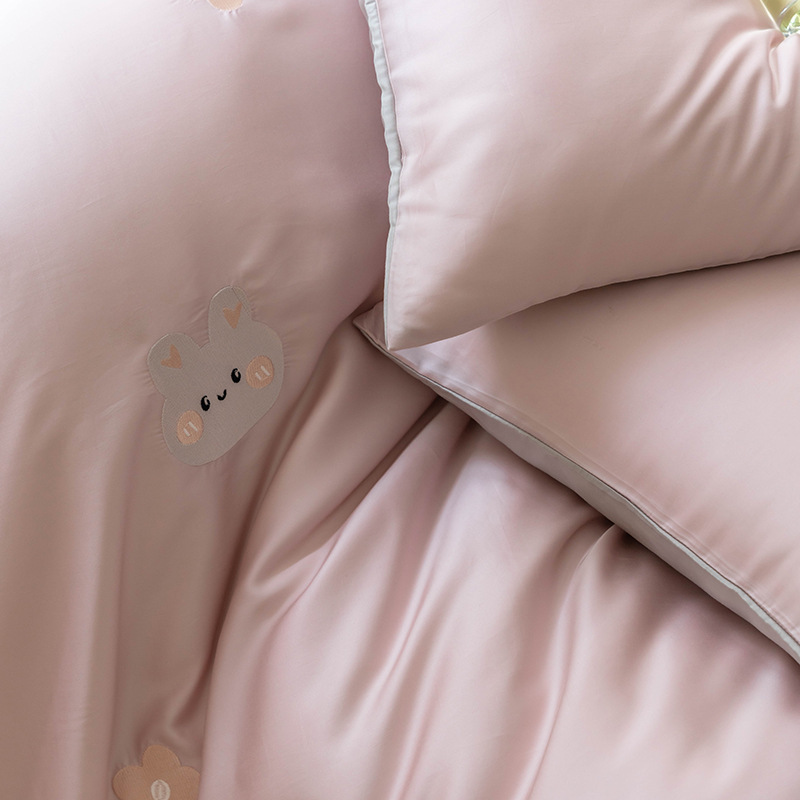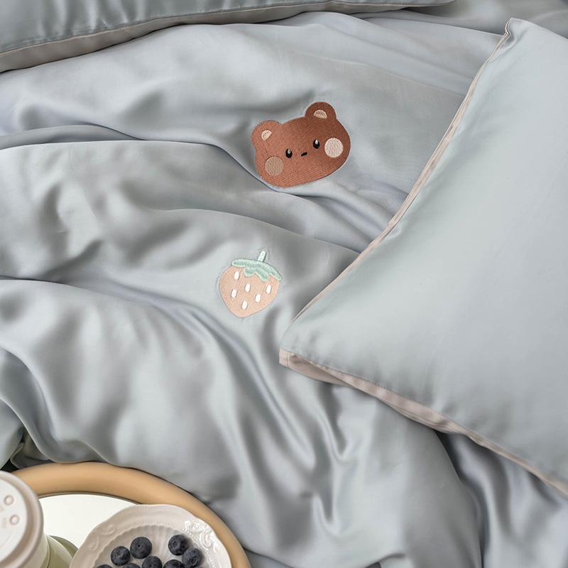 Ins 귀여운 만화 수 놓은 100 Lanjing Tencel 4 조각 세트 여름 아이스 실크 알몸 슬리핑 퀼트 커버 침대 시트스토어 가기