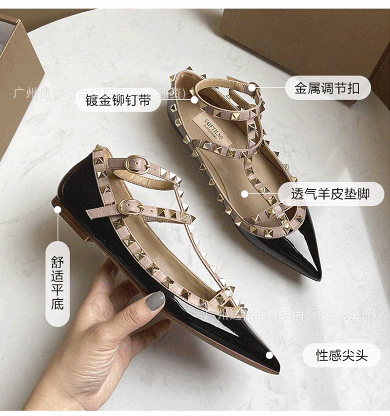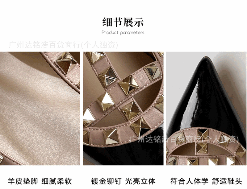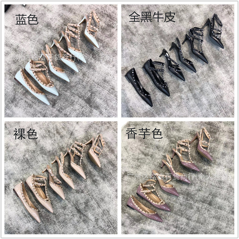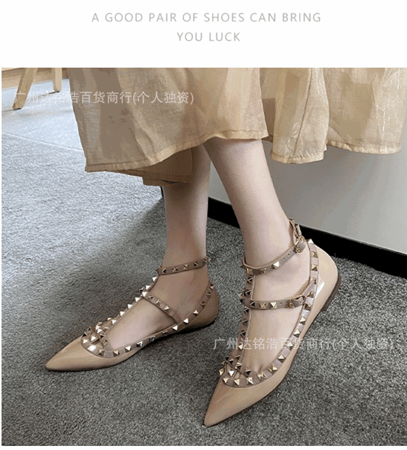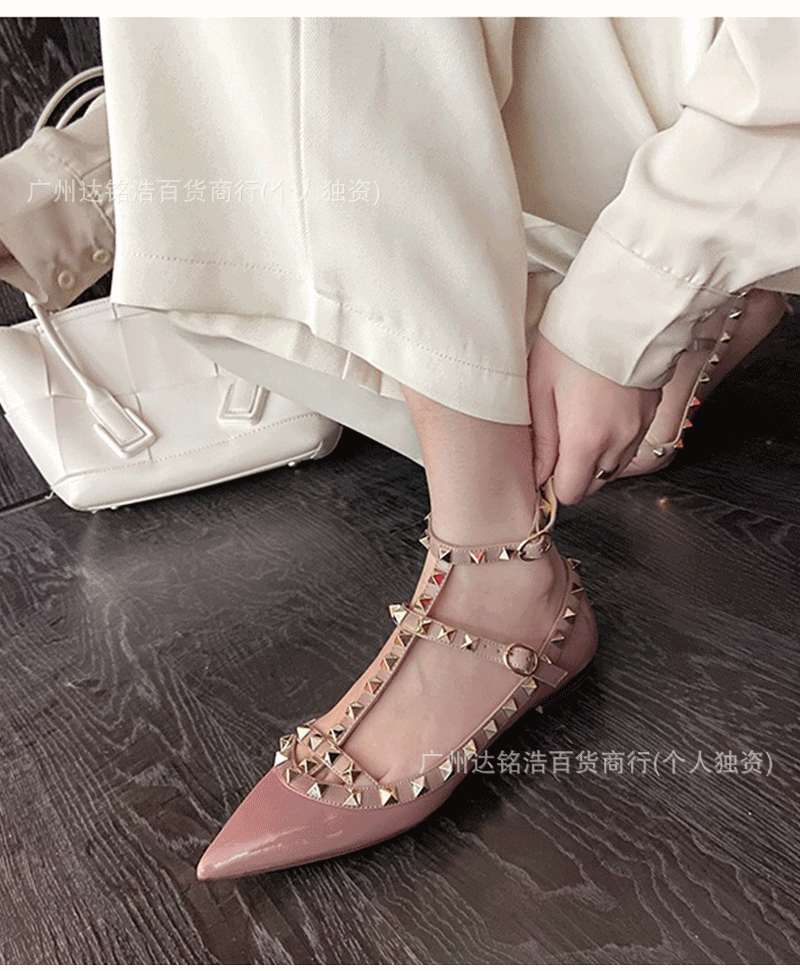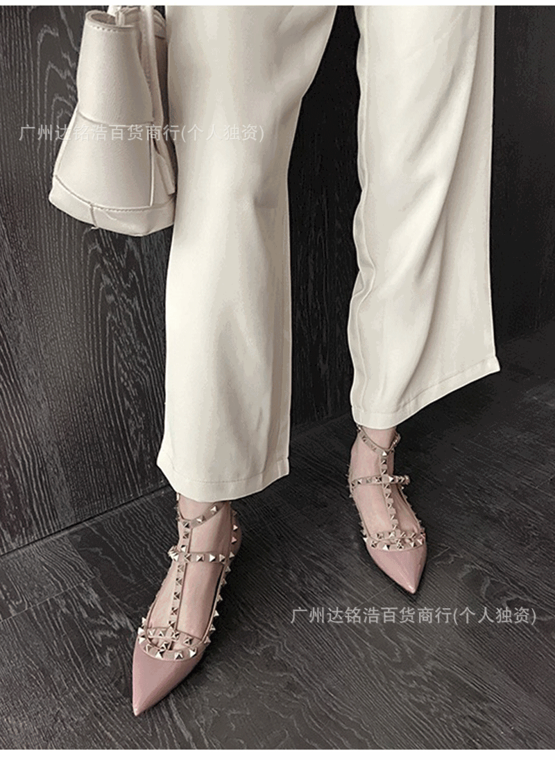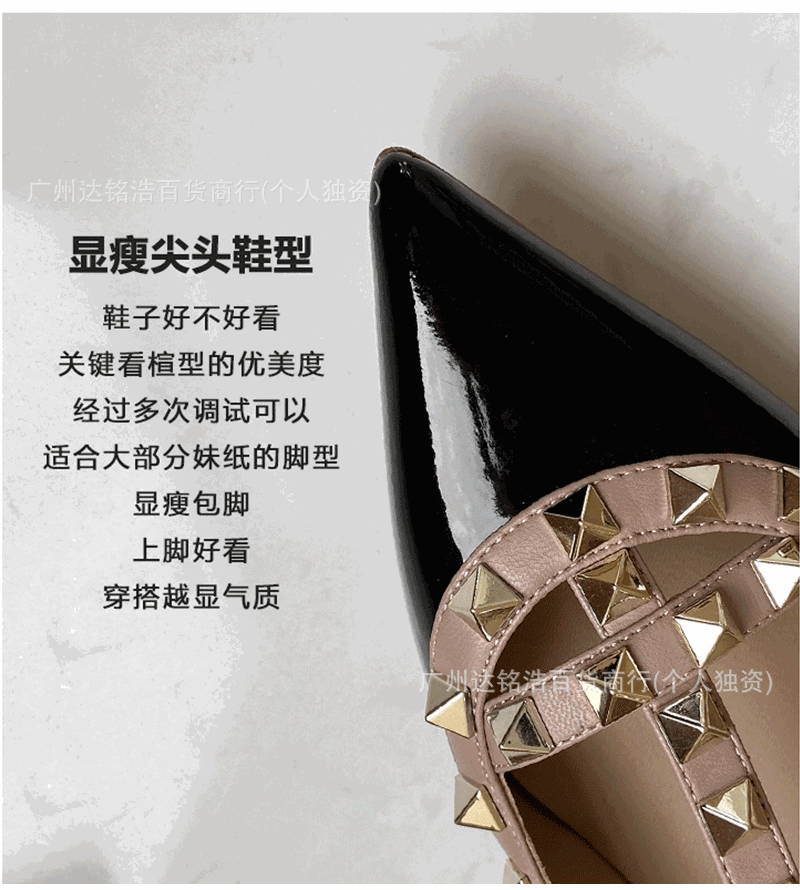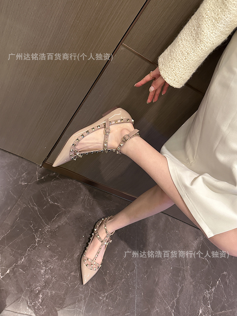 2026 화렌 리벳 하이힐 V-스타일 얕은굽 슈즈 포인티드 토 스틸레토 플랫 슈즈 리벳 샌들 여성용 소가죽 페이턴트 가죽스토어 가기