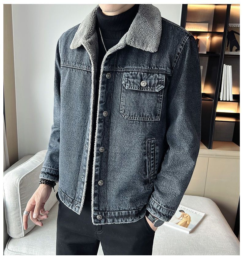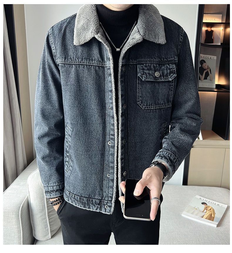 데님 재킷 남자 겨울 새 기모 두꺼운 따뜻한 울 칼라 데님 한국 스타일 유행 슬림 핏 겨울 옷스토어 가기