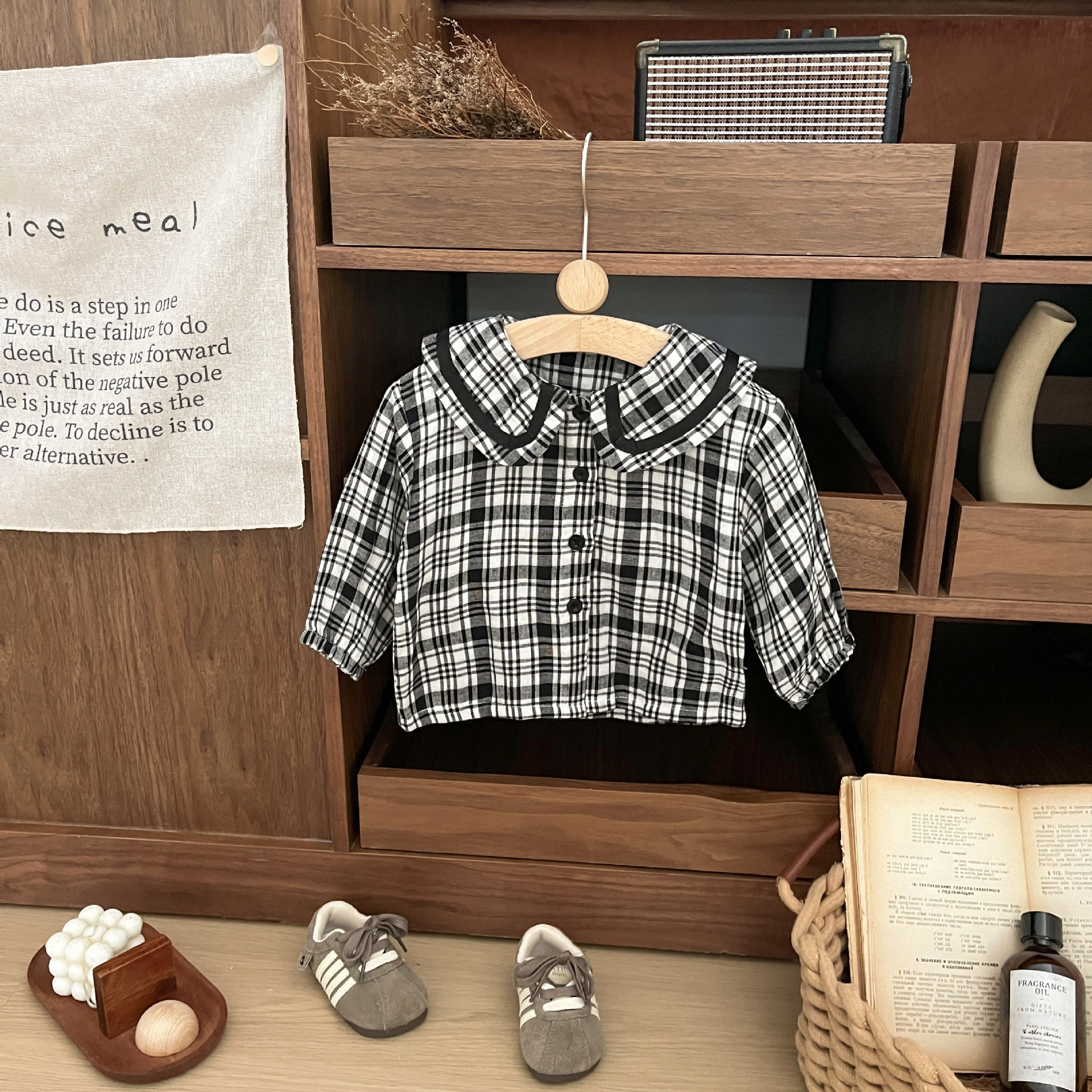 한국 스타일 소녀 레트로 셔츠 봄 새 아기의 서양식 대비 컬러 격자 무늬 옷깃 셔츠 어린이 올매치 탑스토어 가기
