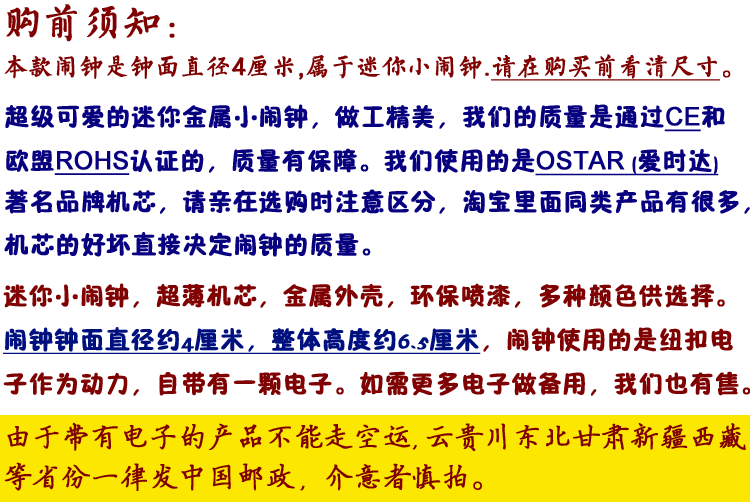 闹钟是钟面直径4厘米和5厘米的,属于迷你小闹钟。尺寸在产品名称、描述、图片中都有明确告知,请勿因尺寸问题给与中差评!