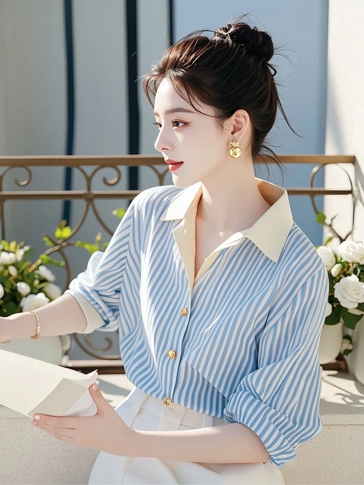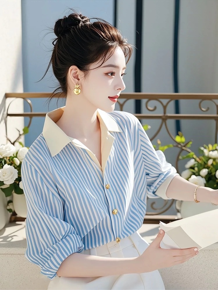 올해 인기있는 슈퍼 잘 생긴 독특한 아름다운 작은 셔츠 하이 엔드 라이트 럭셔리 시대-봄 여성을위한 외국 스타일 블루 스트라이프 셔츠 감소