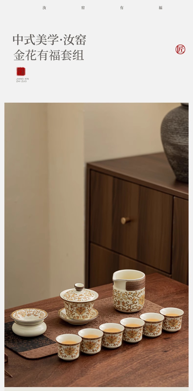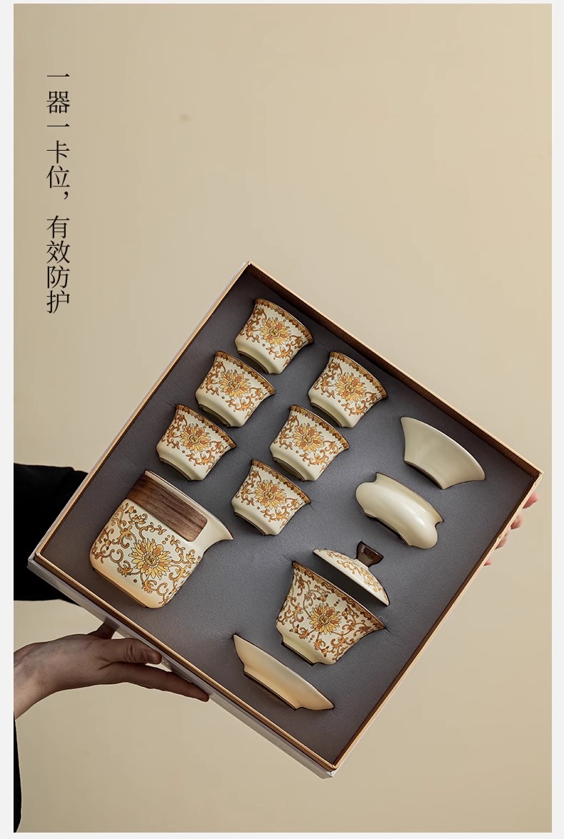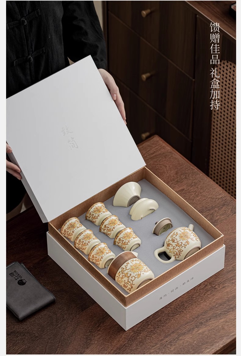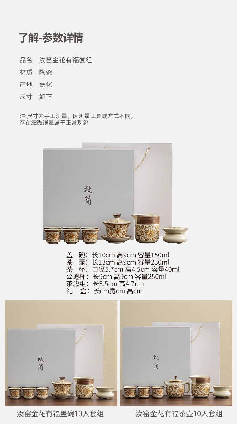 Ruyao 황금 꽃 축복받은 차 세트 선물 상자 세트 홈 거실 사무실 회의 쿵푸 차 세트 세트 세라믹 차 세트스토어 가기