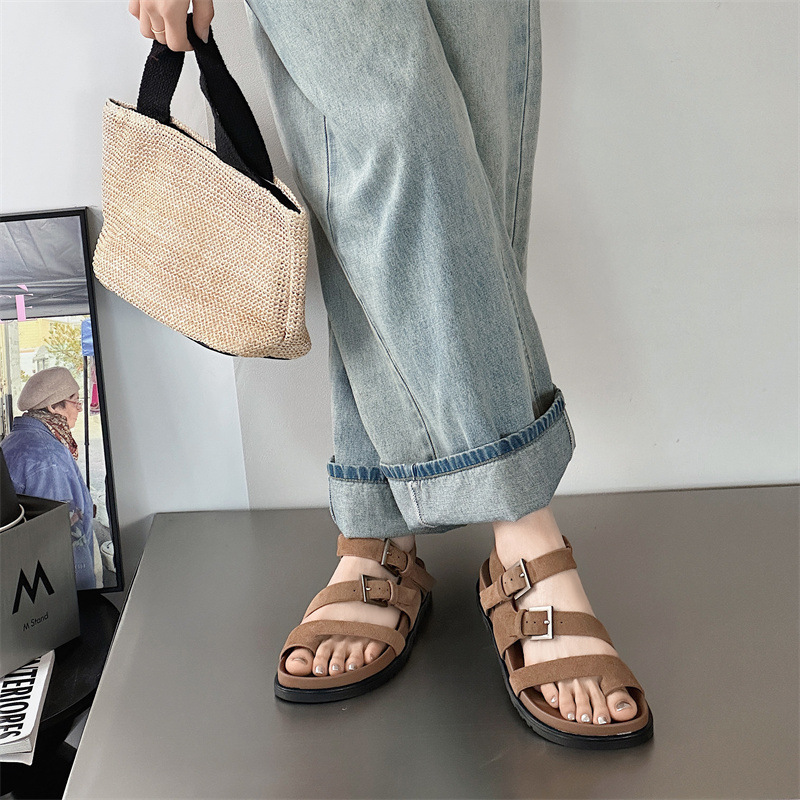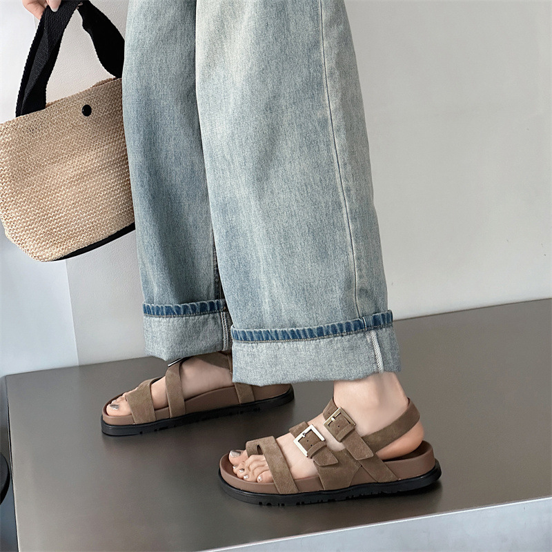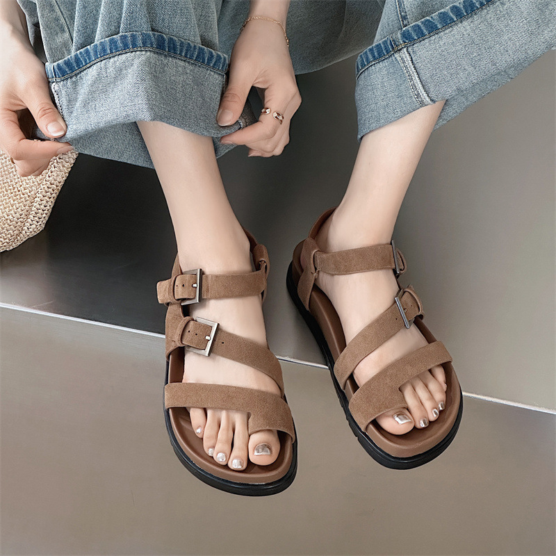 나비 Ao 2025 새로운 정품 가죽 빈티지 가죽 통 핀 버클 장식 플랫 솔 샌들 여성용 비치 슈즈 여성용 소프트 솔스토어 가기