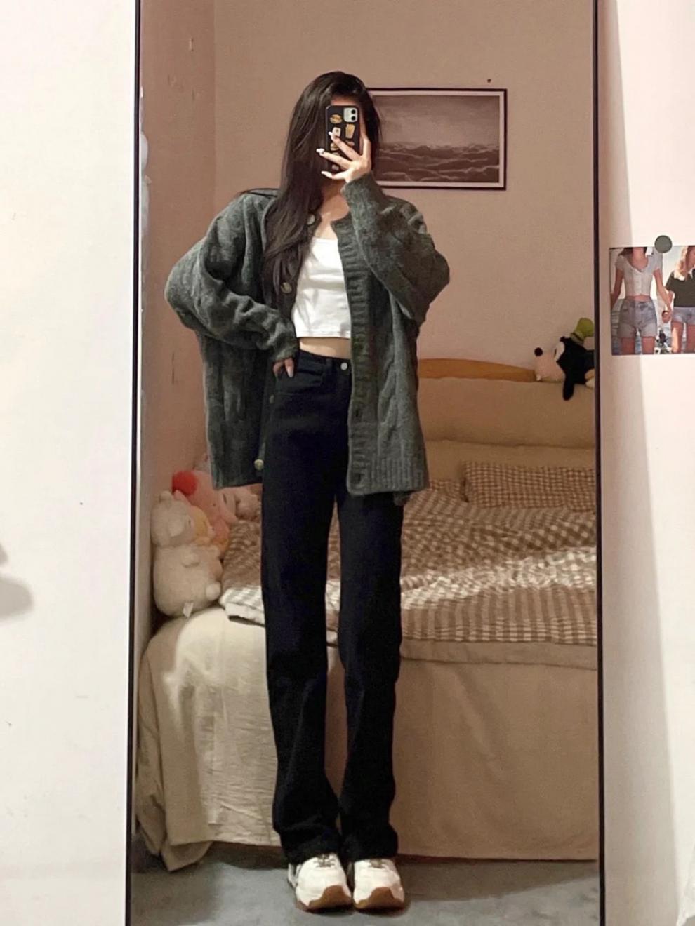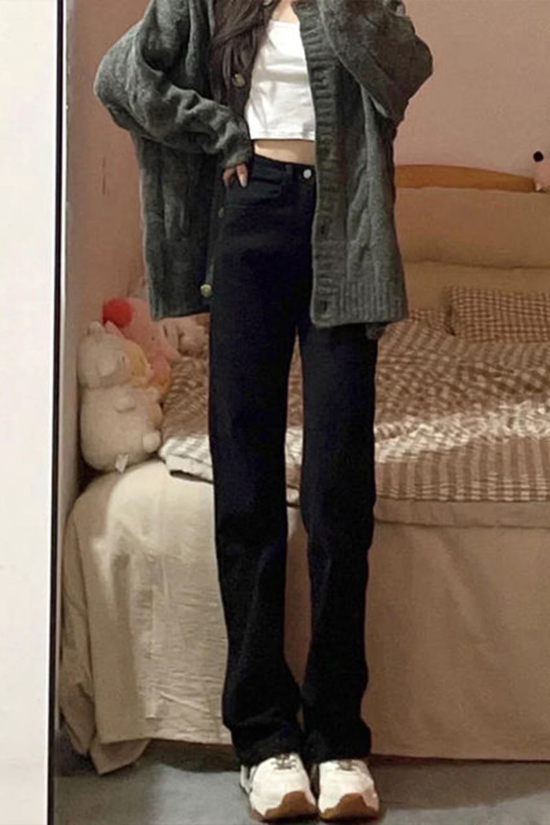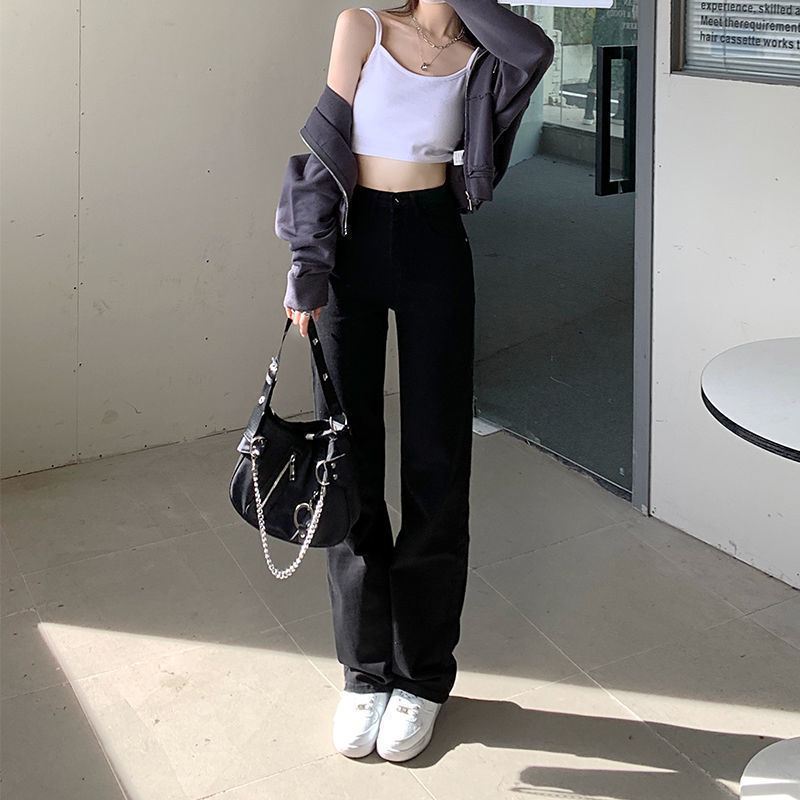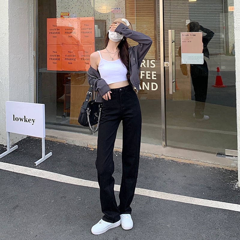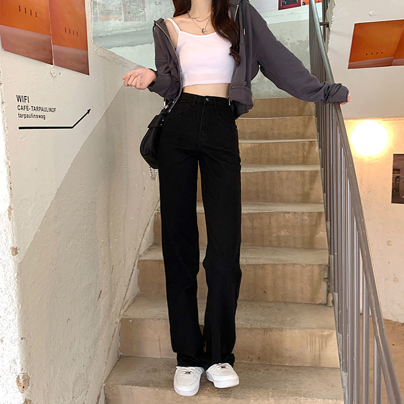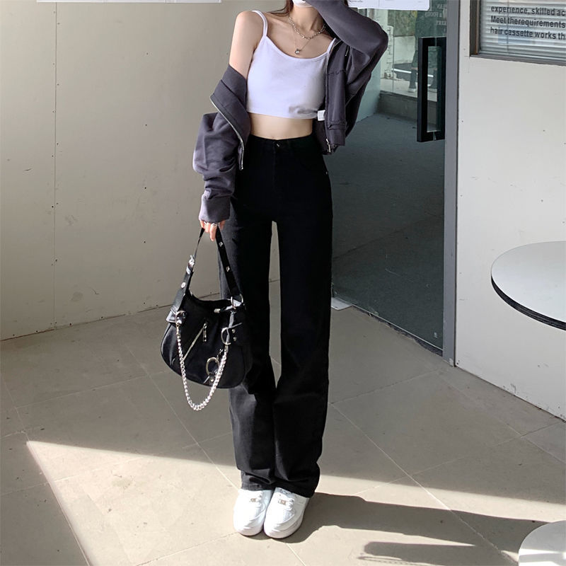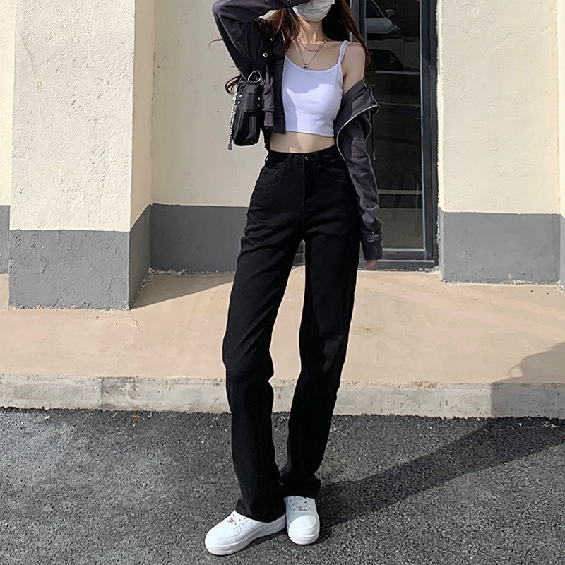 홍콩 맛 슬림 블랙 청바지 여성의 봄과 가을 새로운 도착 높은 허리 올매치 느슨한 스트레이트 슬림 핏 스트레치 바지스토어 가기