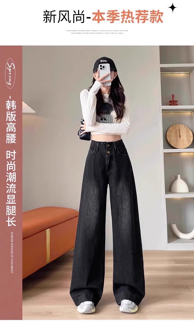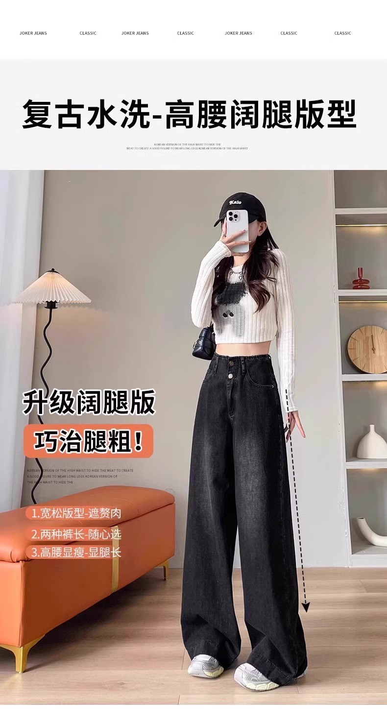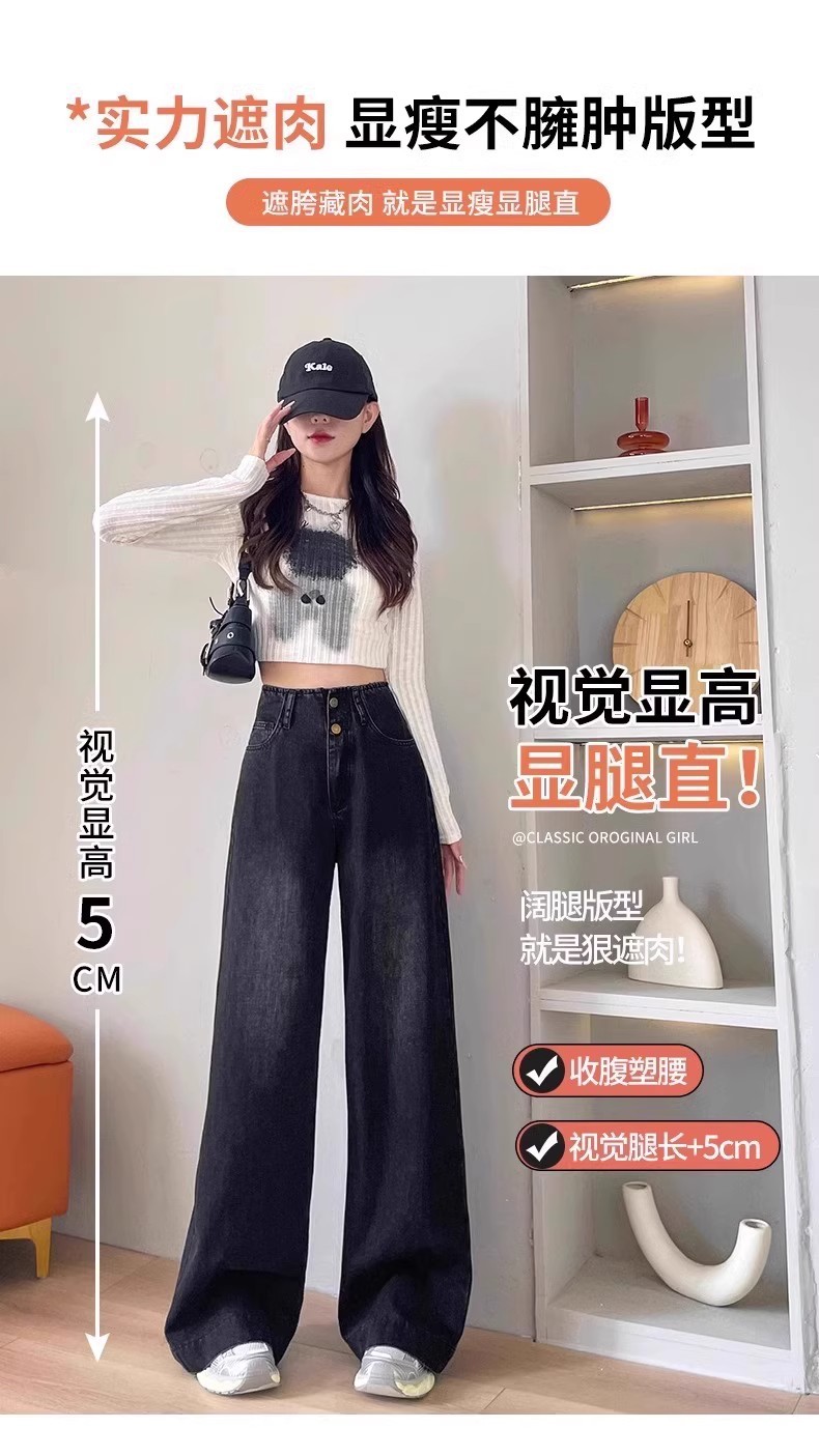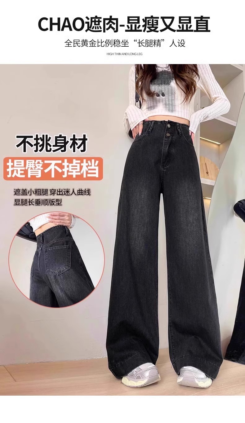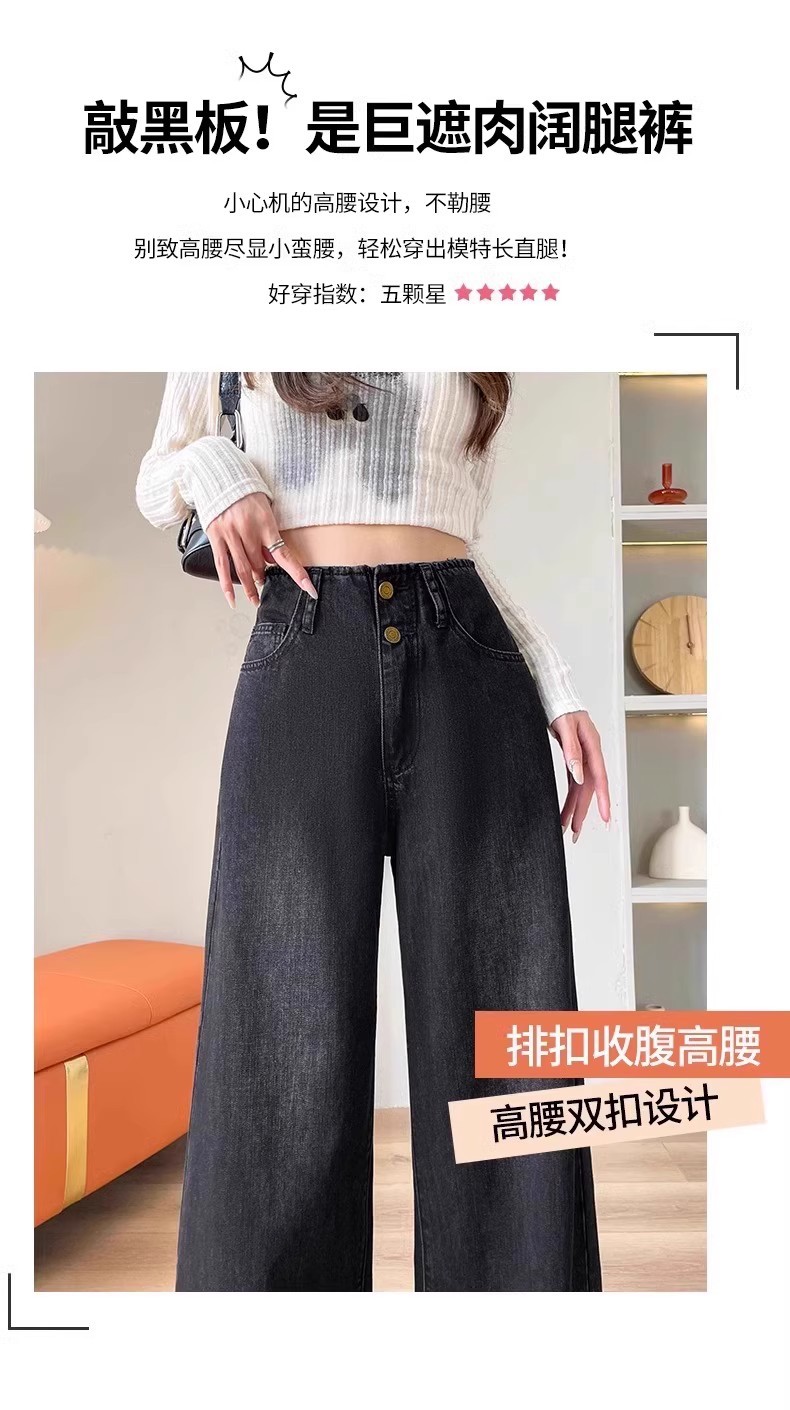 플러스 사이즈 높은 허리 넓은 다리 청바지 여성의 통통녀 배 모양의 그림 디자인 감각 느슨한 슬리밍 스트레이트 긴 바지 봄과 여름스토어 가기