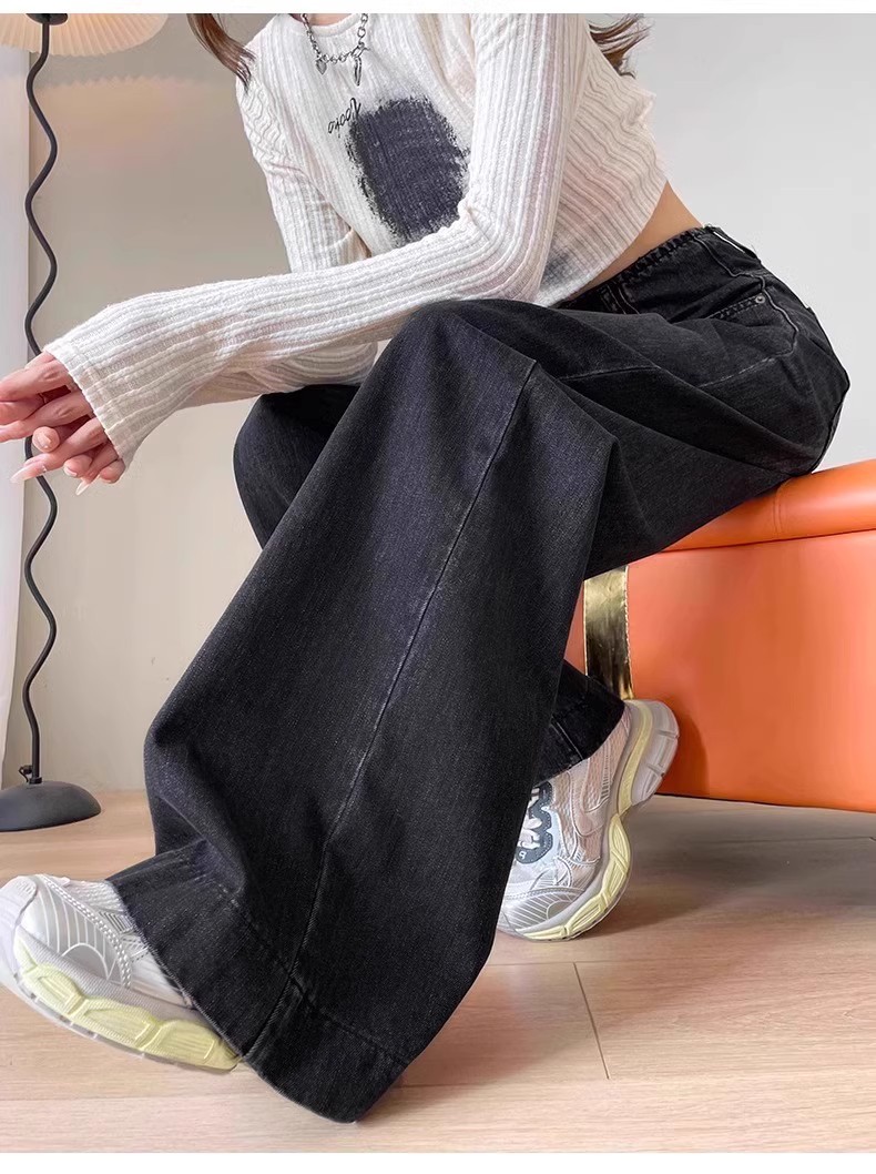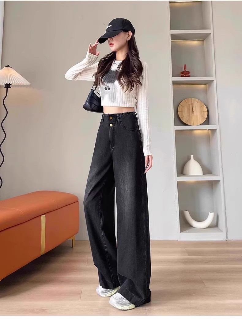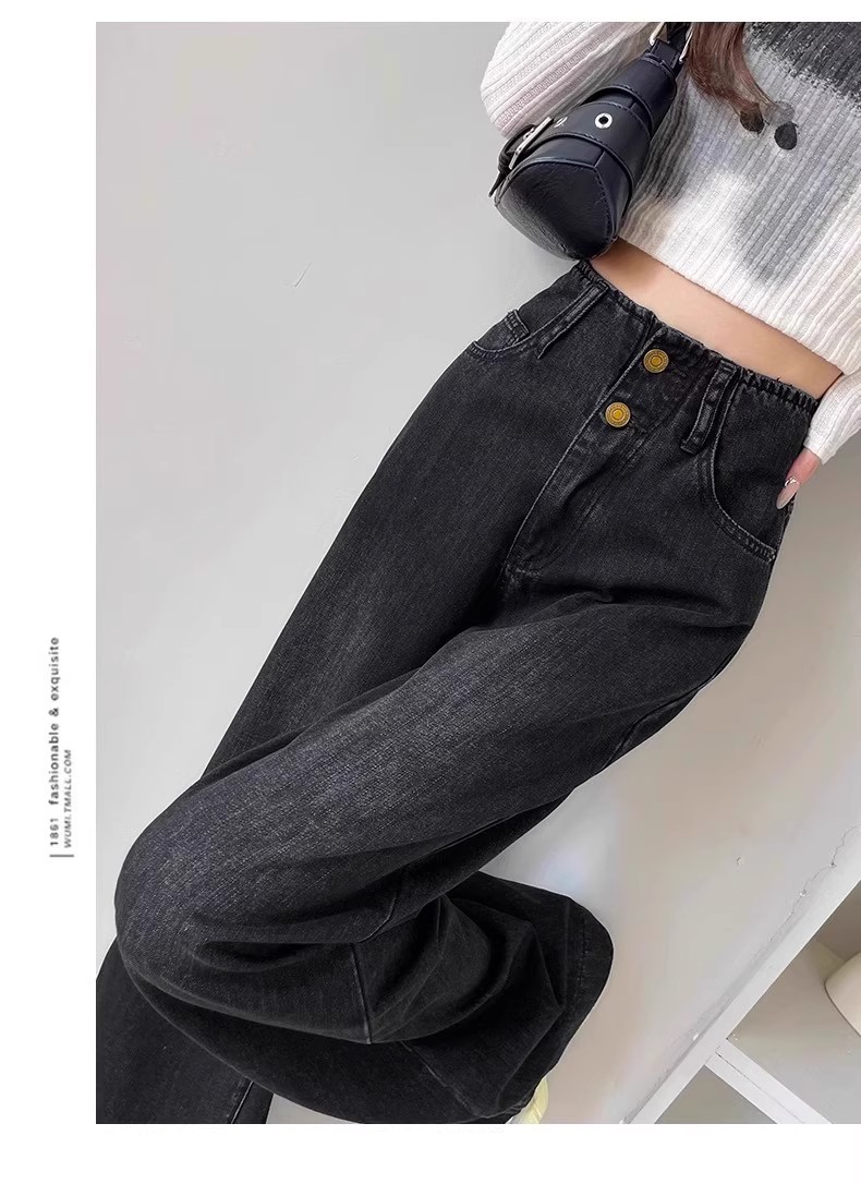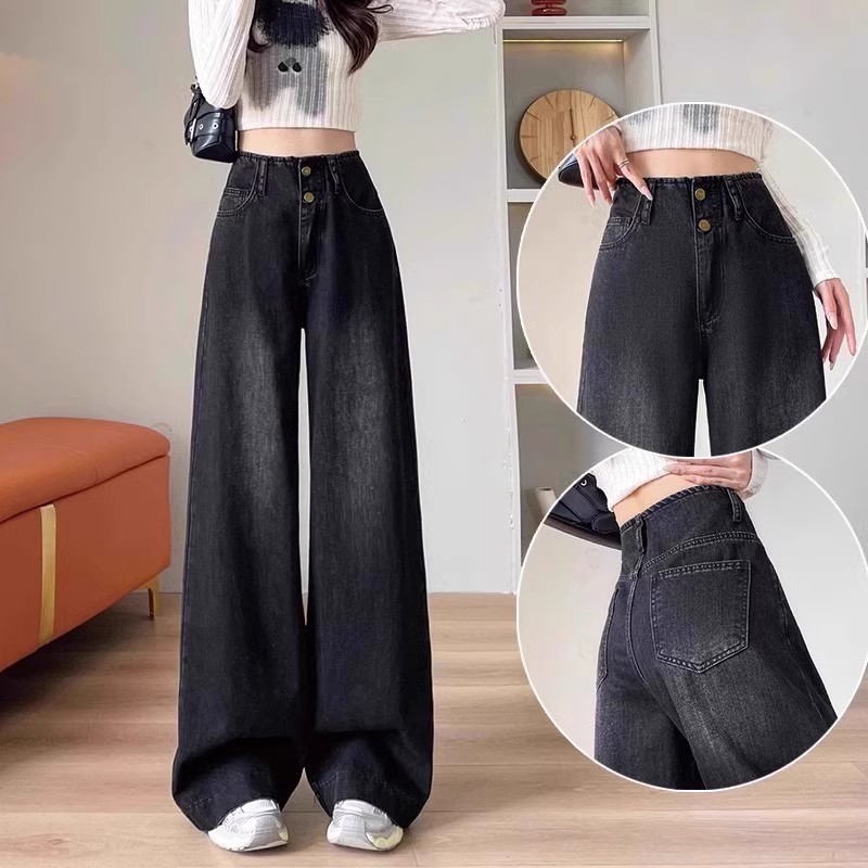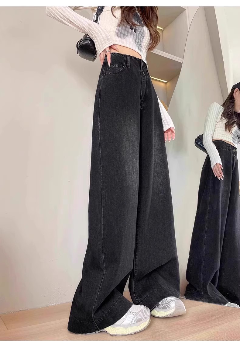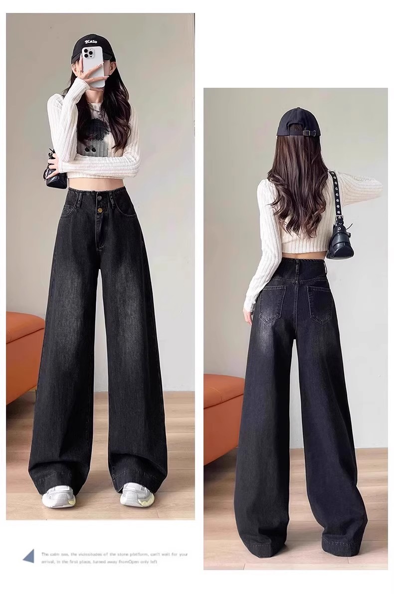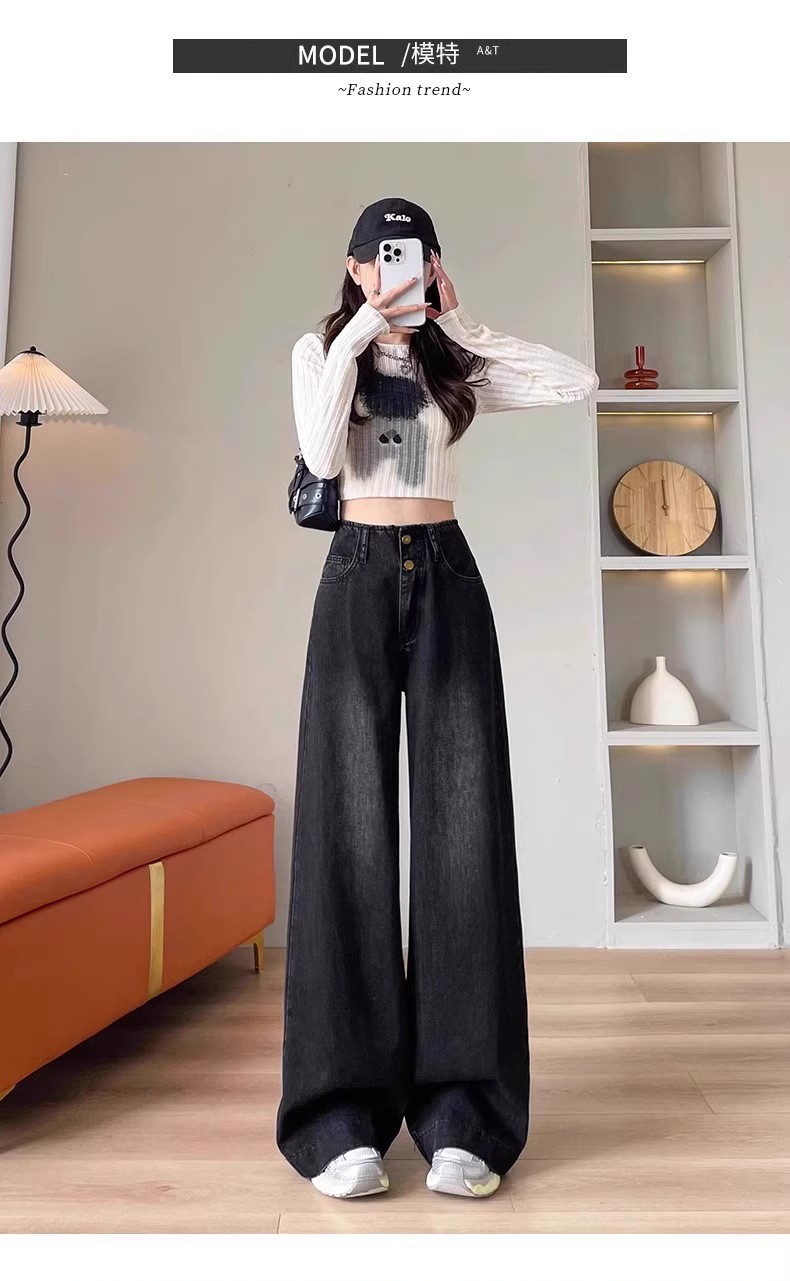 플러스 사이즈 높은 허리 넓은 다리 청바지 여성의 통통녀 배 모양의 그림 디자인 감각 느슨한 슬리밍 스트레이트 긴 바지 봄과 여름스토어 가기