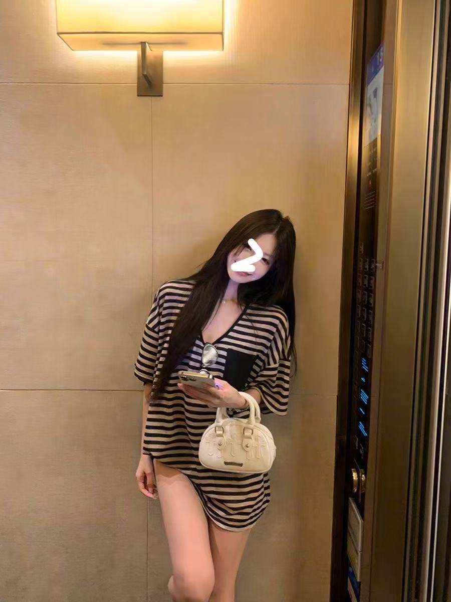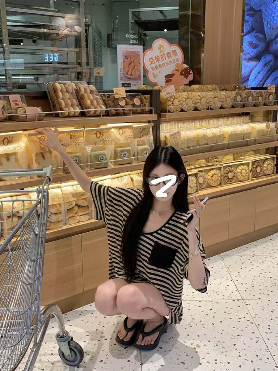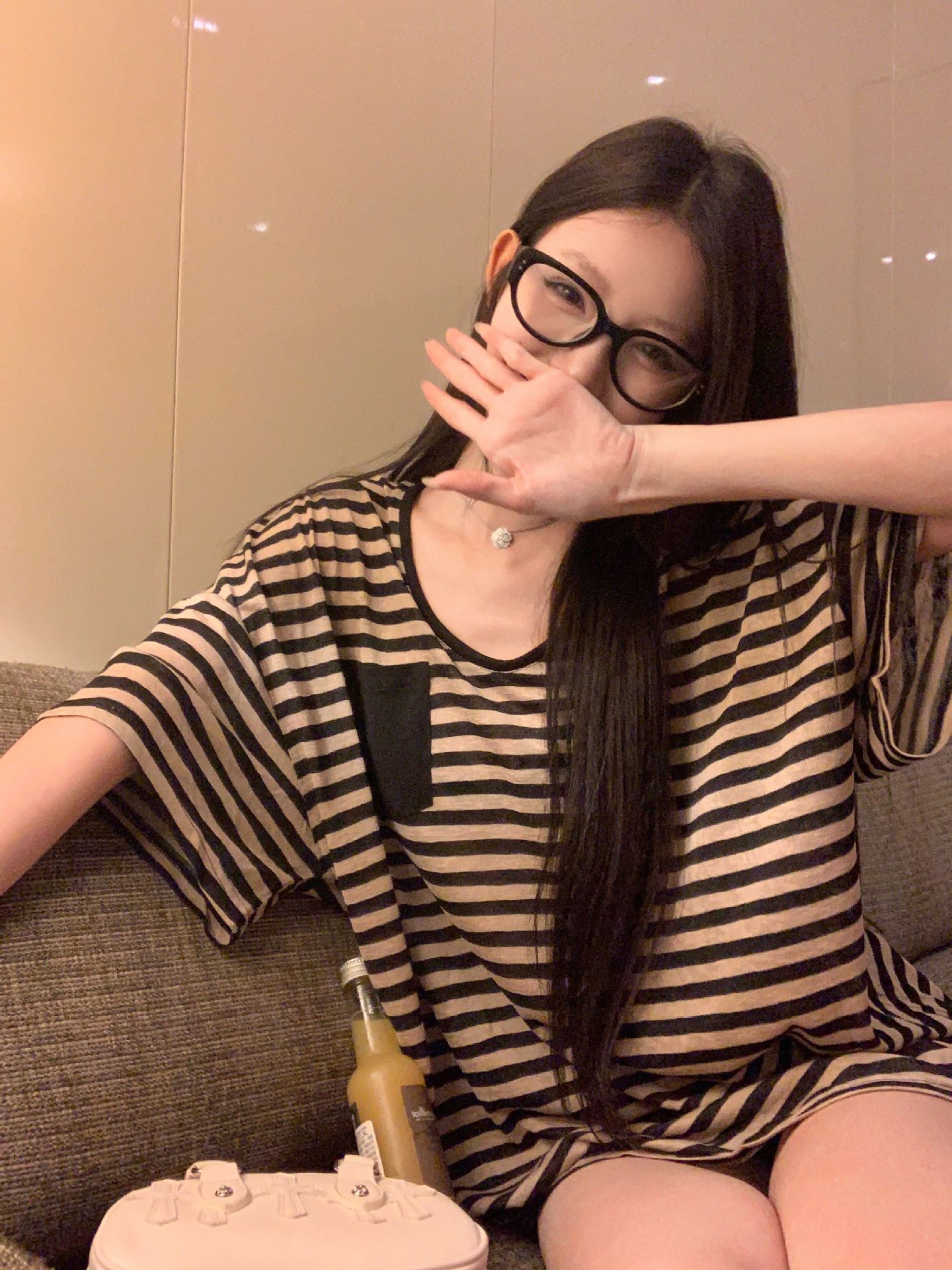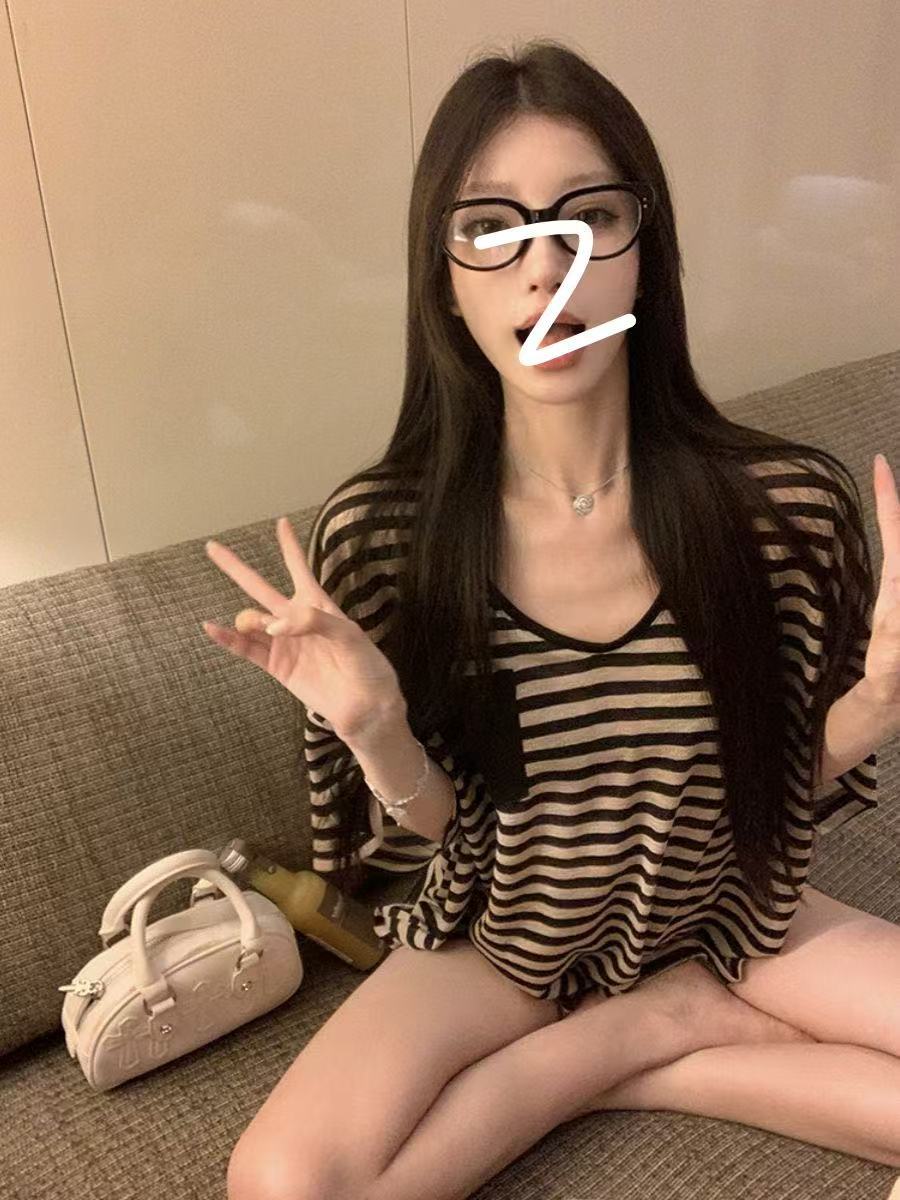 게으른 블랙과 화이트 스트라이프 반팔 티셔츠 여성용 여름 레트로 대비 V 넥 루즈 미디 탑