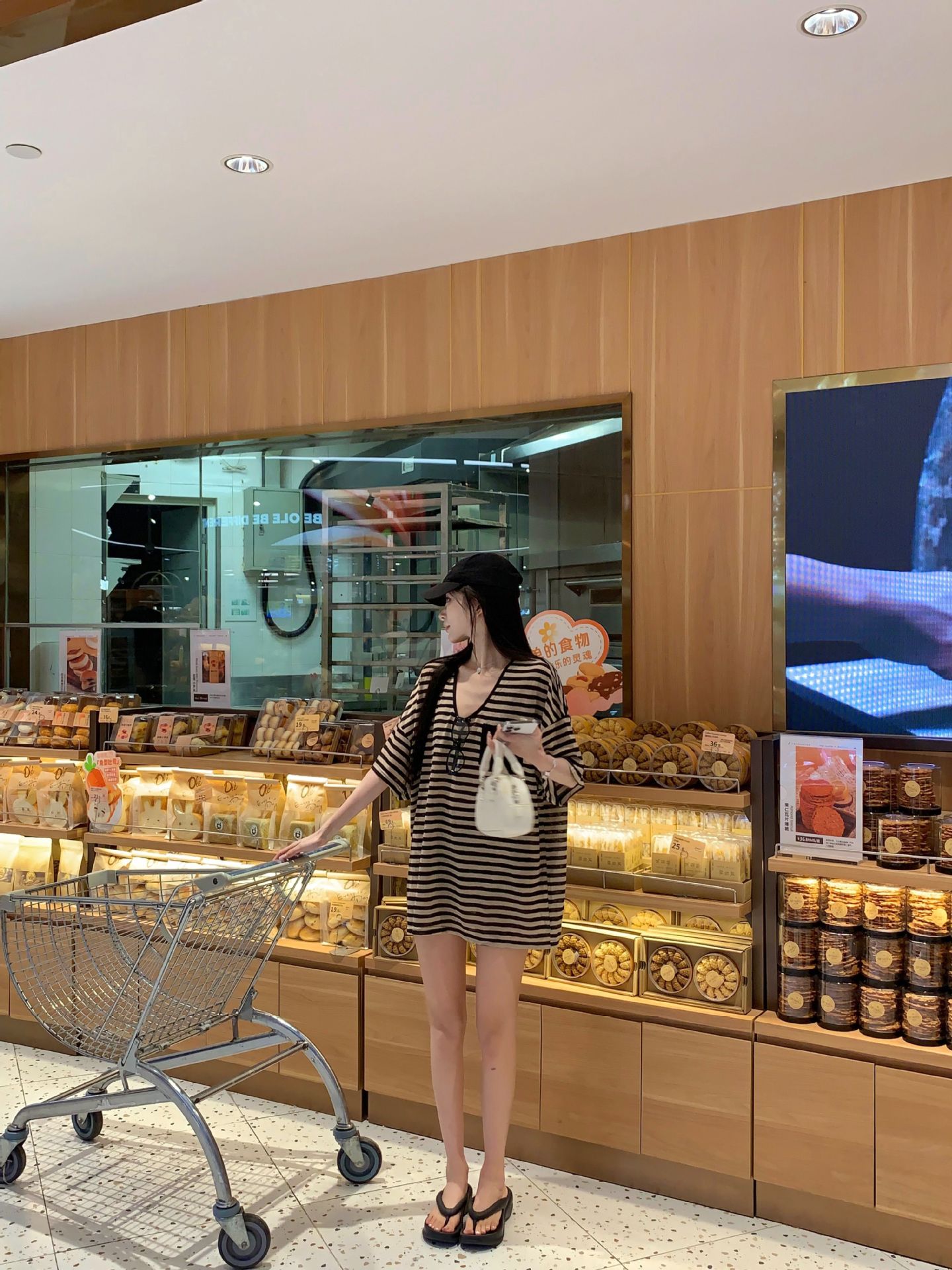 게으른 블랙과 화이트 스트라이프 반팔 티셔츠 여성용 여름 레트로 대비 V 넥 루즈 미디 탑스토어 가기