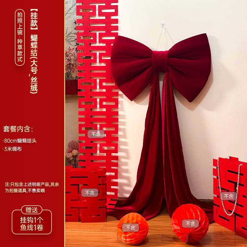 超大红绒蝴蝶结挂饰结婚婚房布置路引蝴蝶摆件新娘晨袍拍照背景墙新款结婚装饰超大蝴蝶结背景墙婚礼场景布置路引红丝绒蝴蝶结套装