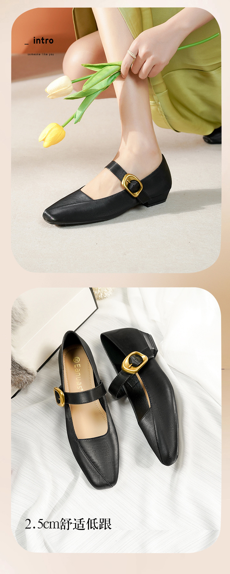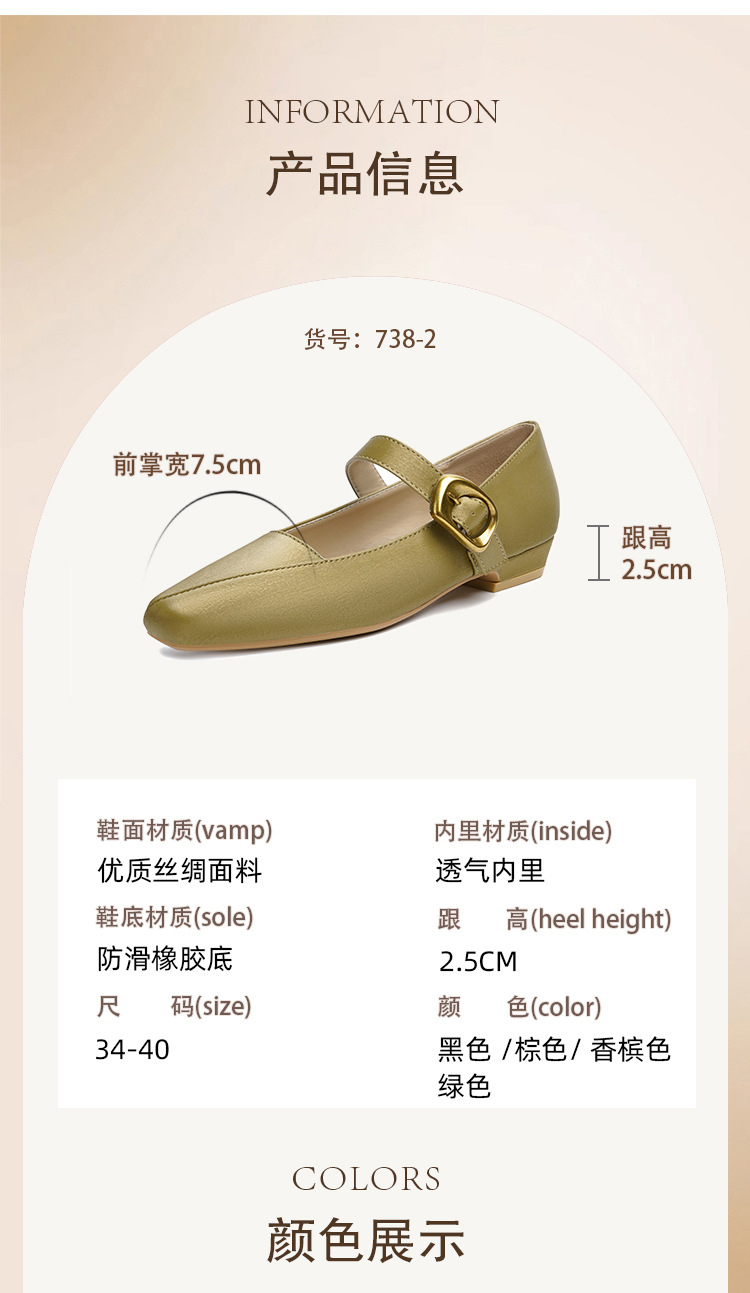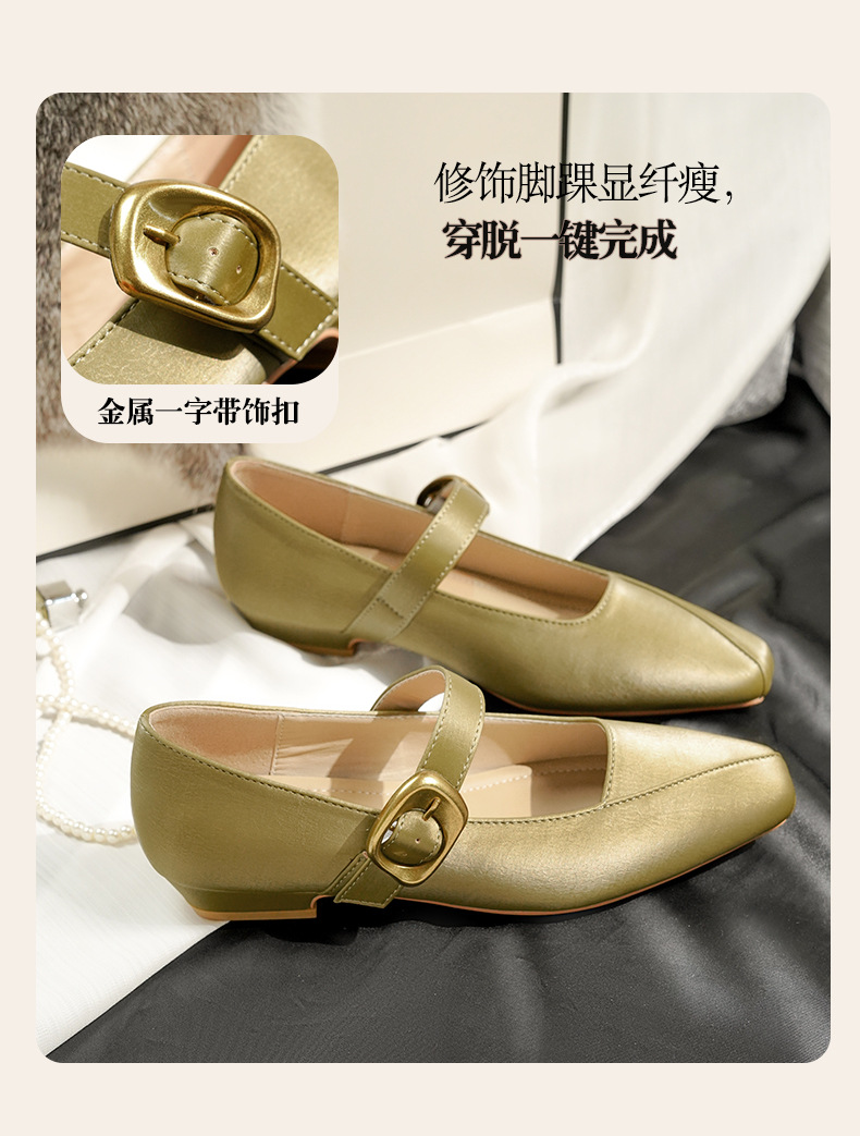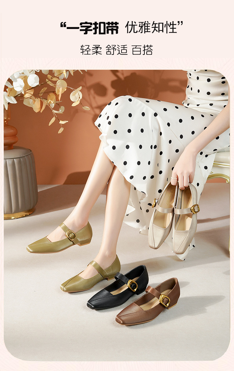 2025 봄 새 메리 제인 신발 여성 한 단어 버클 스퀘어 토 소프트 가죽 싱글 레이어 신발 레트로 로우 힐 패션 신발 멀티 컬러