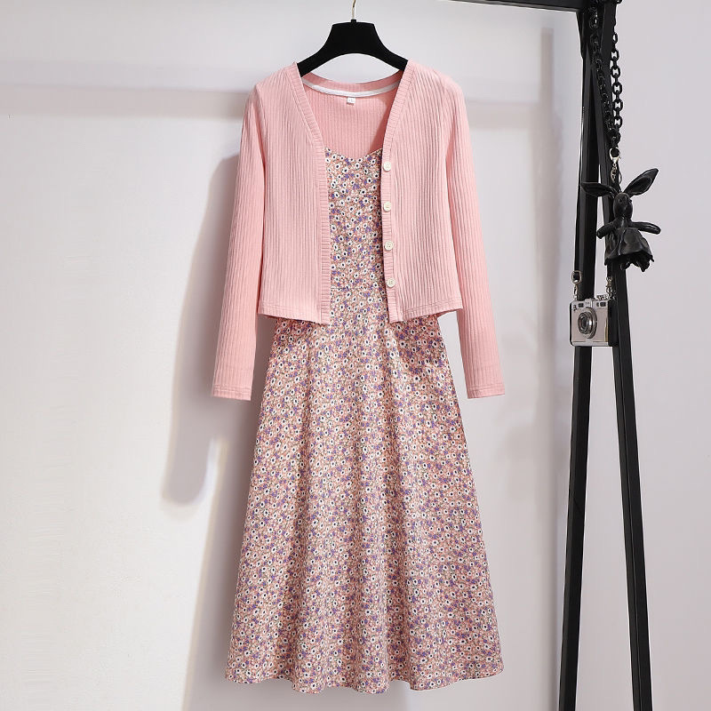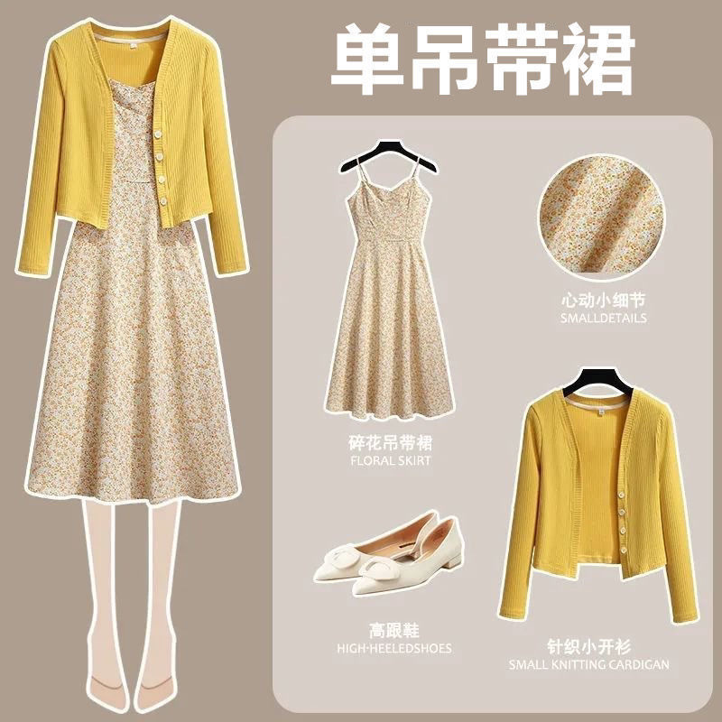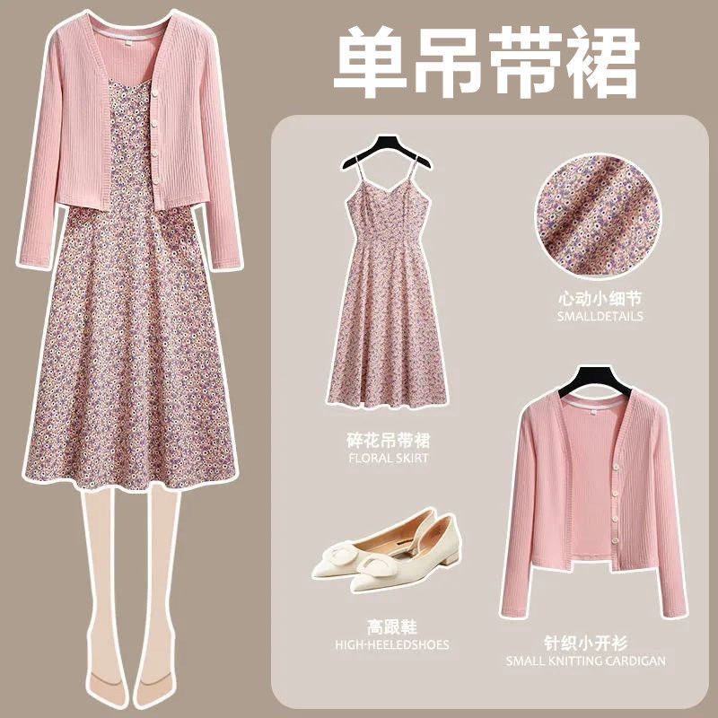 单/套装 冰丝碎花收腰吊带连衣裙2022春季新款冰丝开衫气质两件套