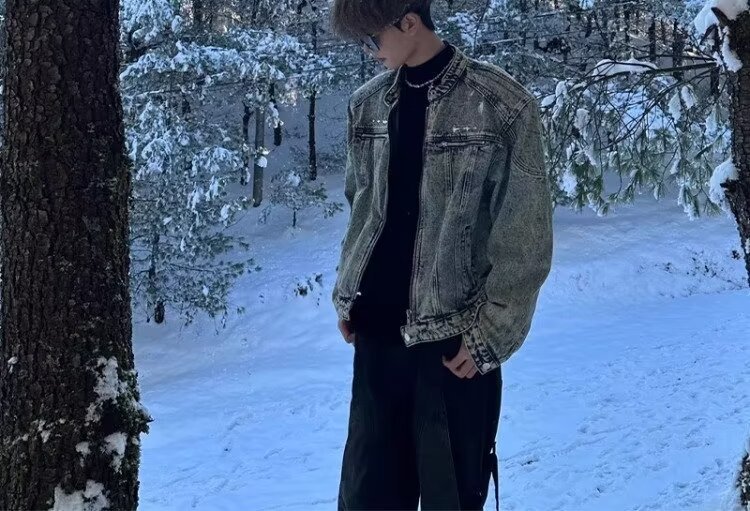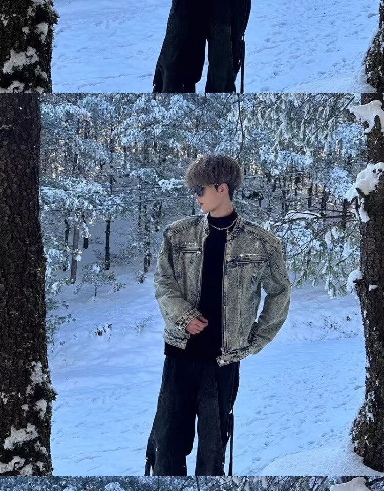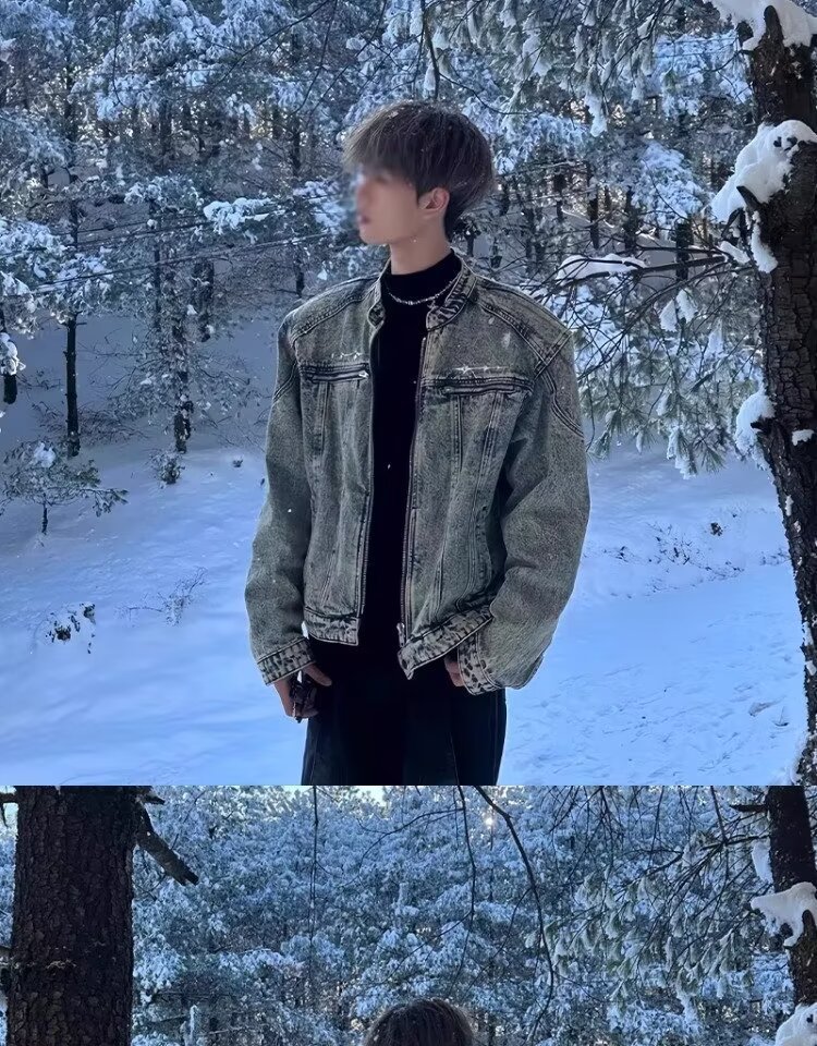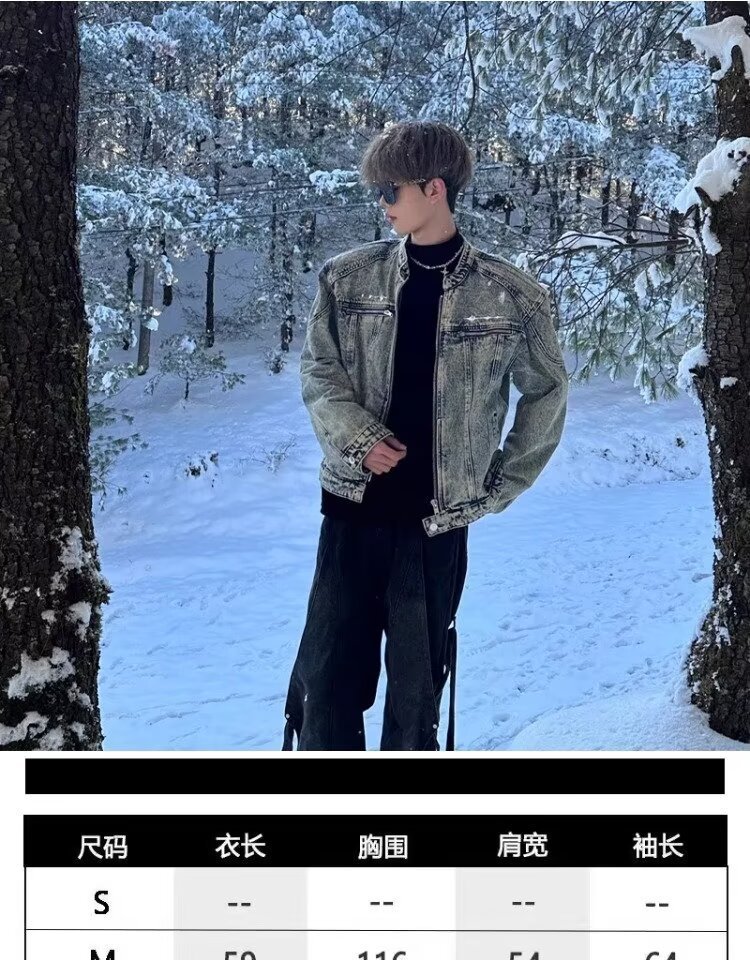 미국 스타일 레트로 오래 된 어깨 패드 짧은 스티칭 데님 재킷 트렌디 한 브랜드 금속 디자인 칼라리스 재킷스토어 가기
