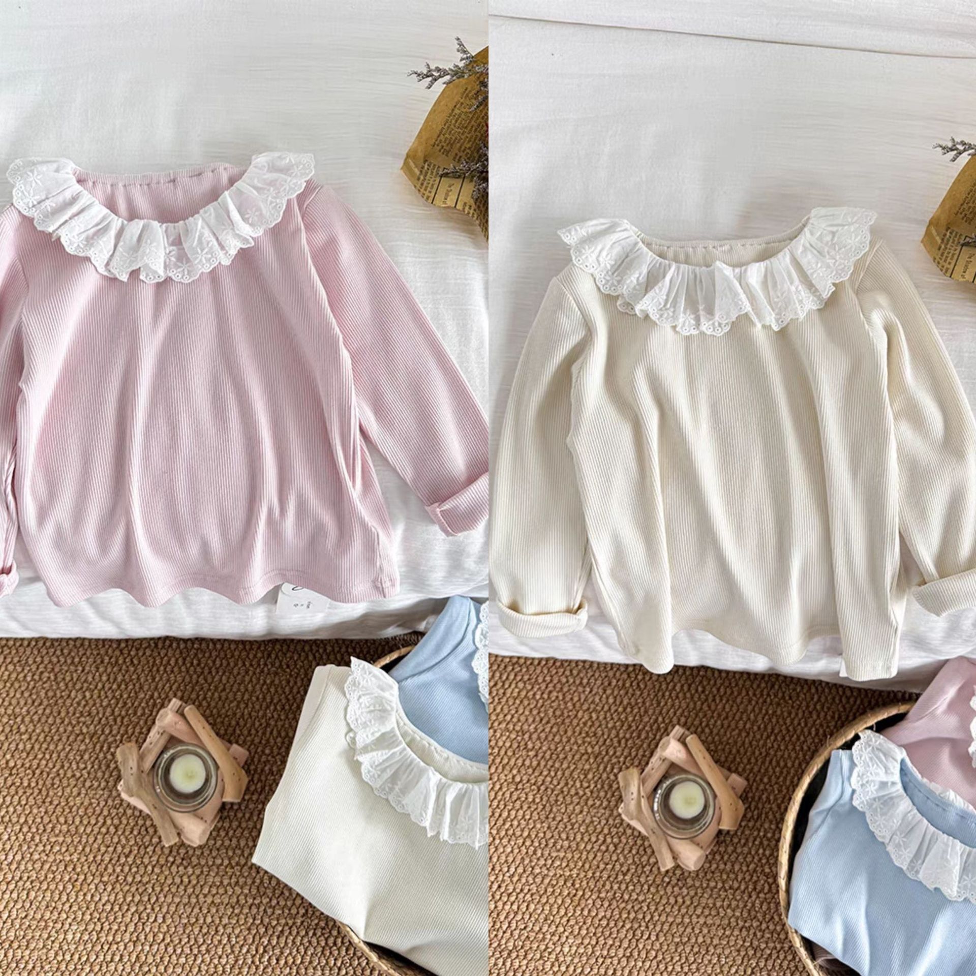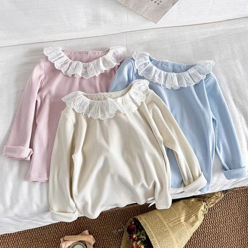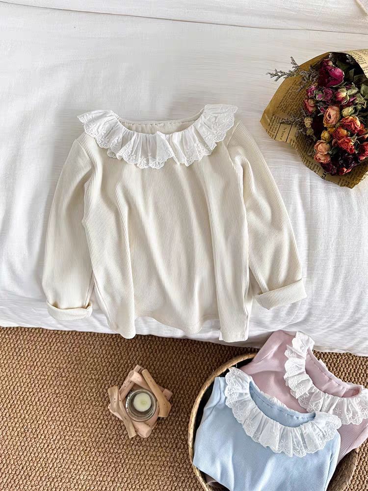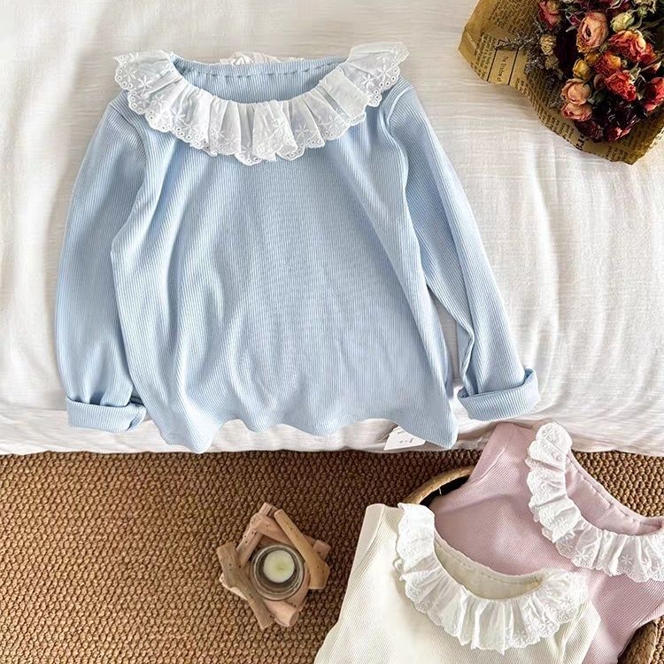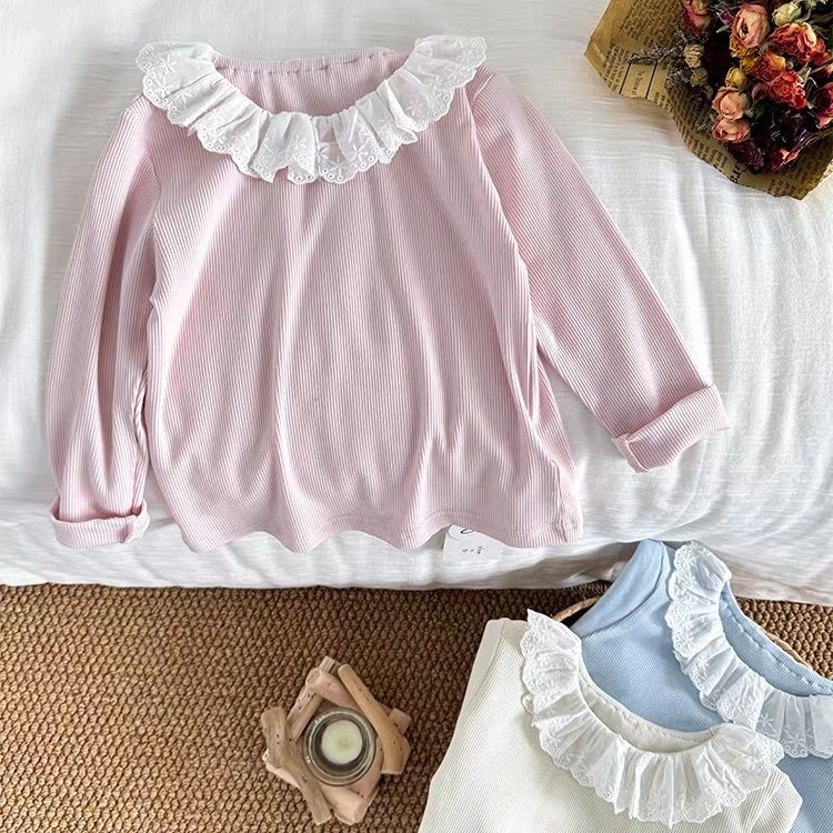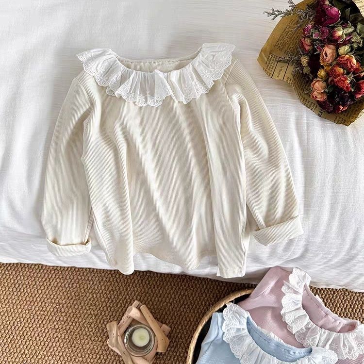 소녀 한국식 솔리드 컬러베이스 셔츠 봄과 가을 새 어린이 목가적 올매치 소프트 라운드 넥 레이스 롱 슬리브 셔츠