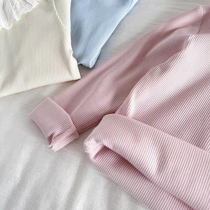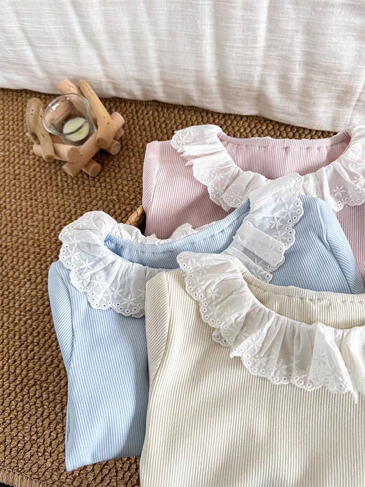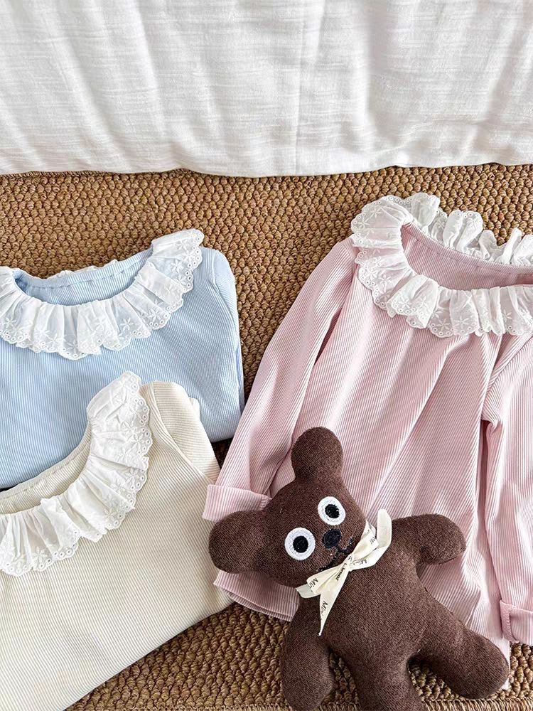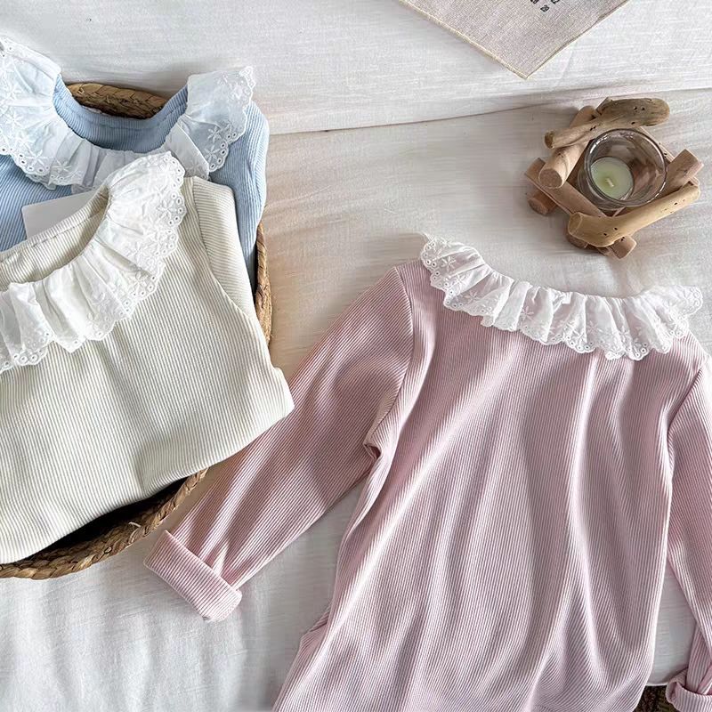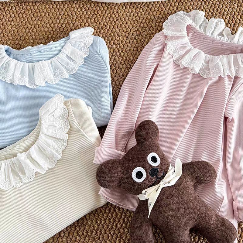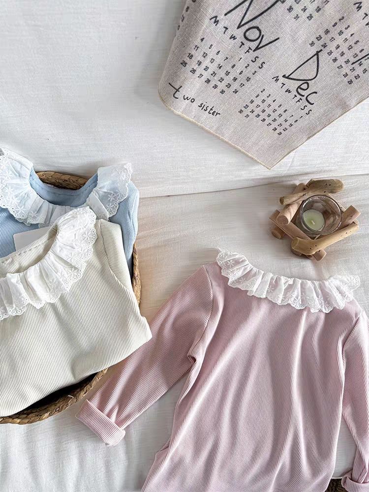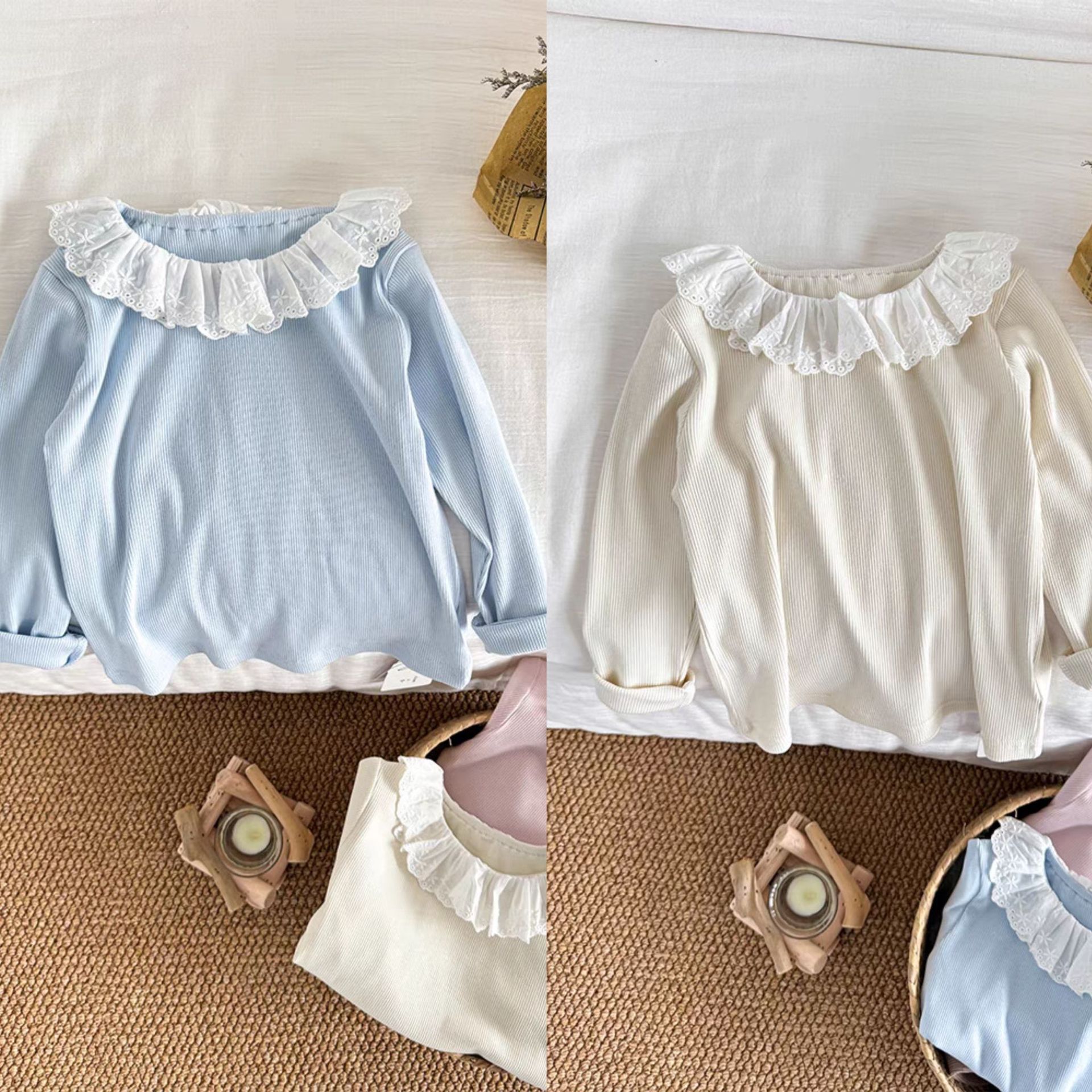 소녀 한국식 솔리드 컬러베이스 셔츠 봄과 가을 새 어린이 목가적 올매치 소프트 라운드 넥 레이스 롱 슬리브 셔츠