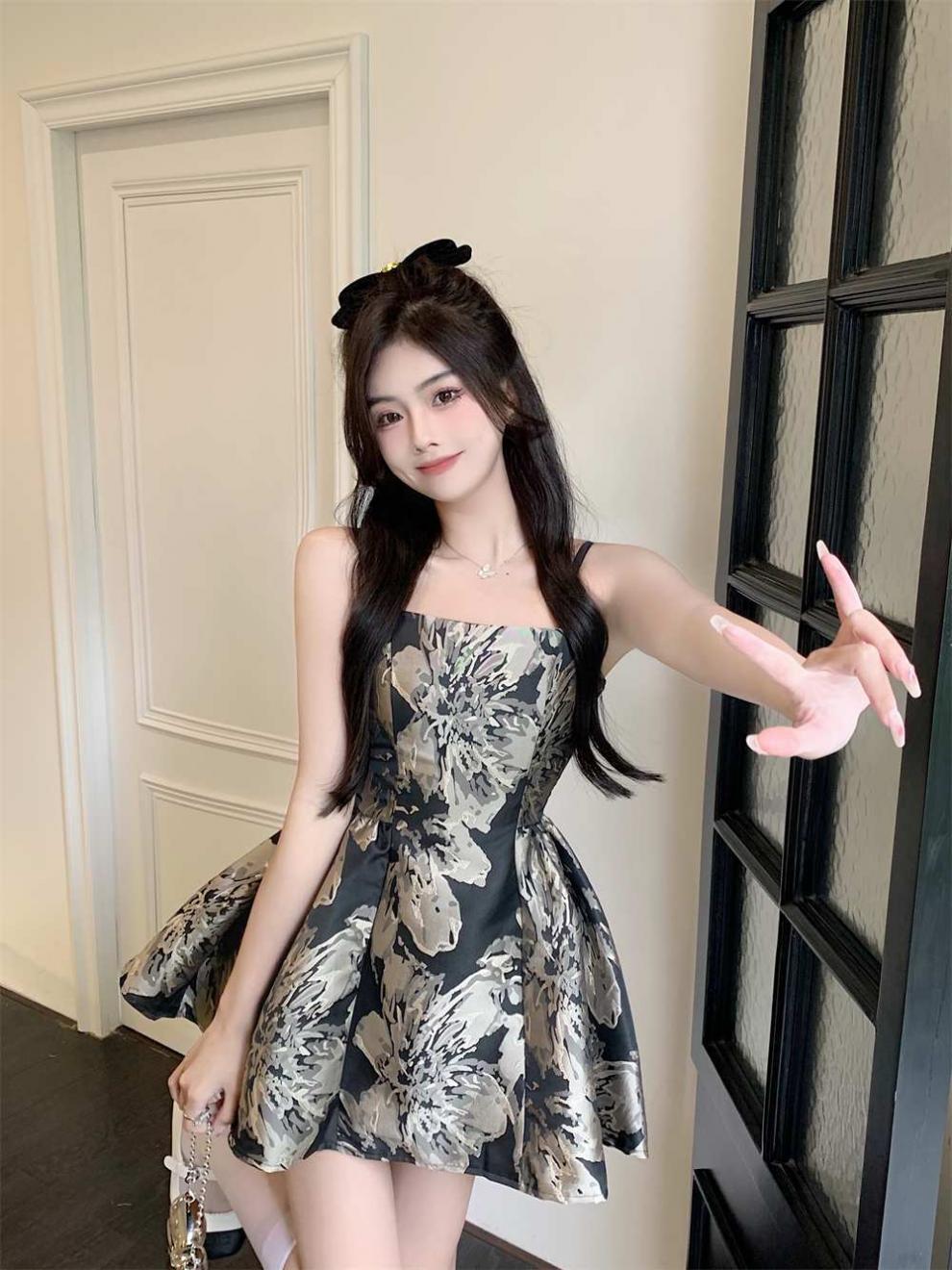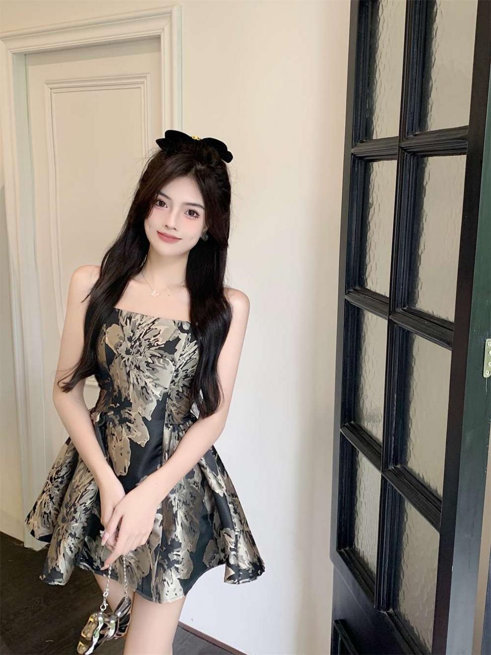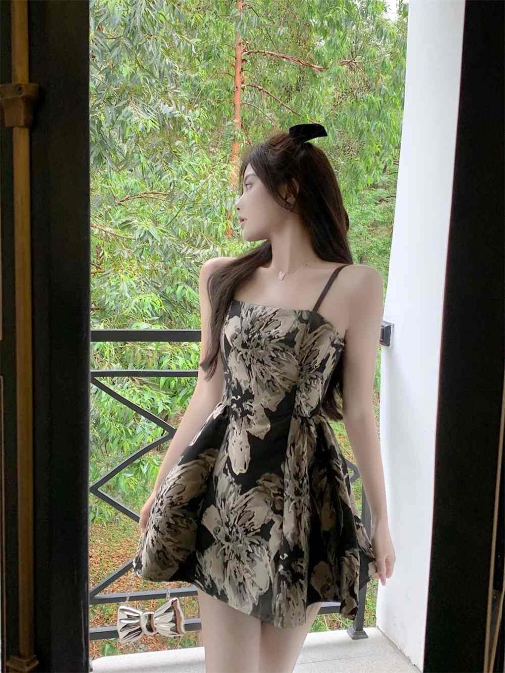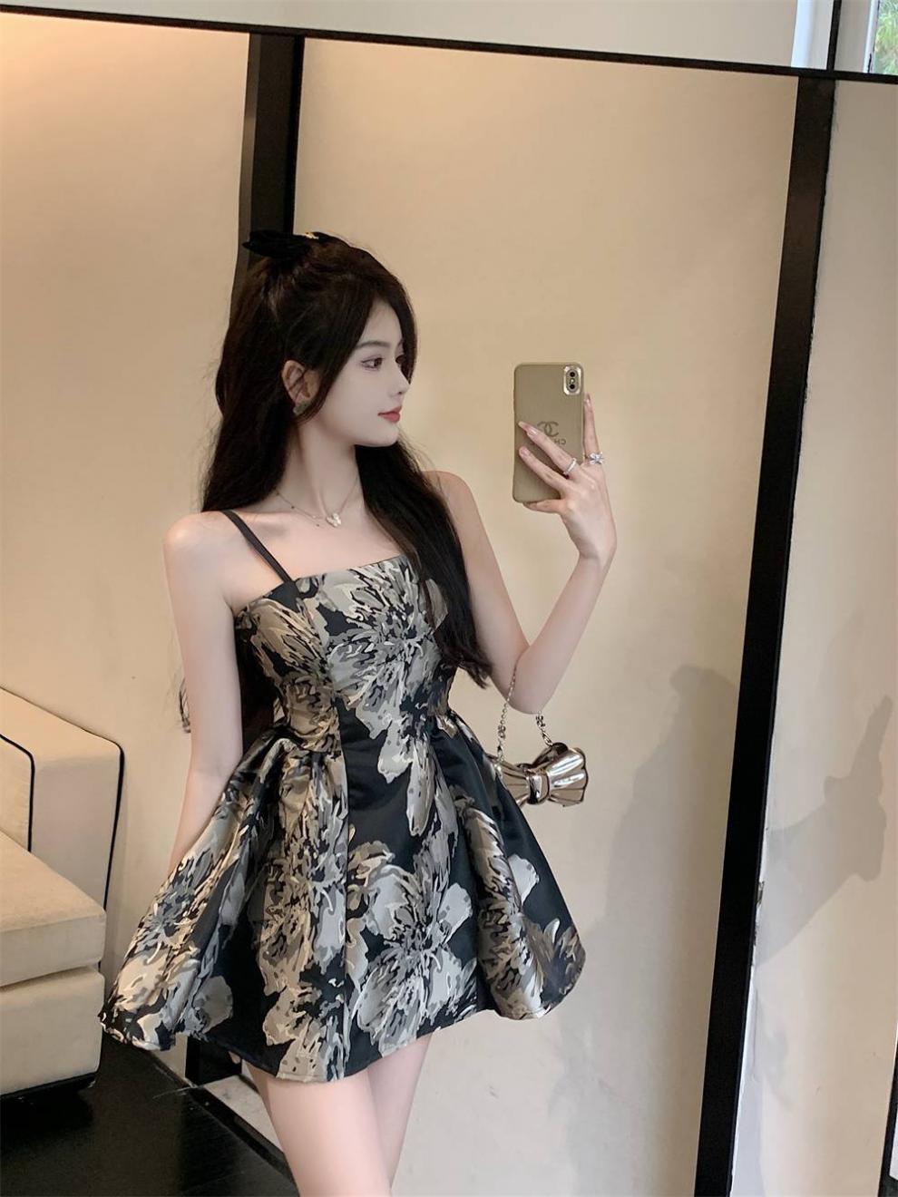 달콤한 스파이스 소녀 블랙 빈티지 자수 슬링 원피스 여성 여름 프랑스 우아한 하이 엔드 센스 A 라인 짧은 원피스