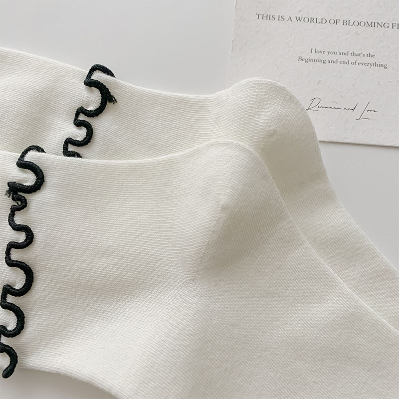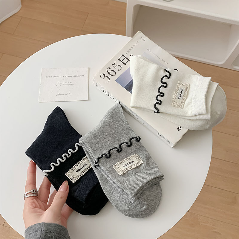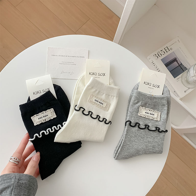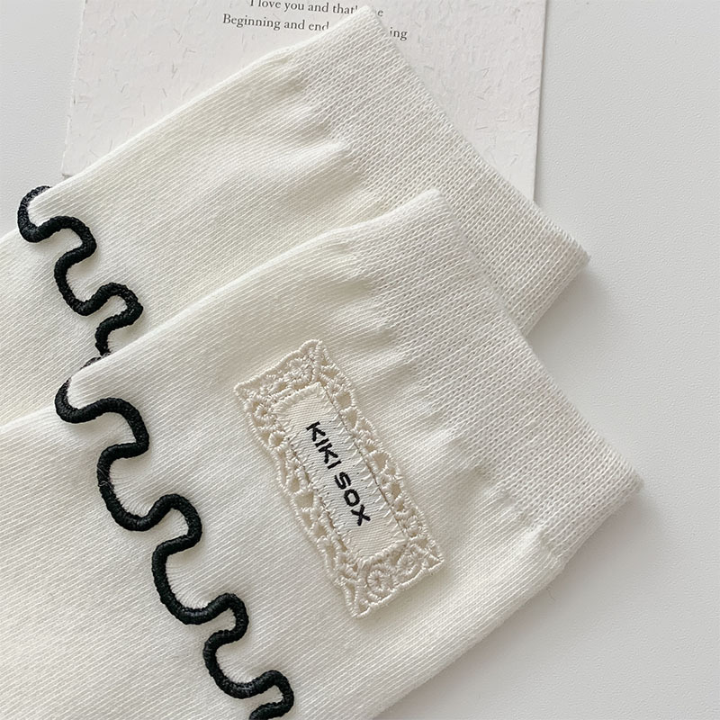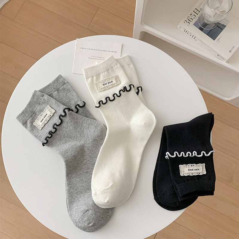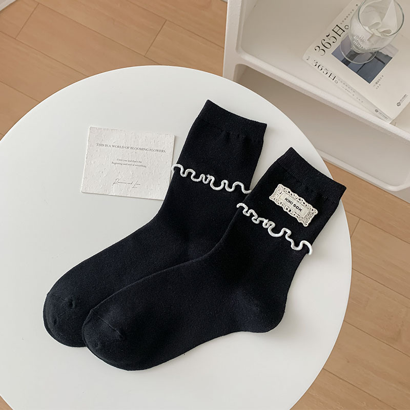 일본식 우드 이어 양말 여성 한국식 Ins 간단한 흑백 중간 길이 양말 봄과 여름을위한 모든 경기 천 라벨 스타킹