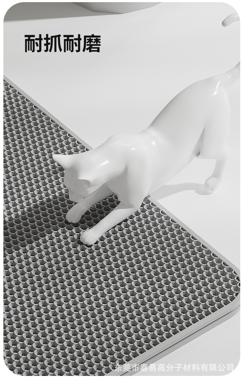 产品功能:适用95%以上种类的猫砂,上层通孔材料,猫砂可轻易通过,下层防水材质,猫砂、小便等脏物可聚集于此。猫砂垫为上下双层设计:上层采用六角形的洞孔凹凸设计,除了让猫砂落入后不再溅出外,圆球型的柔滑触感也可以避免猫咪抓坏,下层垫密封专门存放猫砂,底部设计成规则性的圆孔,有效防滑避免横冲直撞的猫咪滑到受伤。
