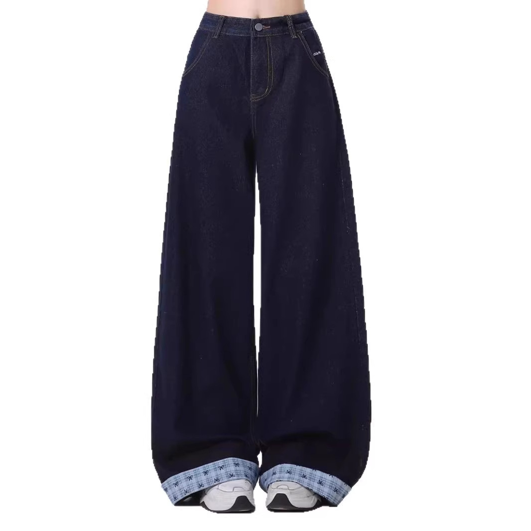 미국 스타일 복고풍 격자 무늬 청바지 여성용 봄과 가을 디자인 활 바지 느슨한 넓은 다리 바지