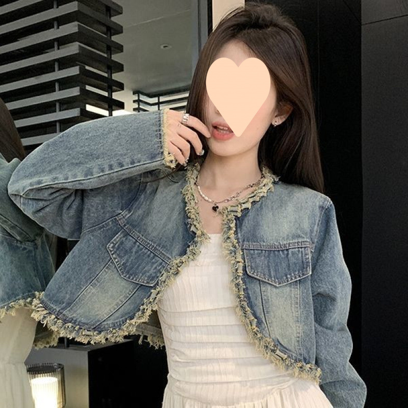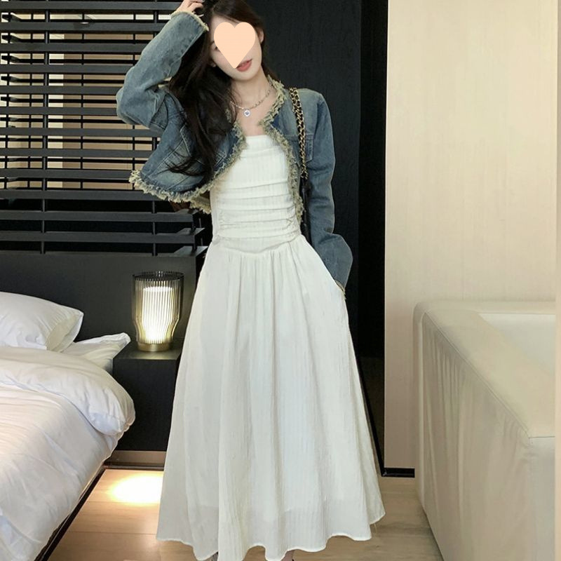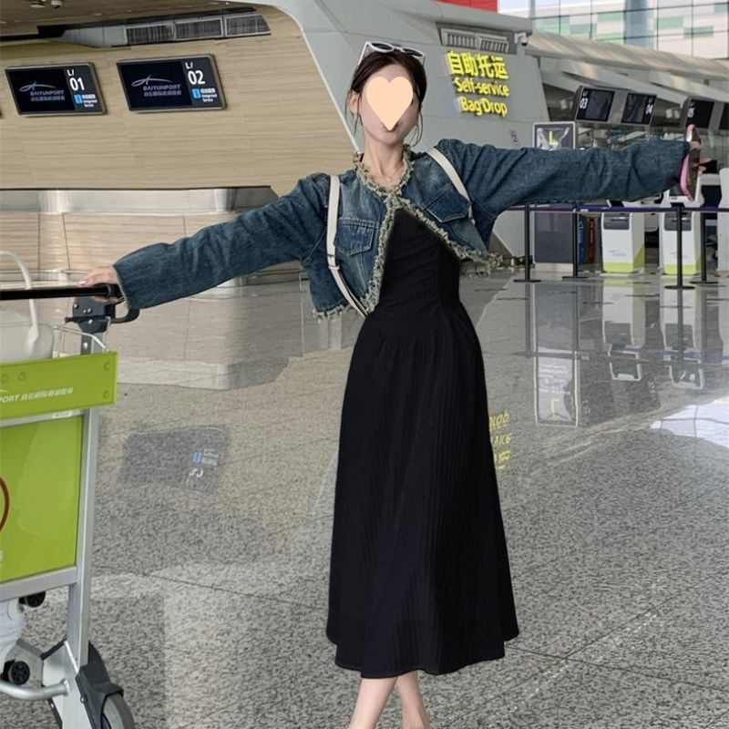 2024 새로운 빈티지 짧은 거친 긴 소매 데님 코트 튜브 탑 원피스 원피스 여성 봄 패션 세트스토어 가기