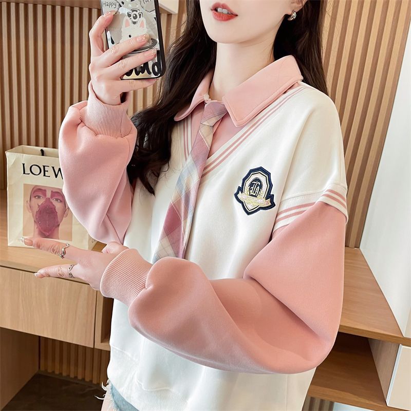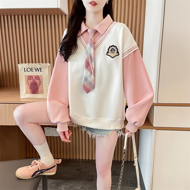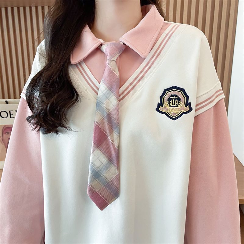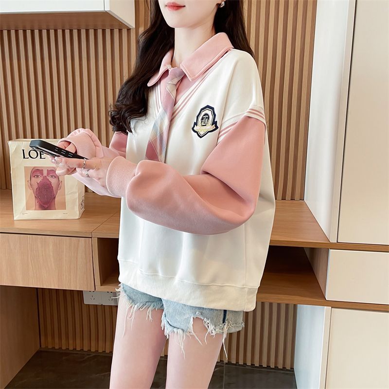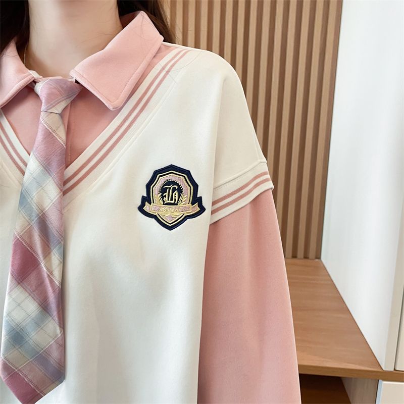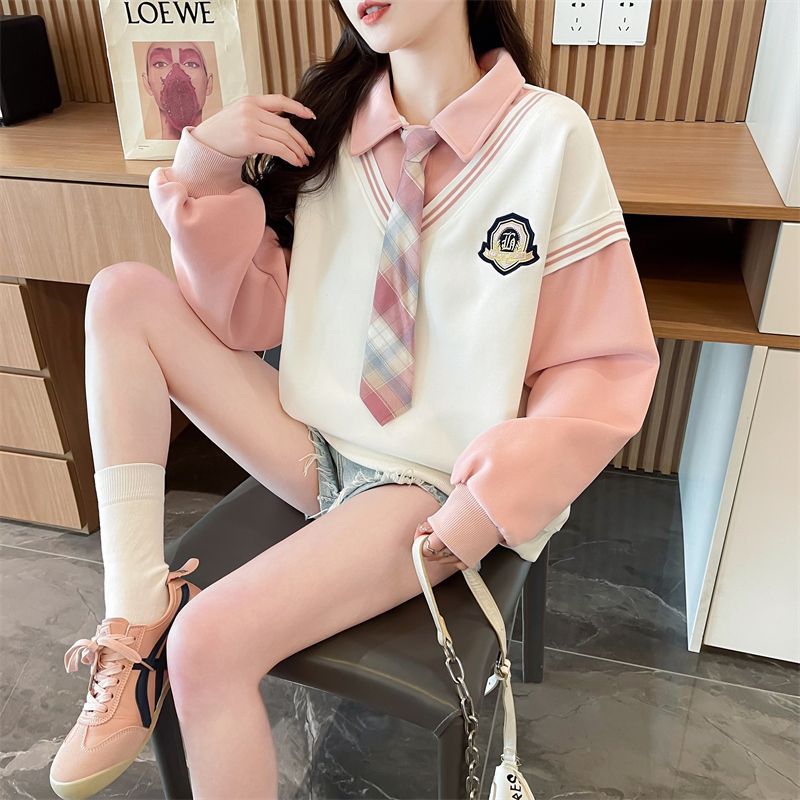 가짜 투피스 옷깃 스웨터 여성의 봄과 가을 얇은 하이 엔드 감각 격자 무늬 넥타이 스티칭 폴로 셔츠 아카데믹 스타일 탑스토어 가기