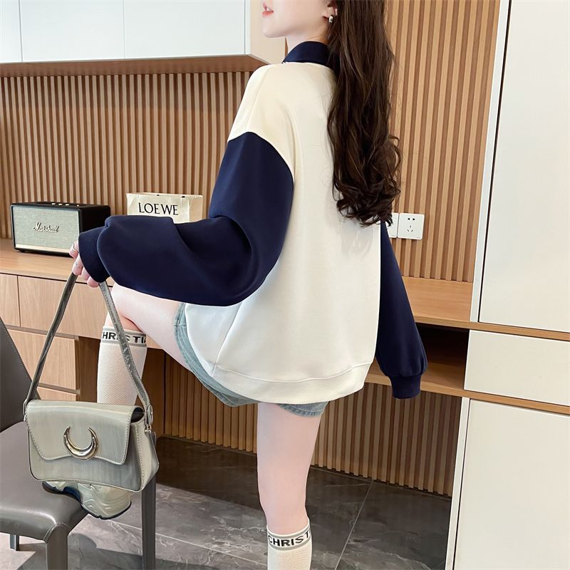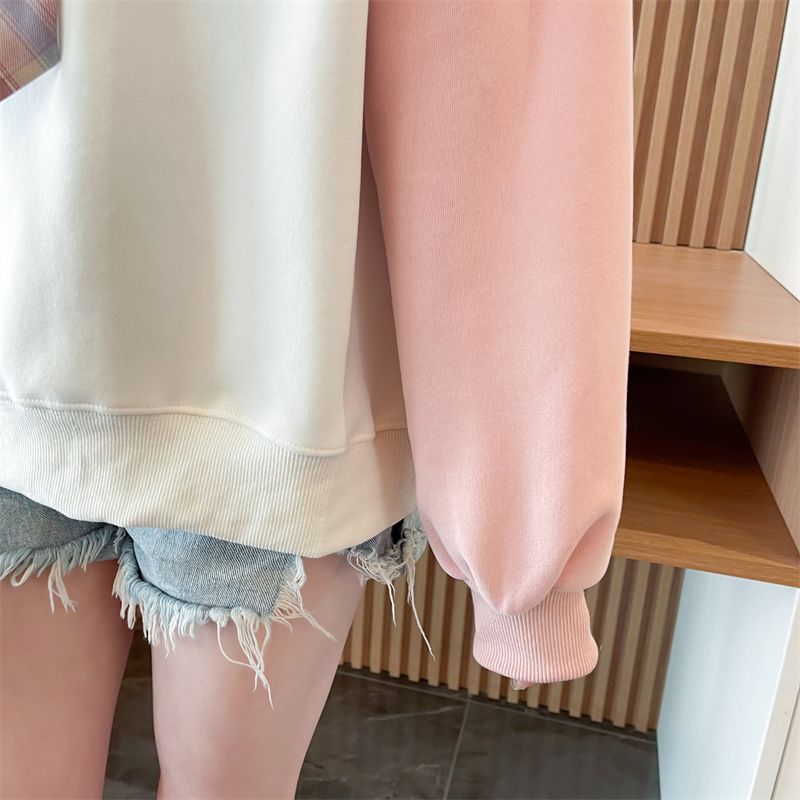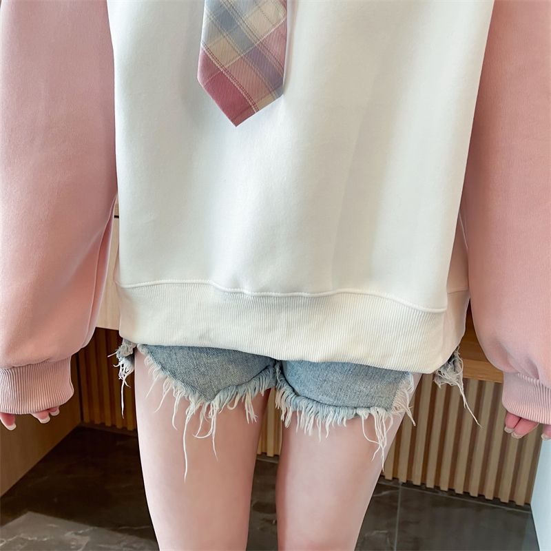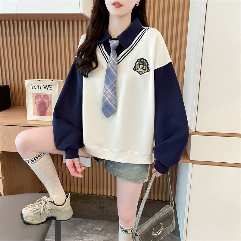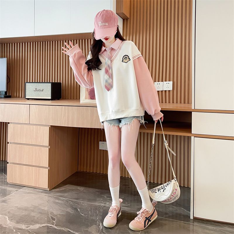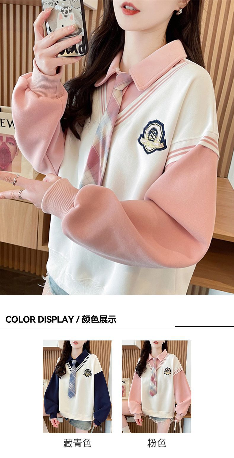 가짜 투피스 옷깃 스웨터 여성의 봄과 가을 얇은 하이 엔드 감각 격자 무늬 넥타이 스티칭 폴로 셔츠 아카데믹 스타일 탑스토어 가기