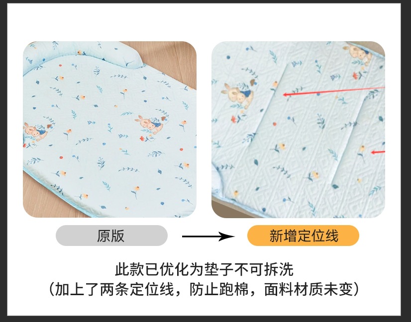 因客户反馈样品收到后起拱起皱明显,现改为拉链取消,垫子改为不可拆,垫子加两条定位线。面料材质未变 各位老板悉知