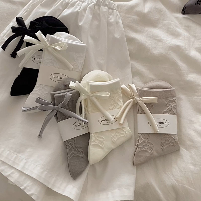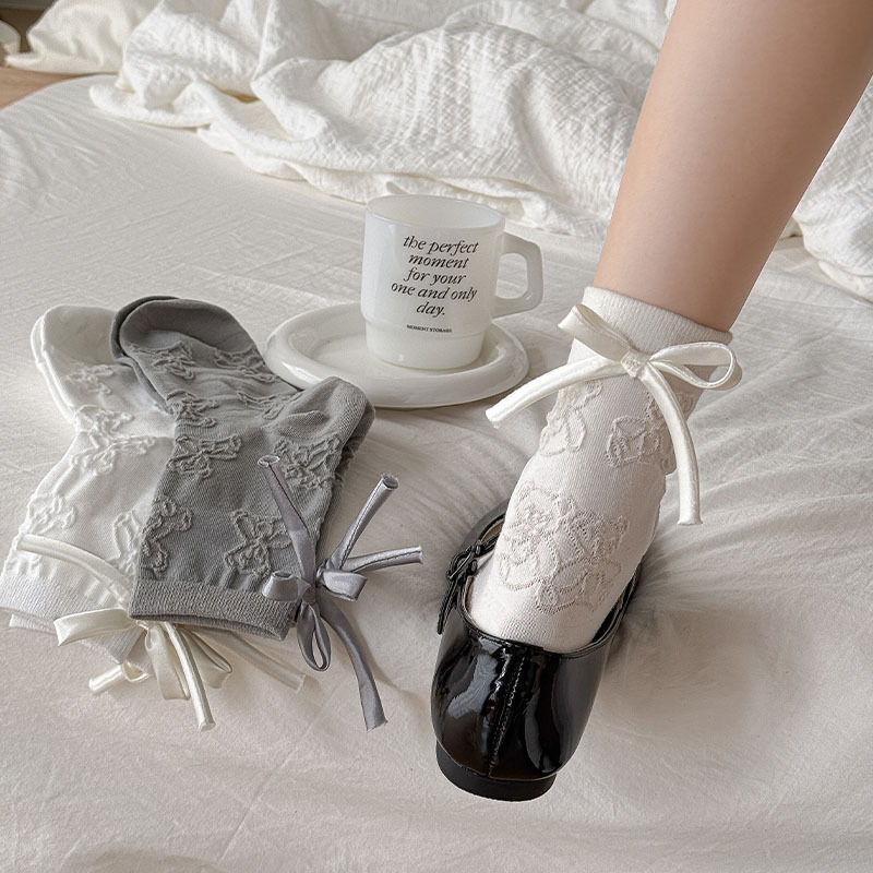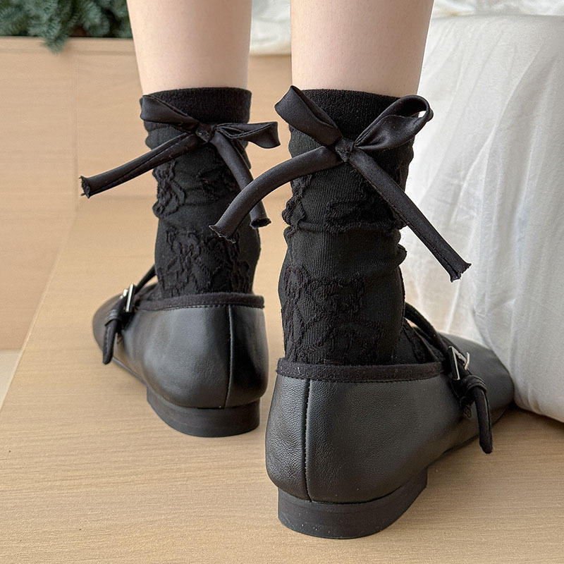발레 스타일 리본 활 양말 여성 미드 튜브 양말 봄 및 여름 의상 작은 가죽 신발 학술 스타일 JK 스택 양말