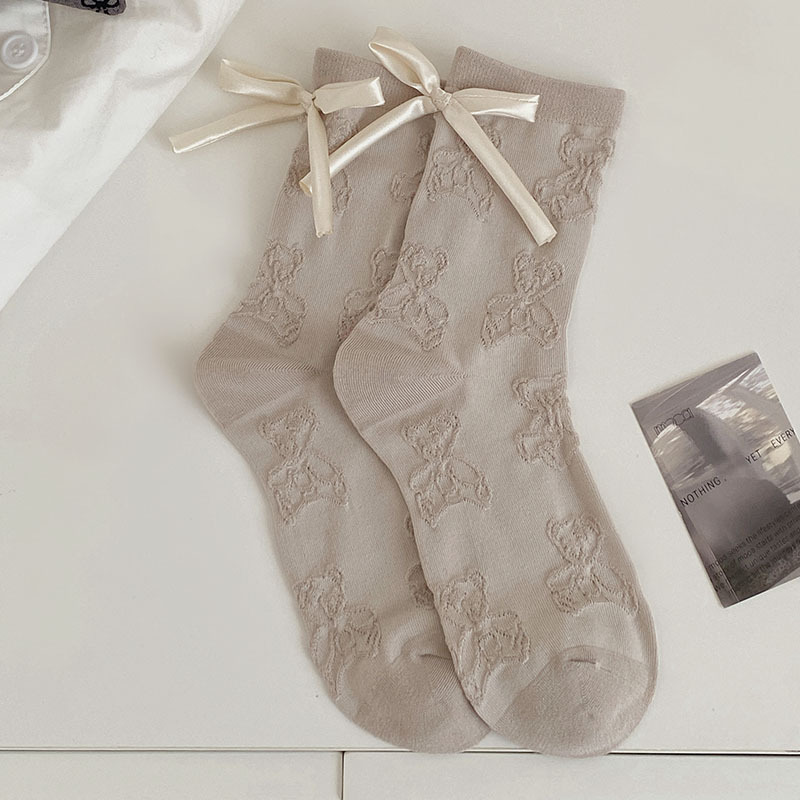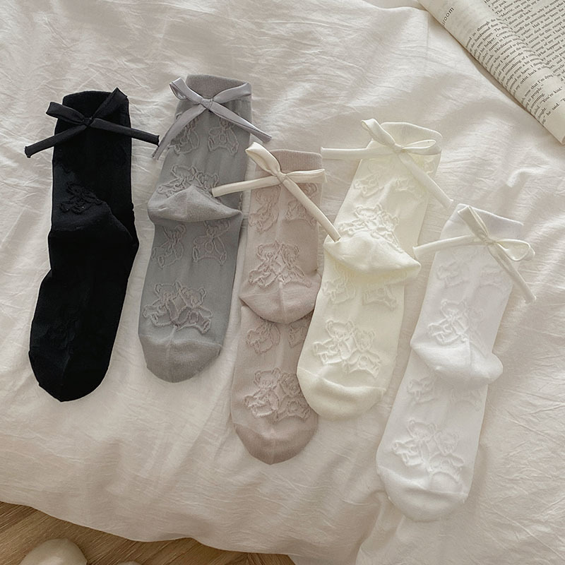 발레 스타일 리본 활 양말 여성 미드 튜브 양말 봄 및 여름 의상 작은 가죽 신발 학술 스타일 JK 스택 양말스토어 가기