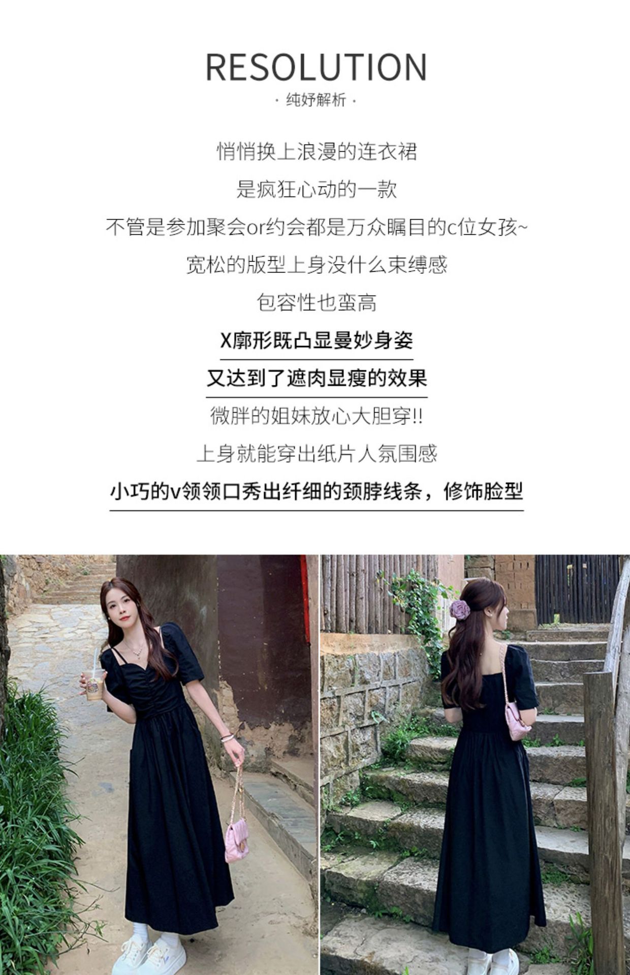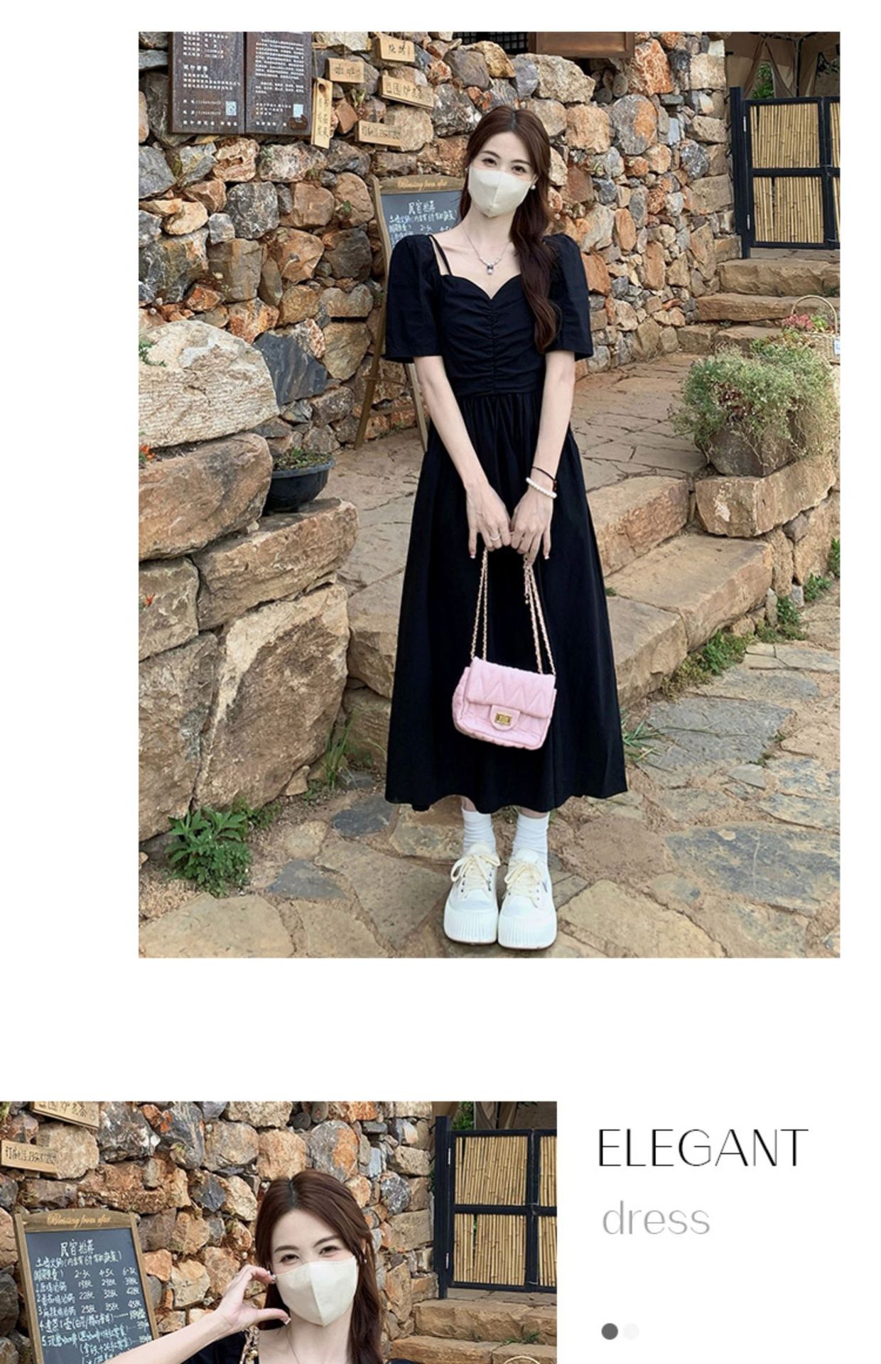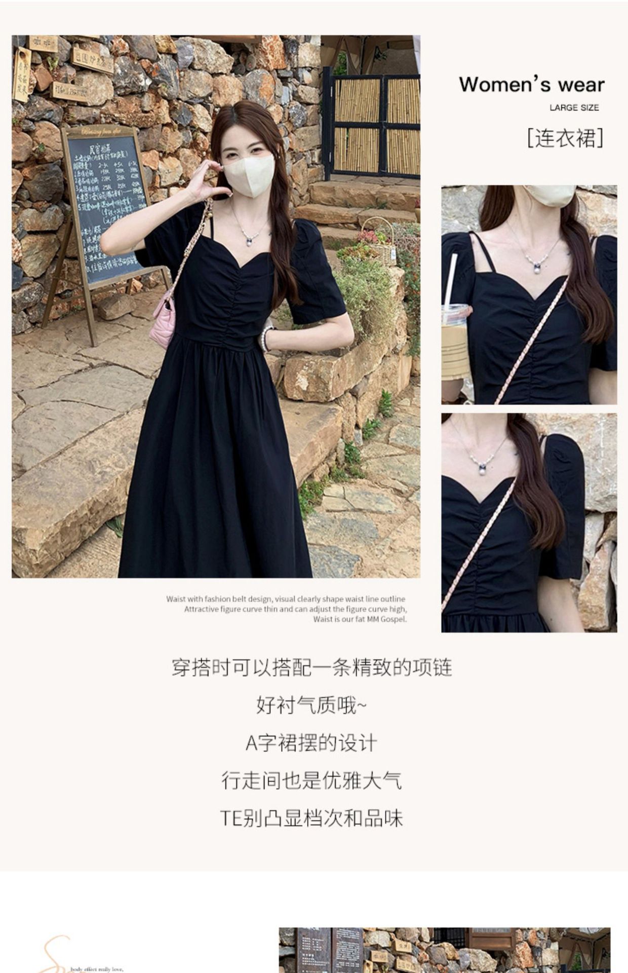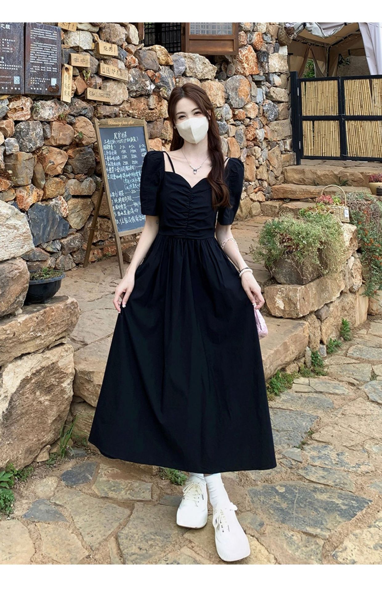 외국식 프라이드 스트리트 블랙 스퀘어 칼라 퍼프 슬리브 원피스 여성 여름 2025 새로운 프랑스 스타일 커피 브레이크 블랙 원피스 헵번 스타일